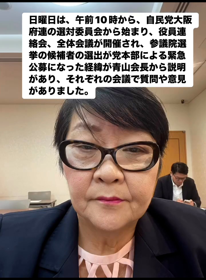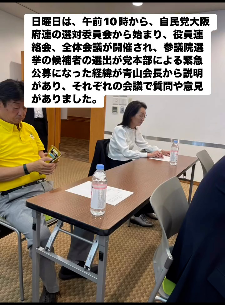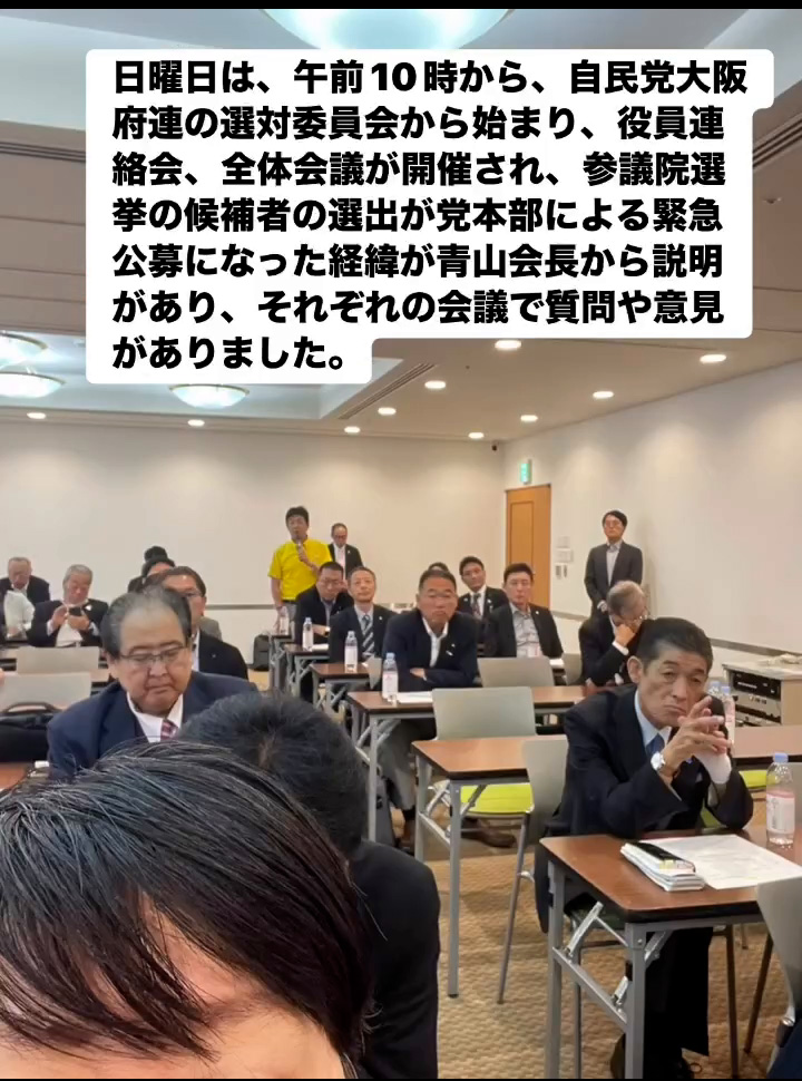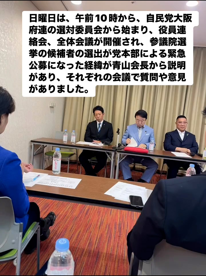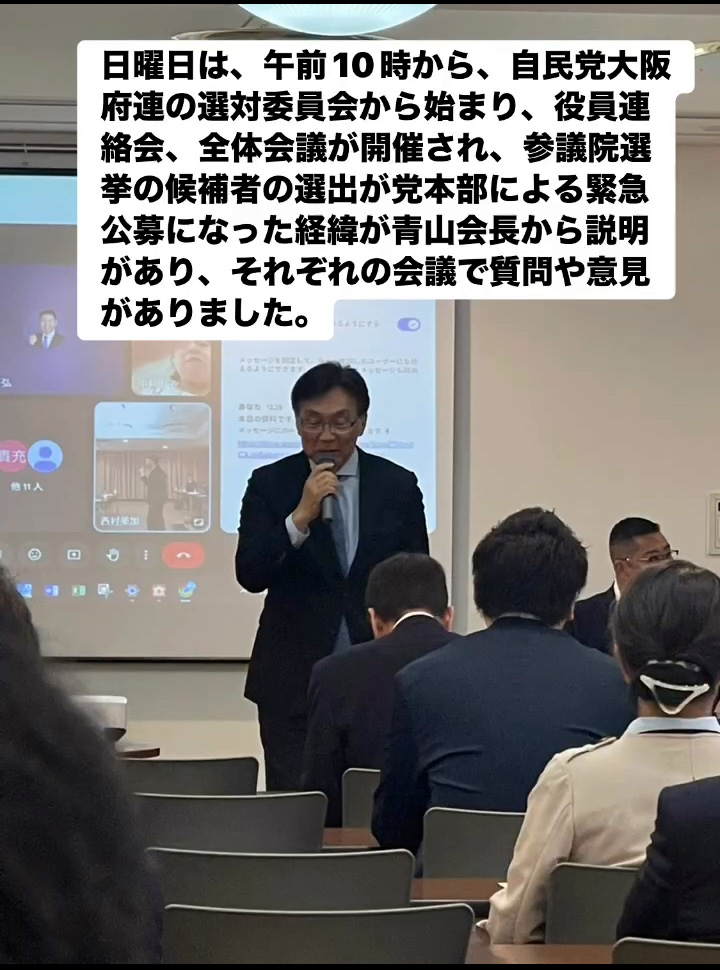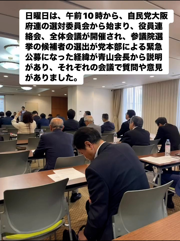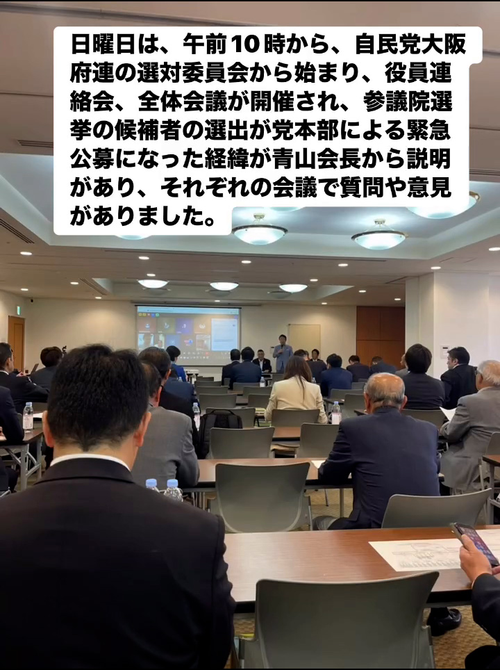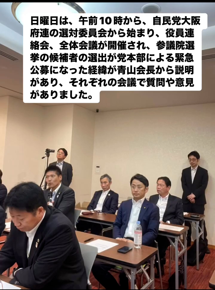 自民党大阪府連全体会議 6月3日 Posted on 2025年6月3日 07:42:262025年9月9日 日曜日は、午前10時から、 自民党大阪府運の選対委員会から始まり、 役員運絡会、 全体会議が開催され、 参議院選挙の候補者の選出が党本部による緊急公募になった経緯が青山会長から説明があり、 それぞれの会議で質問や意見がありました。 自民党大阪, 未分類