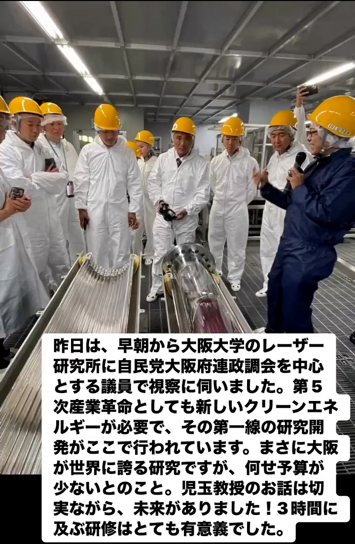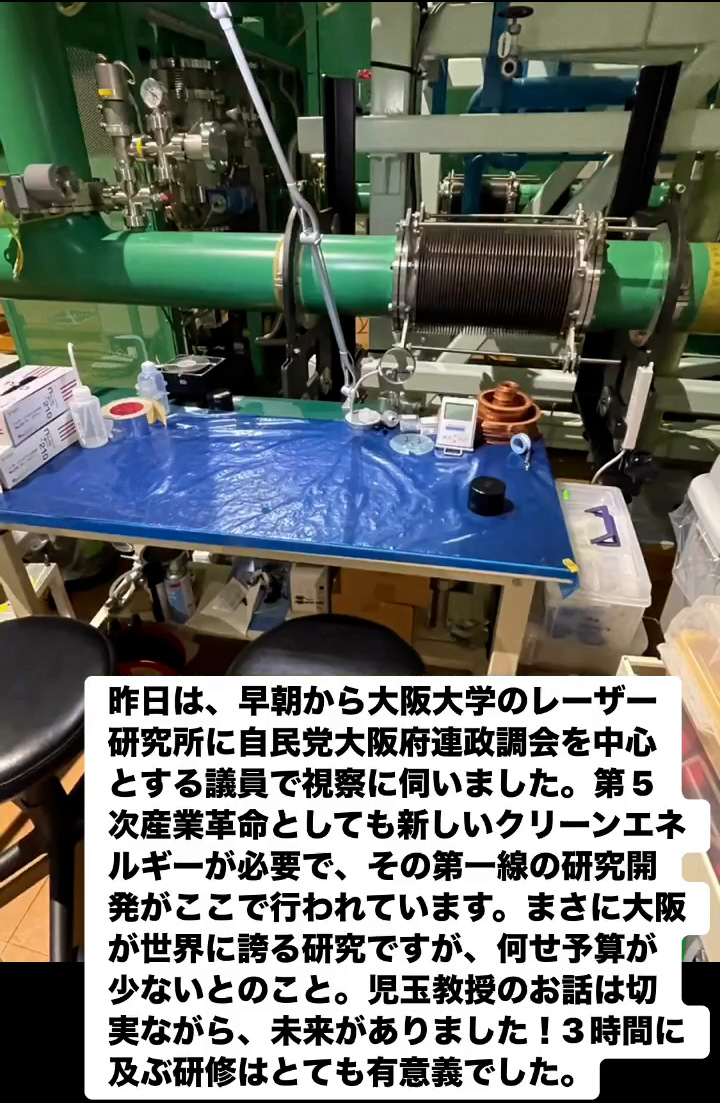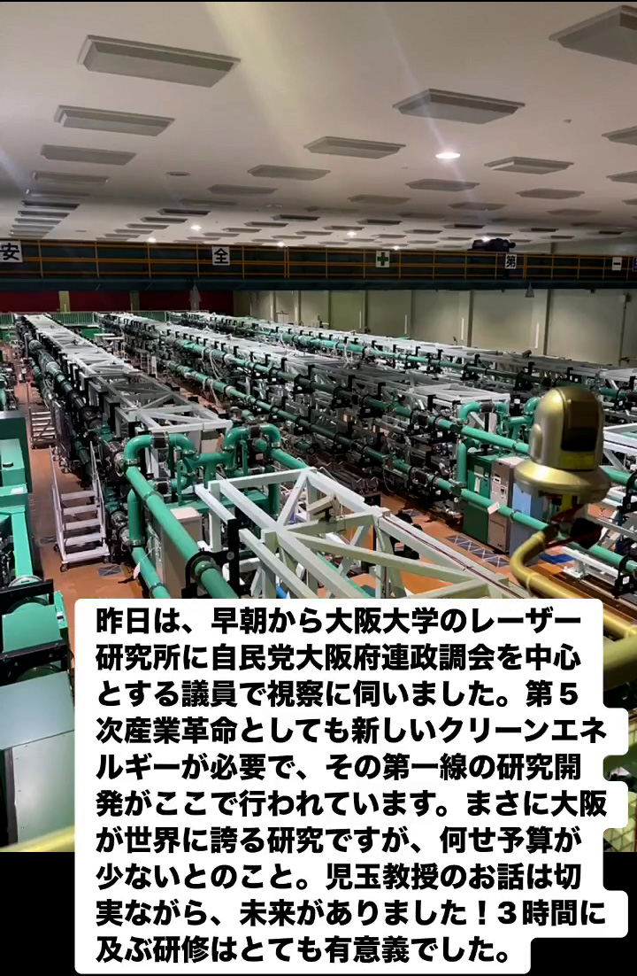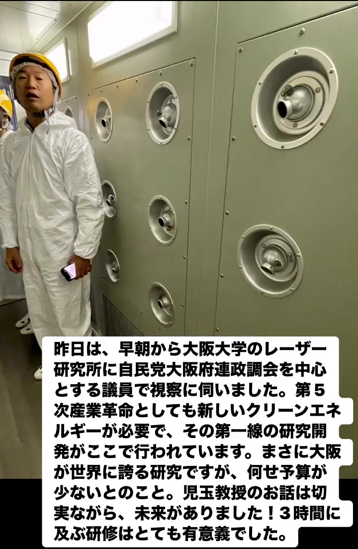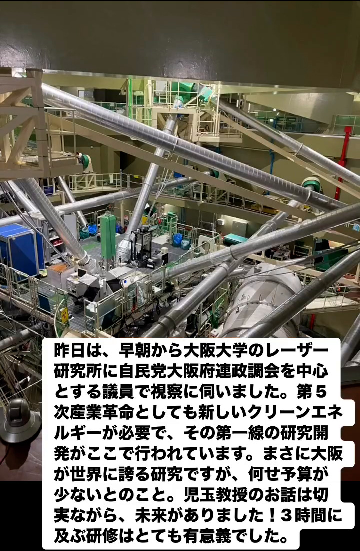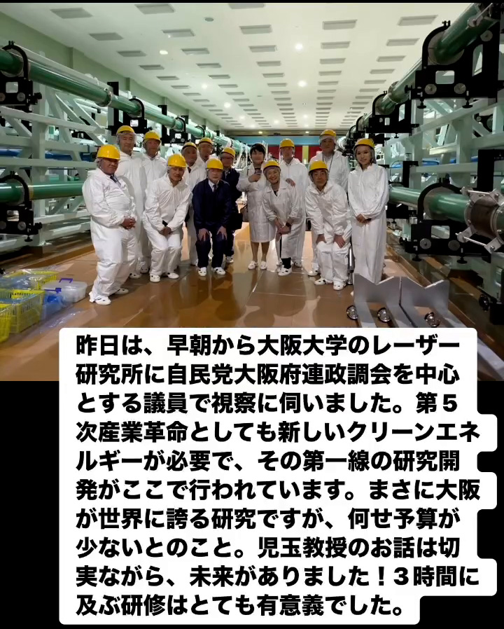昨日は、早朝から大阪大学のレーザー研究所に自民党大阪府連政調会を中心とする議員で視察に伺いました。第5次産業革命としても新しいクリーンエネルギーが必要で、その第一線の研究開発がここで行われています。まさに大阪が世界に誇る研究ですが、何せ予算が少ないとのこと。児玉教授のお語は切実ながら、未来がありました!3時間に及ぶ研修はとても有意義でした。