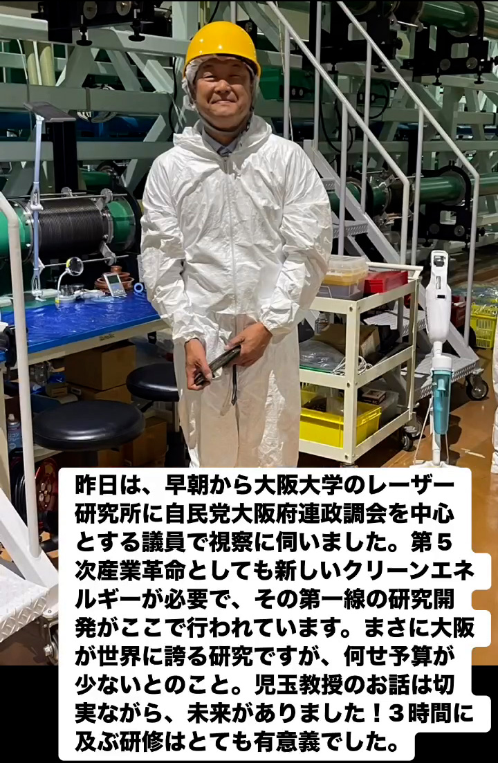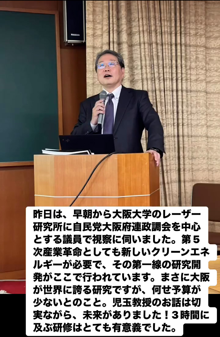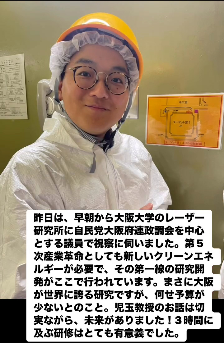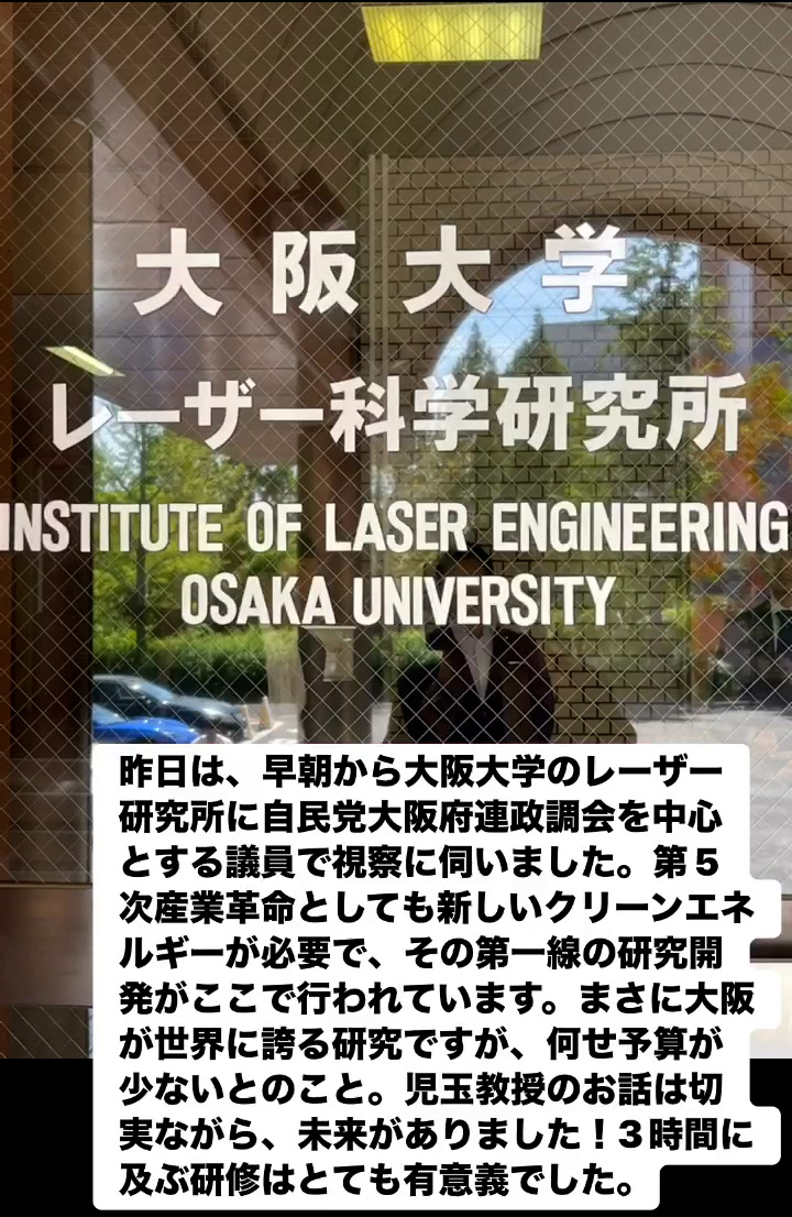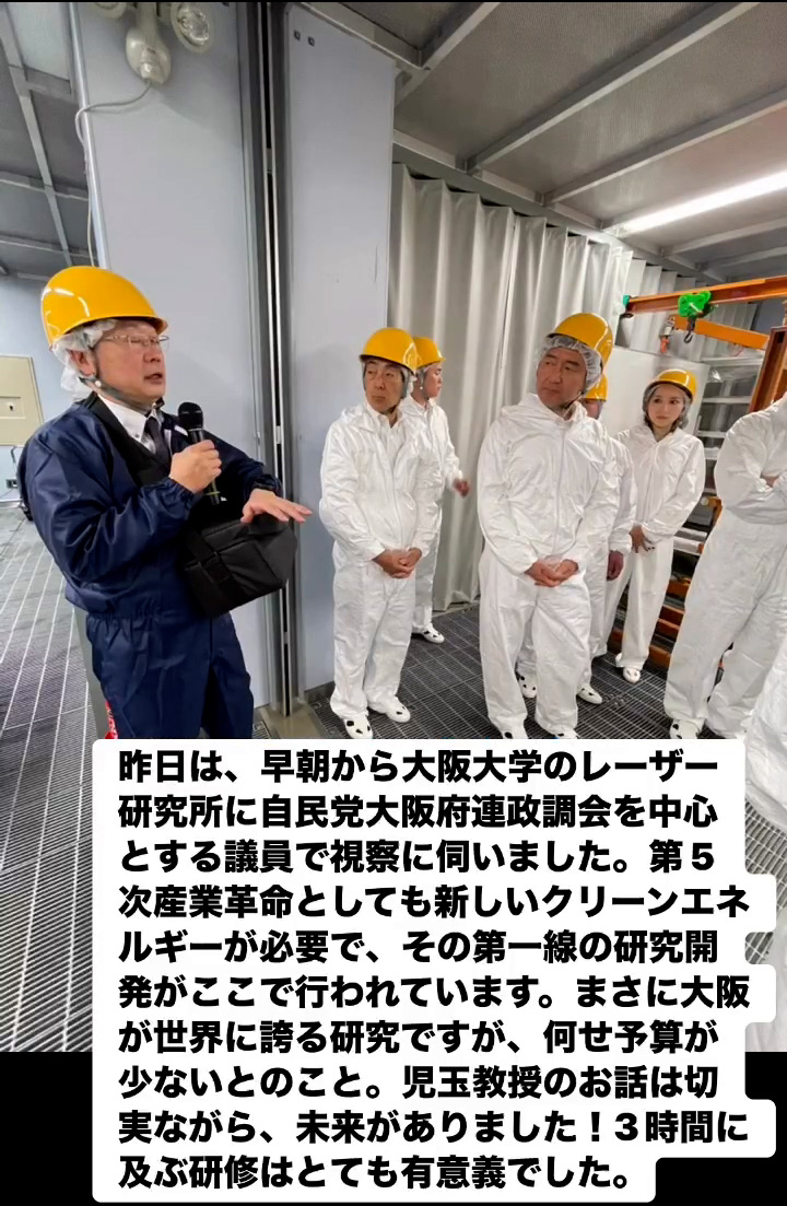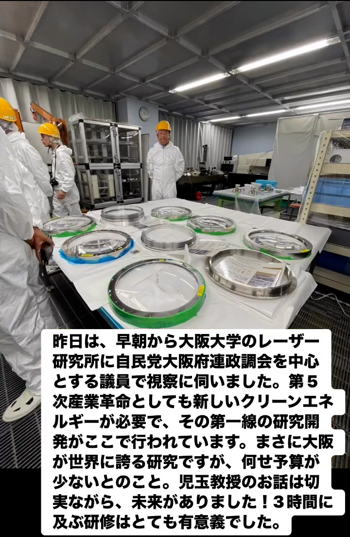 昨日は、早朝から大阪大学のレーザー研究所に自民党大阪府連政調会を中心とする議員で視察に伺いました。第5次産業革命としても新しいクリーンエネルギーが必要で、その第一線の研究開発がここで行われています。まさに大阪が世界に誇る研究ですが、何せ予算が少ないとのこと。児玉教授のお語は切実ながら、未来がありました!3時間に及ぶ研修はとても有意義でした。