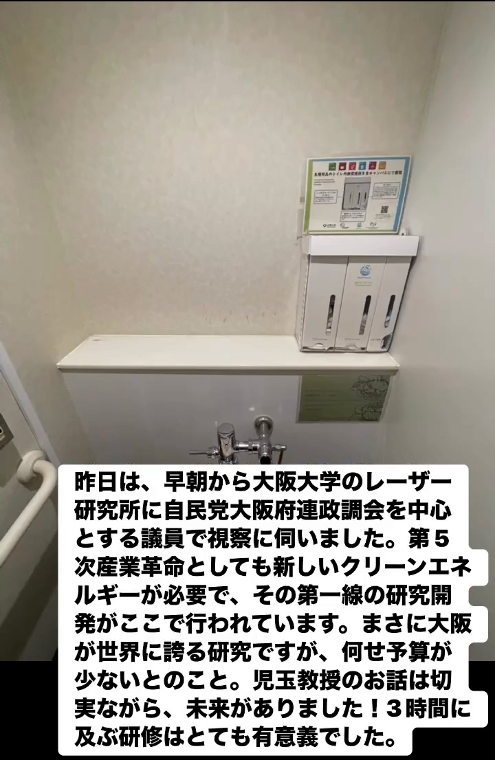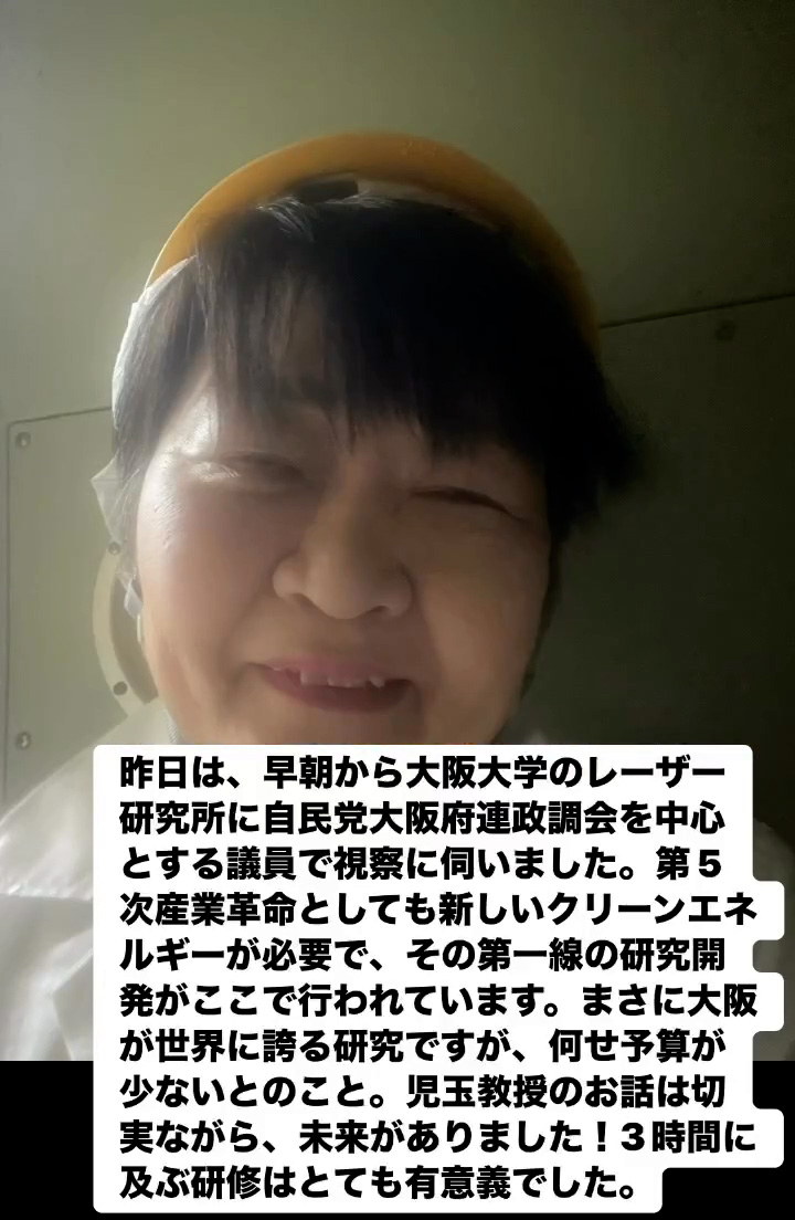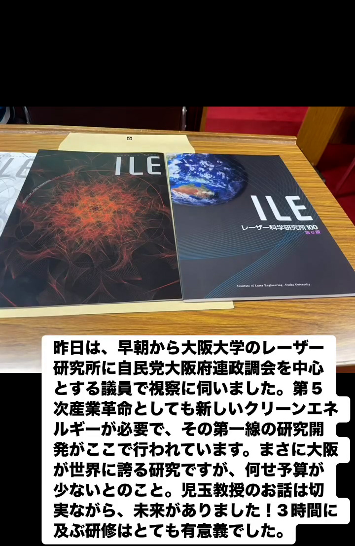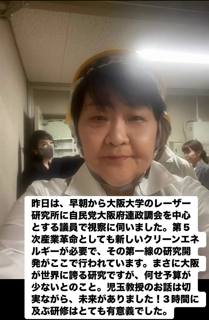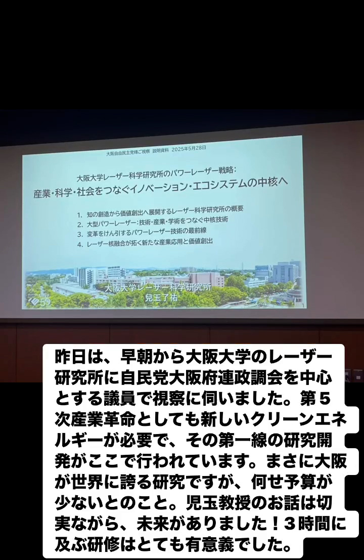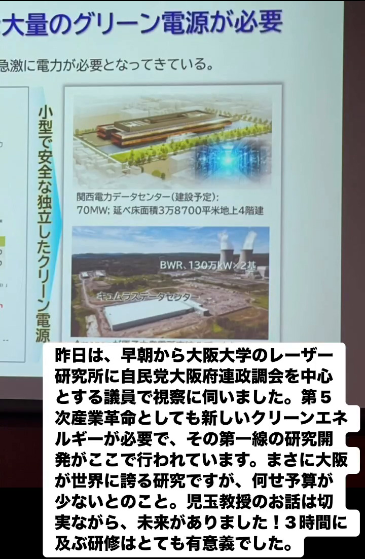 昨日は、早朝から大阪大学のレーザー研究所に自民党大阪府連政調会を中心とする議員で視察に伺いました。第5次産業革命としても新しいクリーンエネルギーが必要で、その第一線の研究開発がここで行われています。まさに大阪が世界に誇る研究ですが、何せ予算が少ないとのこと。児玉教授のお語は切実ながら、未来がありました!3時間に及ぶ研修はとても有意義でした。