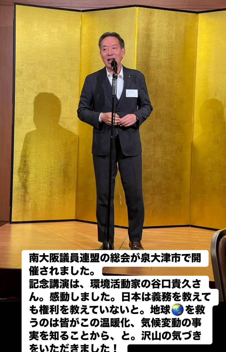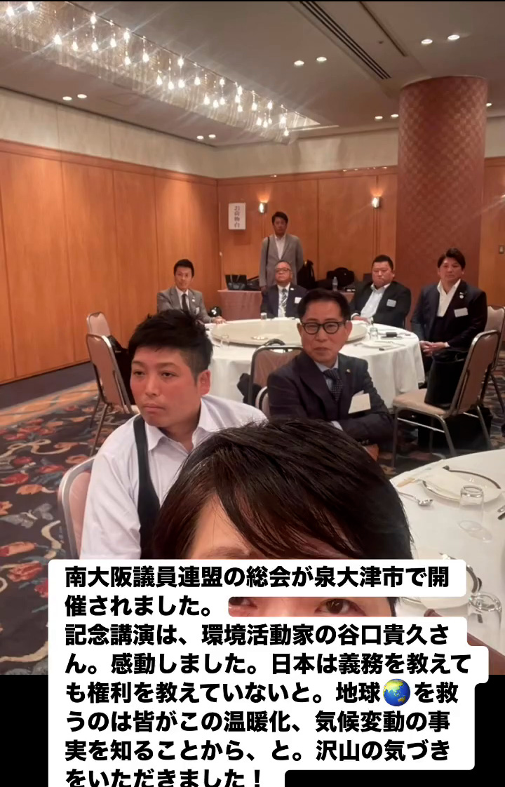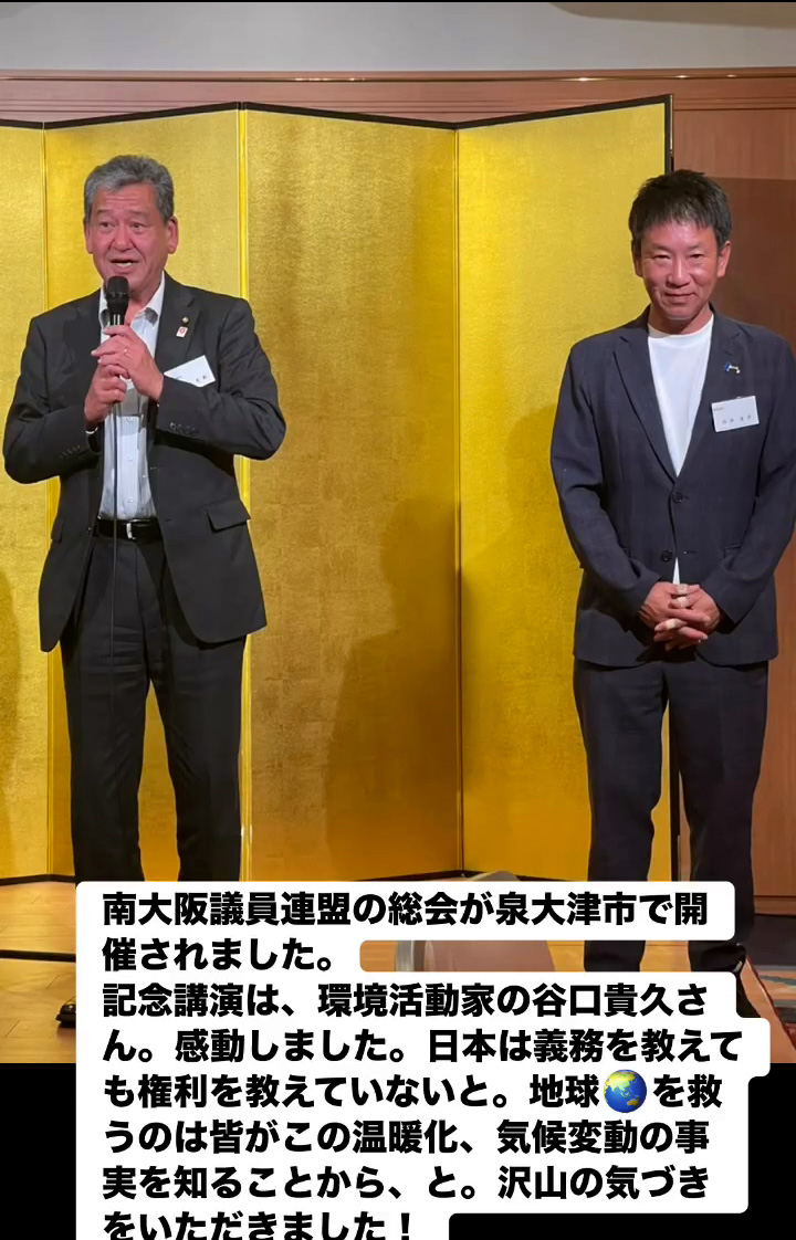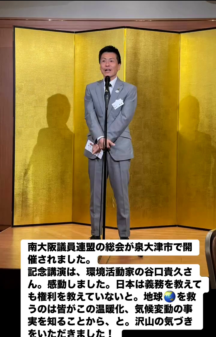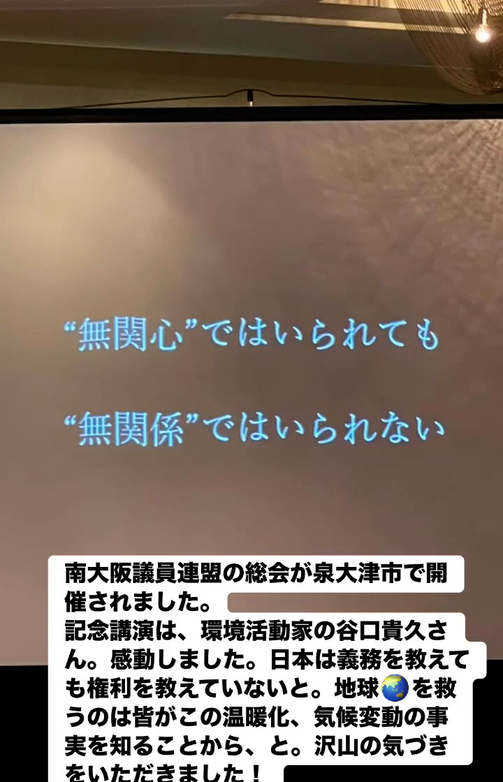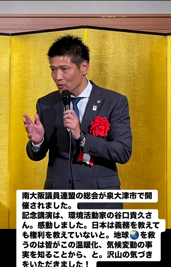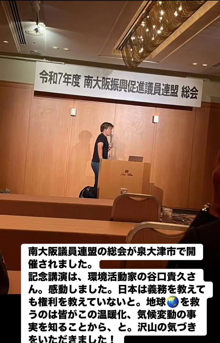南大阪議員運盟総会 5月31日 Posted on 2025年5月31日 00:00:012025年9月9日 南大阪議員運盟の総会が泉大津市で開催されました。記念講演は、環境活動家の谷口貴久さん。感動しました。 日本は義務を教えても権利を教えていないと。地球🌏️を救うのは皆がこの温暖化、気候変動の事実を知ることから、と。沢山の気づきをいただきました! のりこの活動日記
