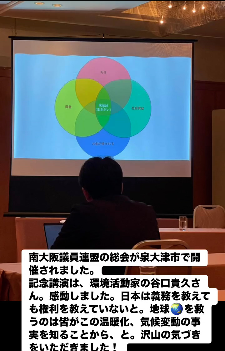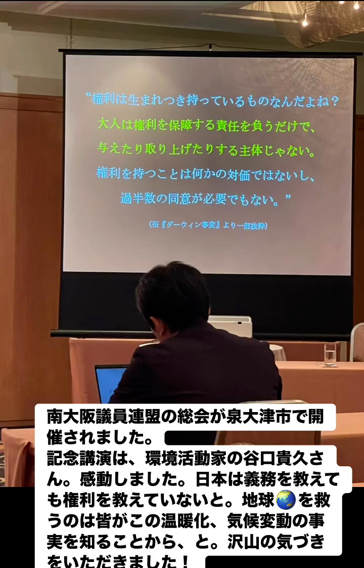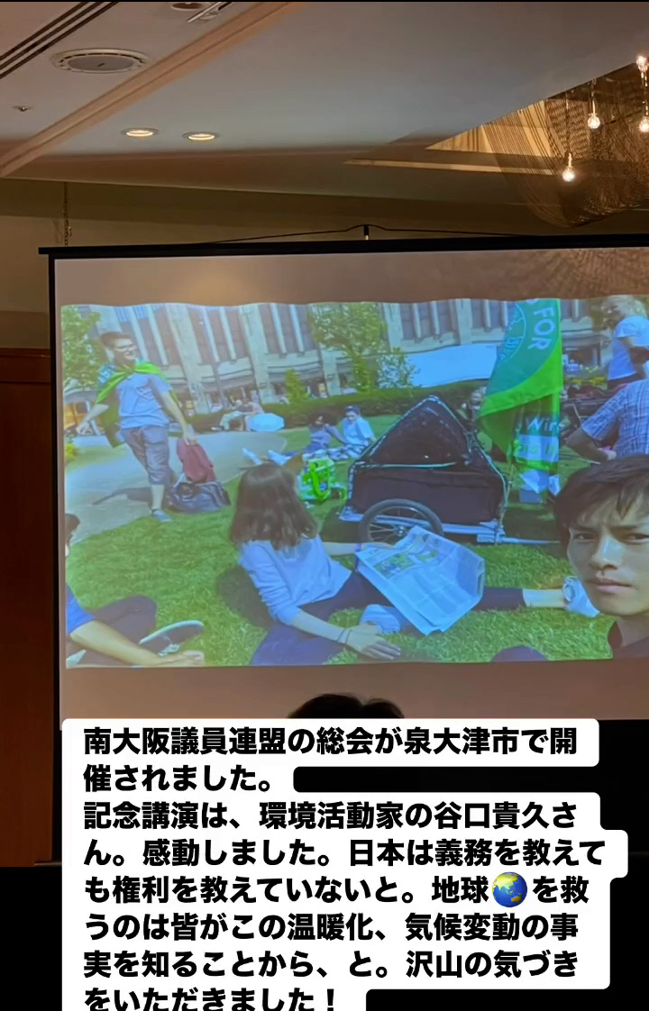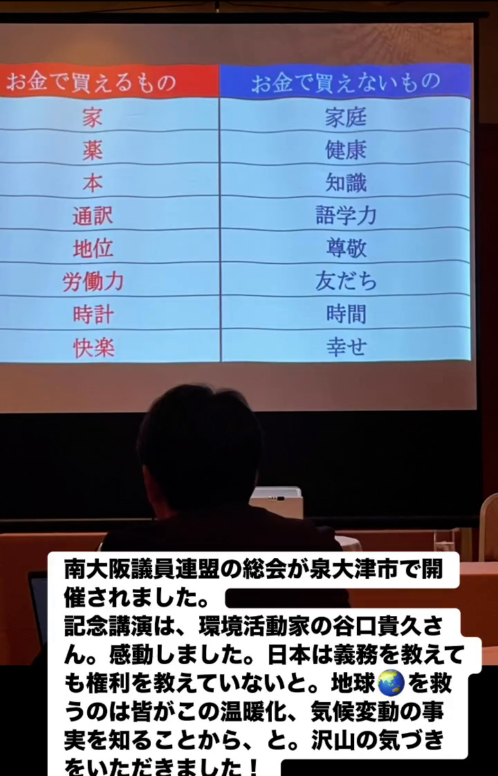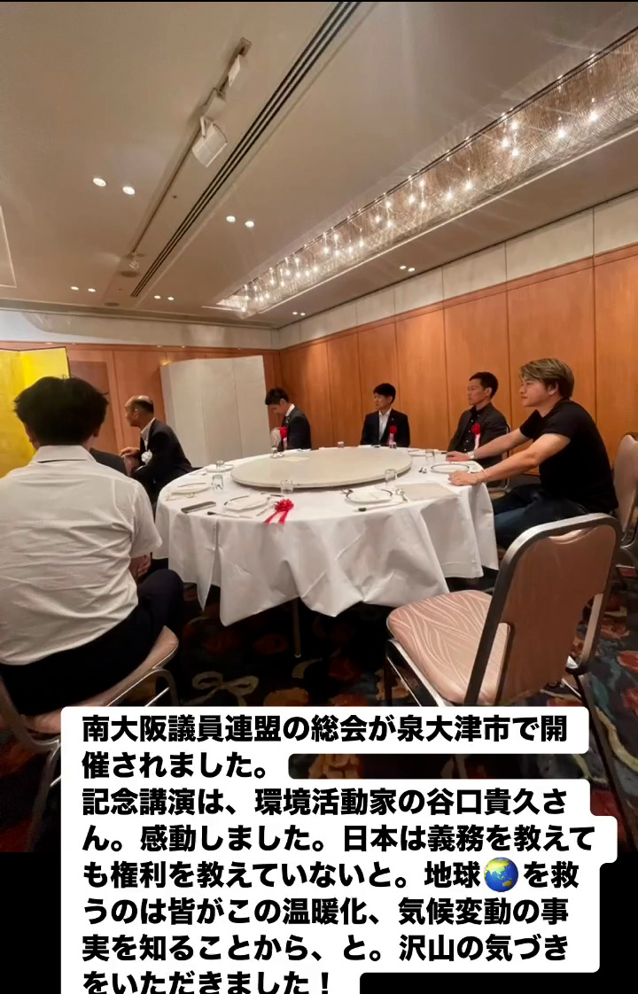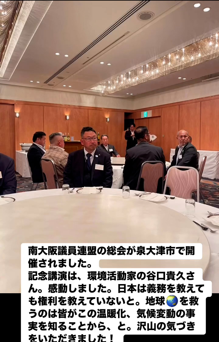 南大阪議員運盟総会 5月31日 Posted on 2025年5月31日 00:00:012025年9月9日 南大阪議員運盟の総会が泉大津市で開催されました。記念講演は、環境活動家の谷口貴久さん。感動しました。 日本は義務を教えても権利を教えていないと。地球🌏️を救うのは皆がこの温暖化、気候変動の事実を知ることから、と。沢山の気づきをいただきました! のりこの活動日記