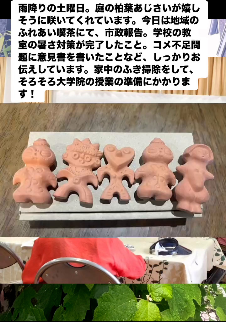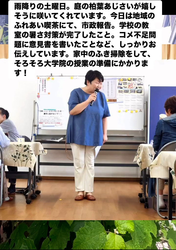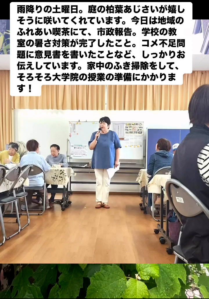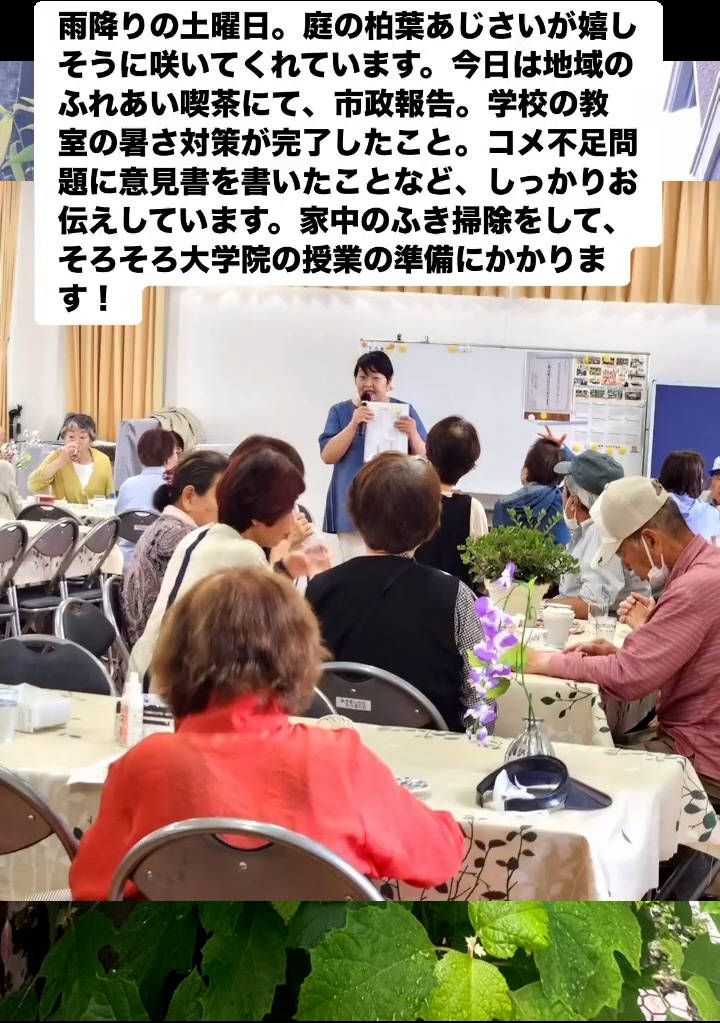 雨降りの土曜日。庭の柏葉あじさいが嬉しそうに咲いてくれています。今日は地域のふれあい喫茶にて、市政報告。学校の教室の暑さ対策が完了したこと。コメ不足問題に意見書を書いたことなど、しっかりお伝えしています。家中のふき掃除をして、そろそろ大学院の授業の準偏にかかります!