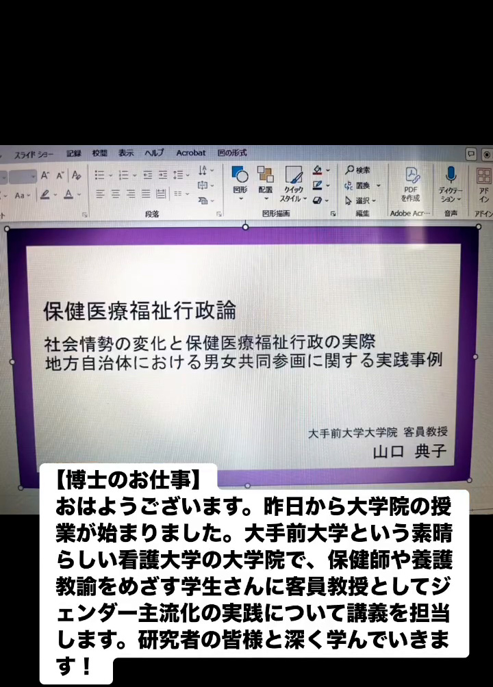 博士のお仕事 6月8日 Posted on 2025年6月8日 07:40:012025年9月9日 おはようこざいます。昨日から大学院の授業が始まりました。大手前大学という素晴らしい看護大学の大学院で、保健師や養護教諭をめざす学生さんに客員教授としてジェンダー主流化の実践について講義を担当します。研究者の皆様と深く学んでいきます! のりこの活動日記