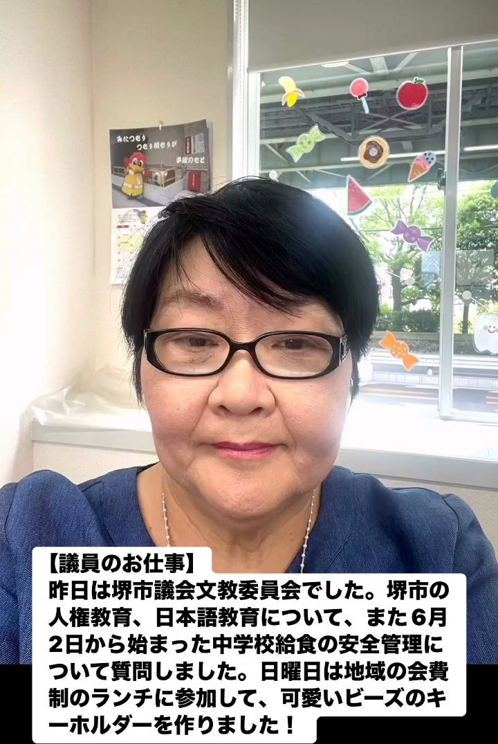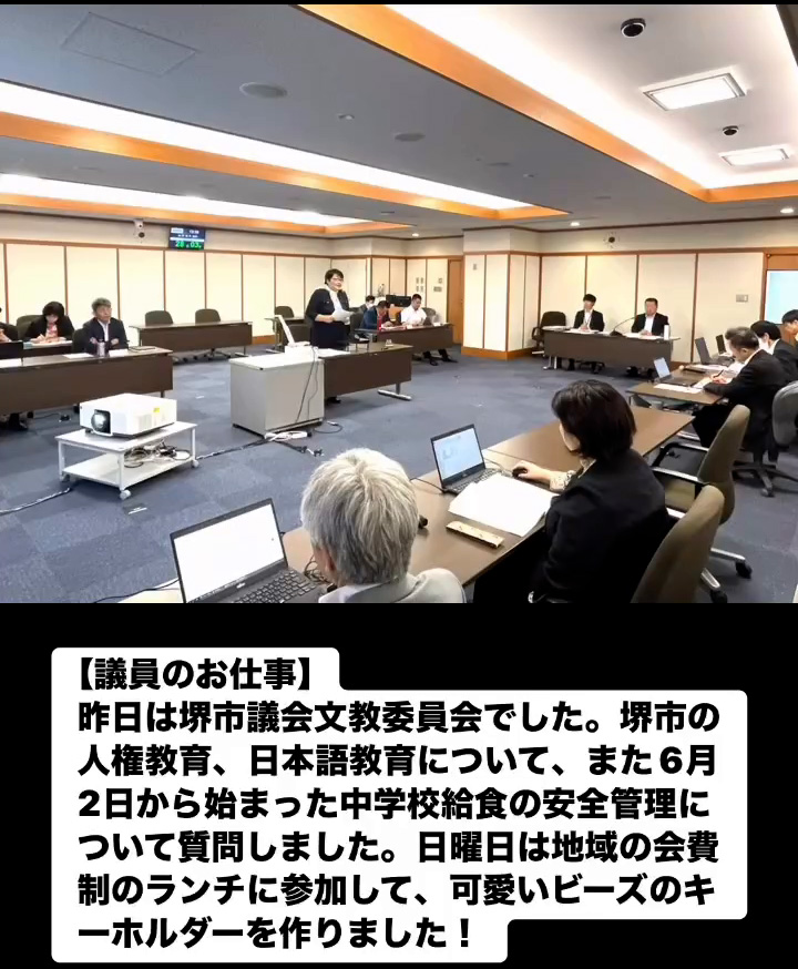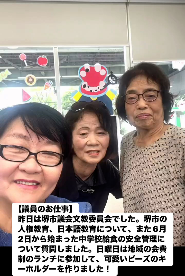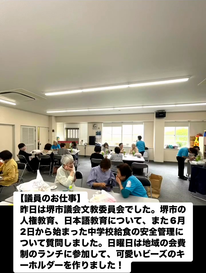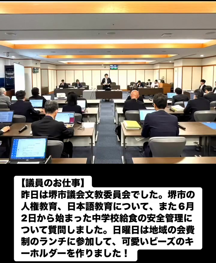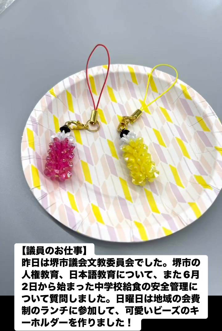 議員のお仕事 6月10日 Posted on 2025年6月10日 09:09:012025年9月9日 昨日は堺市議会文教委員会でした。堺市の人権教育、日本語教育について、また6月2日から始まった中学校給食の安全管理について質問しました。日曜日は地域の会費制のランチに参加して、可愛いビーズのキ ーホルダーを作りました! のりこの活動日記