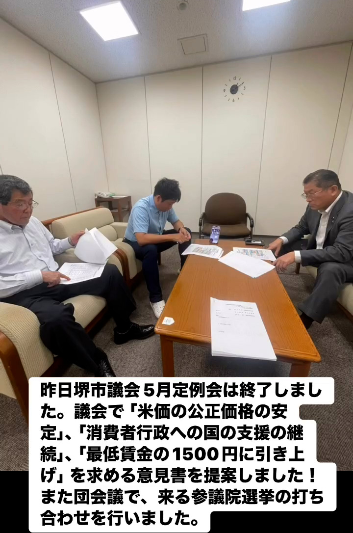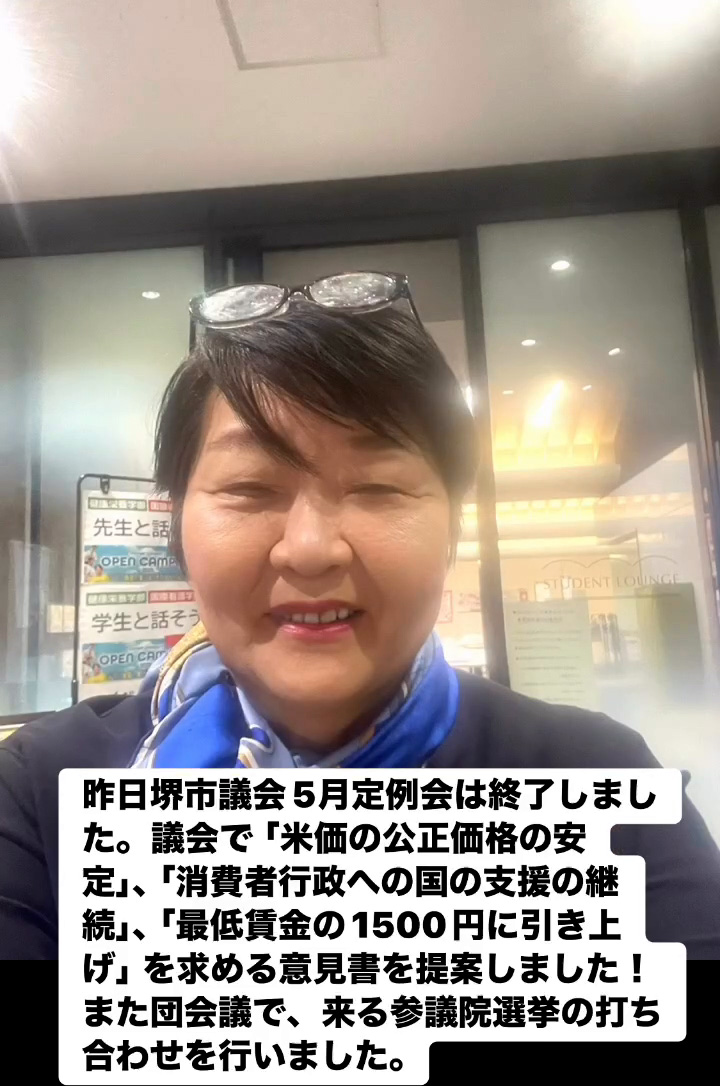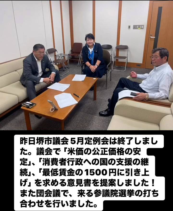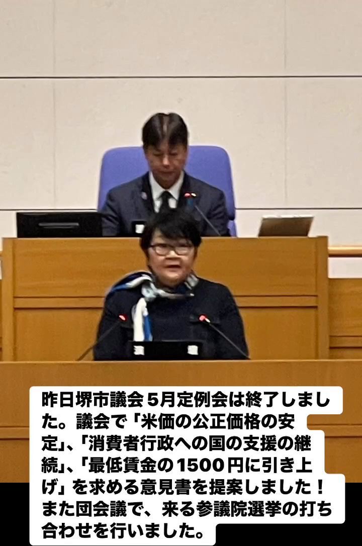 堺市議会5月定例会 6月17日 Posted on 2025年6月17日 09:22:012025年9月9日 昨日堺市議会5月定例会は終了しました。議会で「米価の公正価格の安定」、「消費者行政への国の支援の継続」、「最低賃金の1500円に引き上げ」を求める意見書を提案しました!また団会議で、来る参議院選挙の打ち合わせを行いました。 のりこの活動日記, 議会報告