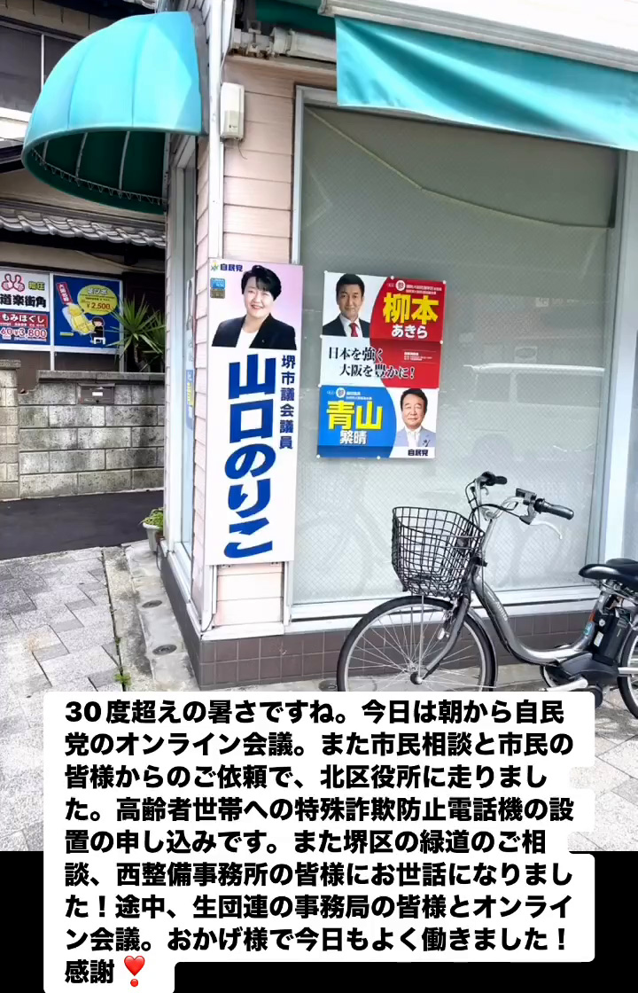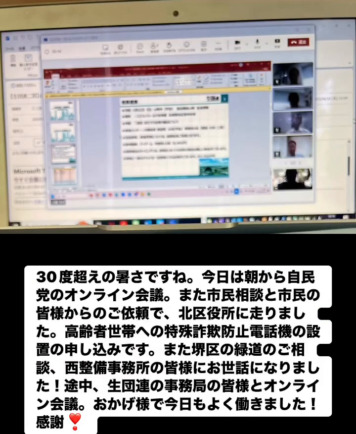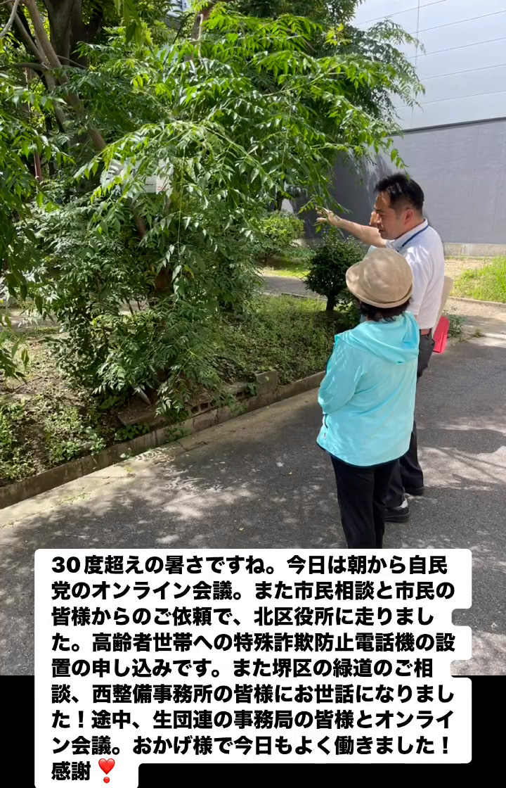 30度超えの暑さですね。今日は朝から自民党のオンライン会議。また市民相談と市民の皆様からのご依頼で、北区役所に走りました。高齢者世帯への特殊詐欺防止電話機の設置の申し込みです。また堺区の緑道のご相談、西整備事務所の皆様にお世話になりました!途中、 生団運の事務局の皆様とオンライン会議。おかげ様で今日もよく働きました!感謝❤