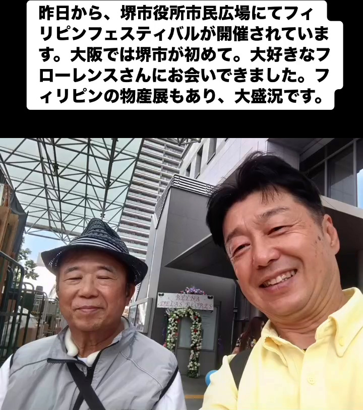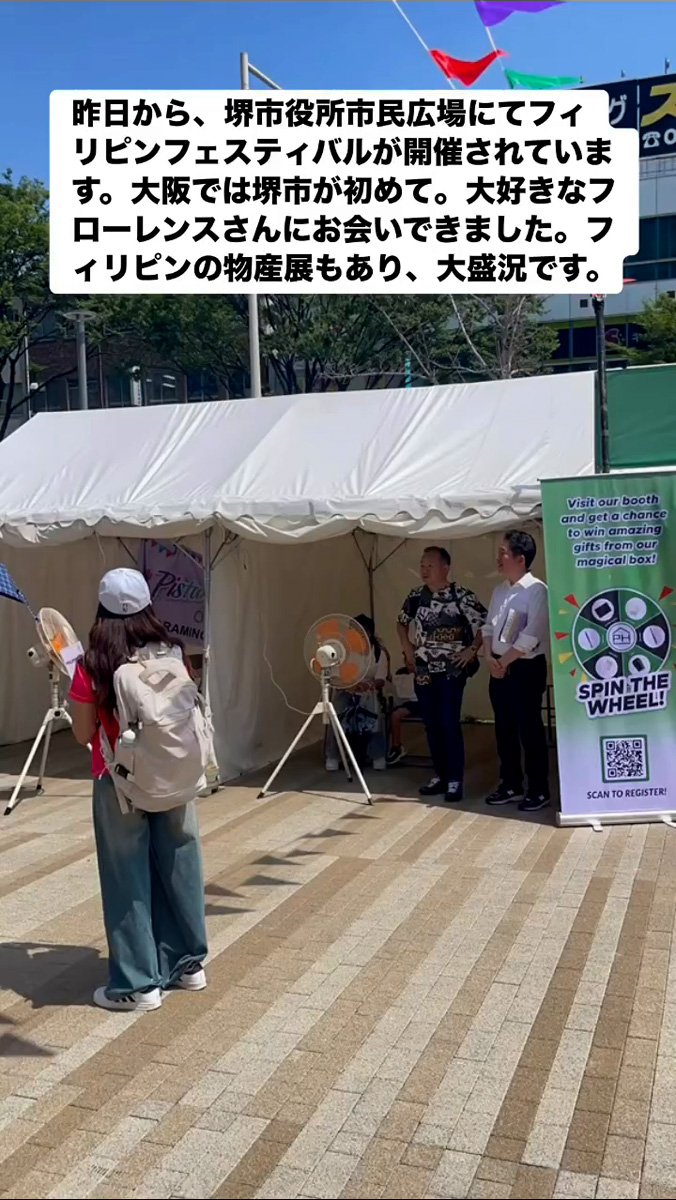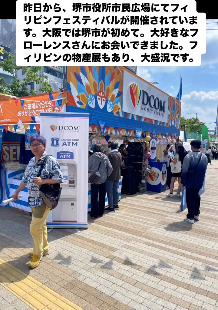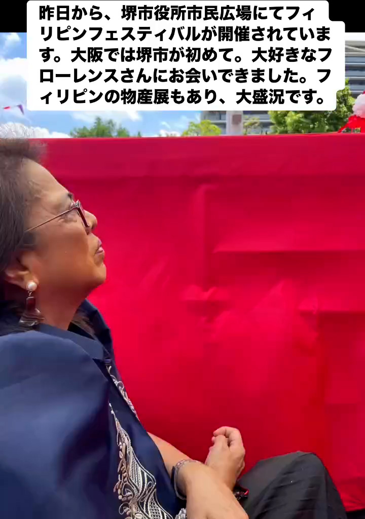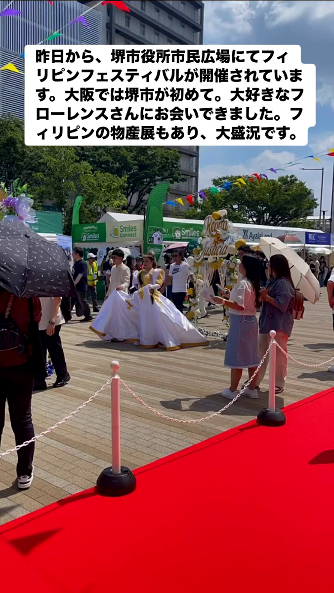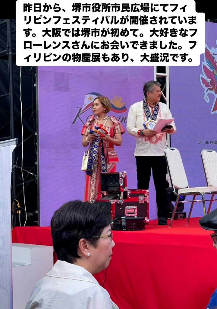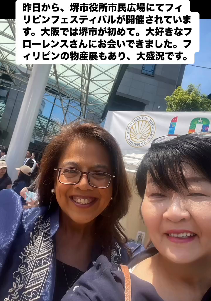 フィリピンフェスティバル 6月22日 Posted on 2025年6月22日 07:54:012025年9月9日 昨日から、堺市役所市民広場にてフィリピンフェスティバルが開催されています。大阪では堺市が初めて。大好きなフローレンスさんにお会いできました。フィリビンの物産屋もあり、大盛況です。 のりこの活動日記