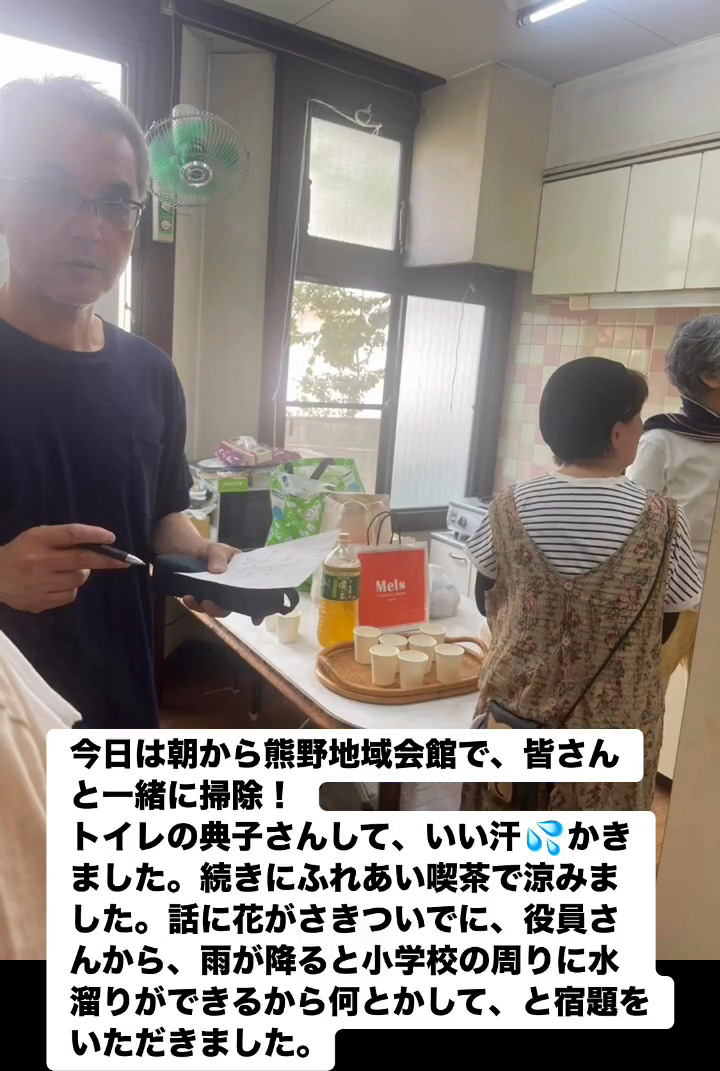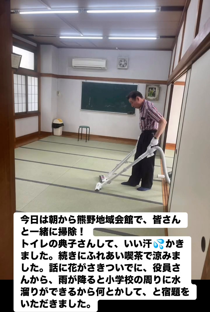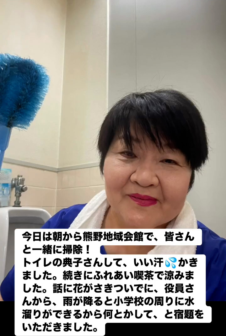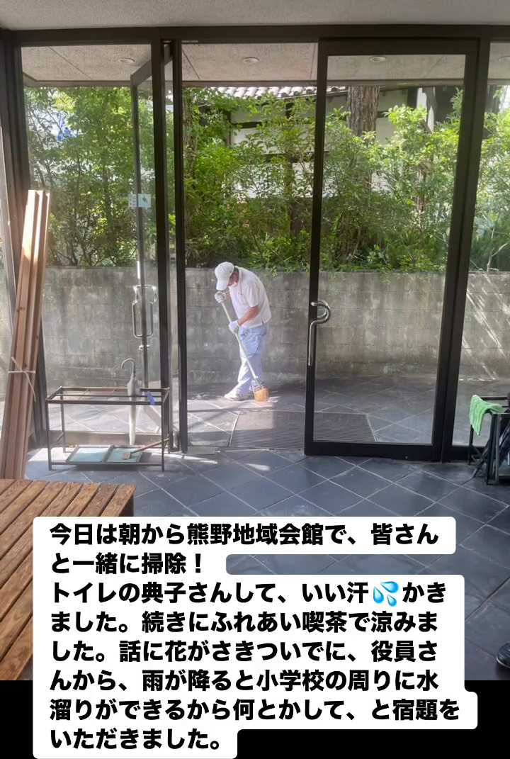熊野地域会館で撮除 6月22日 Posted on 2025年6月22日 14:51:032025年9月9日 今日は朝から熊野地域会館で、皆さんと一緒に撮除!トイレの典子さんして、いい汗💦かきました。続きにふれあい喫茶で涼みました。話に花がさきついでに、役員さんから、雨が降ると小学校の周りに水溜りができるから何とかして、と宿題をいただきました。 のりこの活動日記