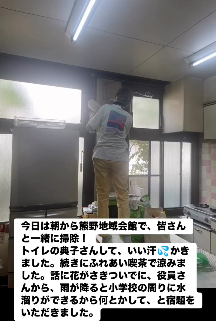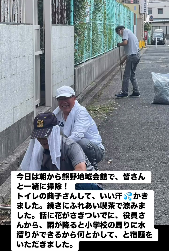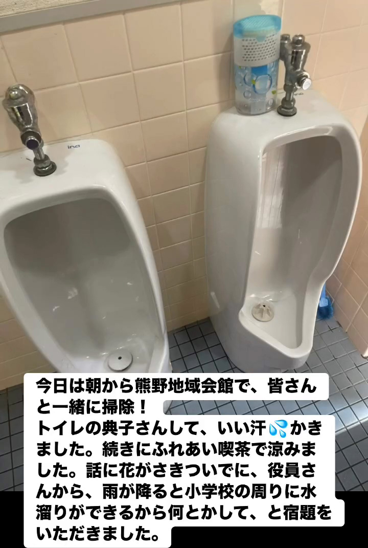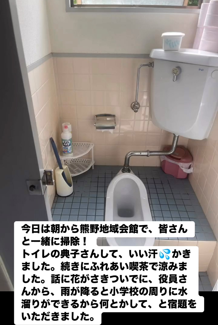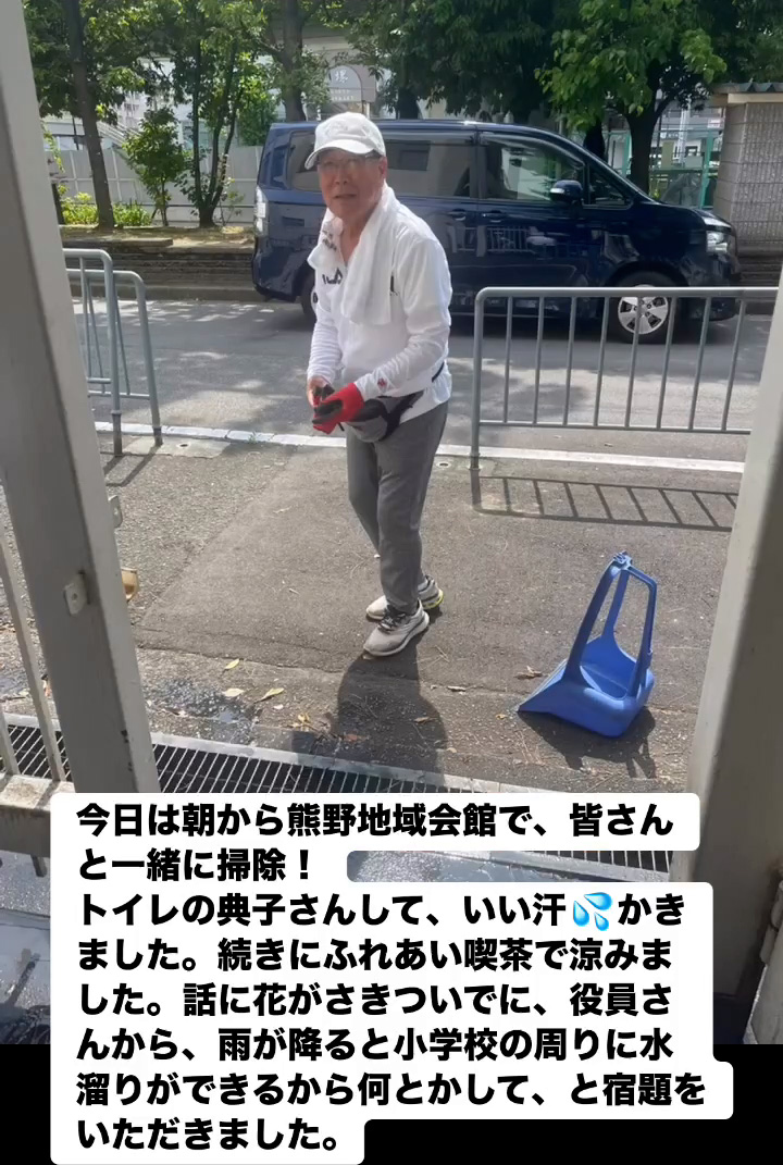 熊野地域会館で撮除 6月22日 Posted on 2025年6月22日 14:51:032025年9月9日 今日は朝から熊野地域会館で、皆さんと一緒に撮除!トイレの典子さんして、いい汗💦かきました。続きにふれあい喫茶で涼みました。話に花がさきついでに、役員さんから、雨が降ると小学校の周りに水溜りができるから何とかして、と宿題をいただきました。 のりこの活動日記