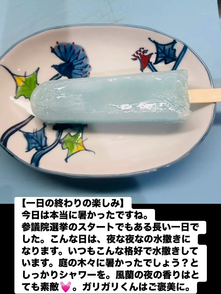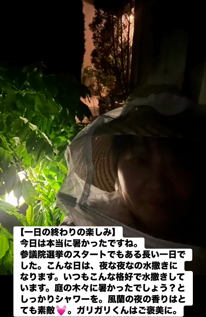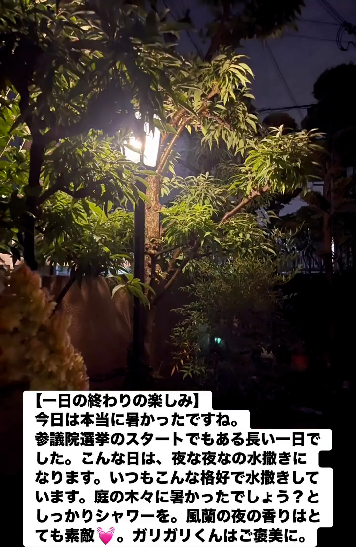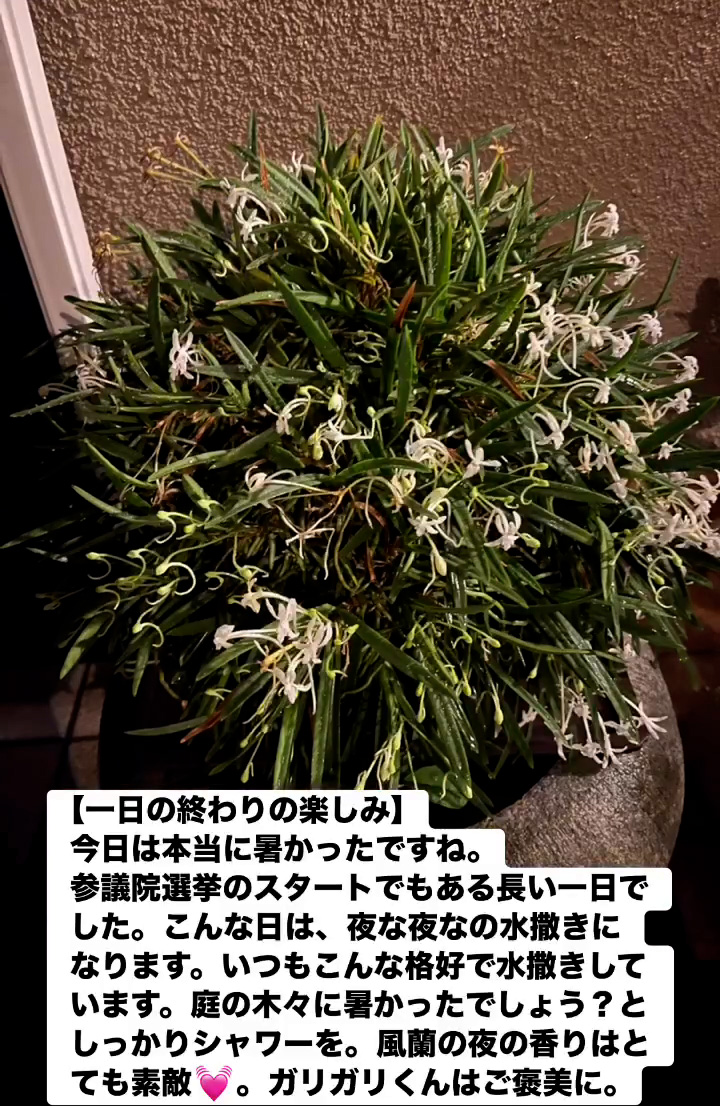 今日は本当に暑かったですね。参議院選挙のスタートでもある長い一日でした。 こんな日は、夜な夜なの水撒きになります。いつもこんな格好で水撒きしています。 庭の木々に暑かったでしょう?としっかりシャワーを。風蘭の夜の香りはとても素敵💓。ガリガリくんはご褒美に。