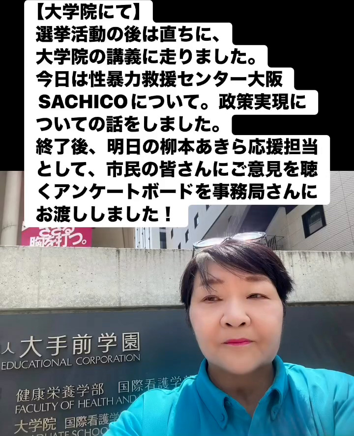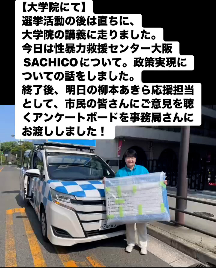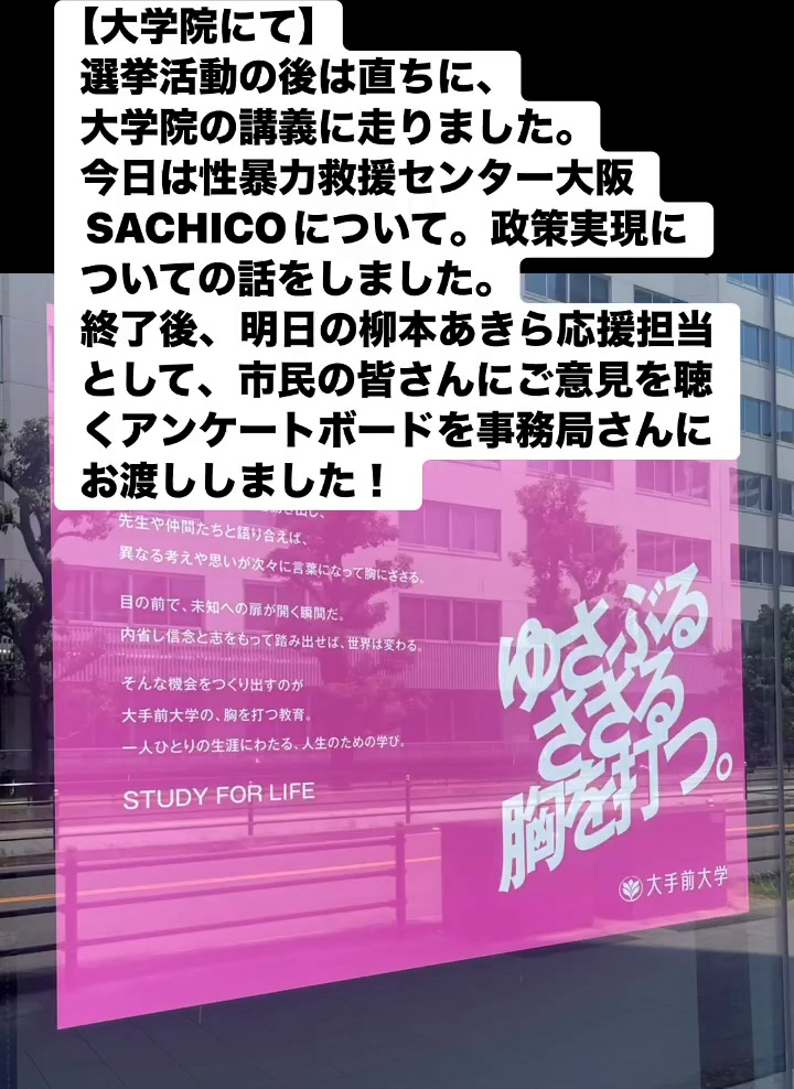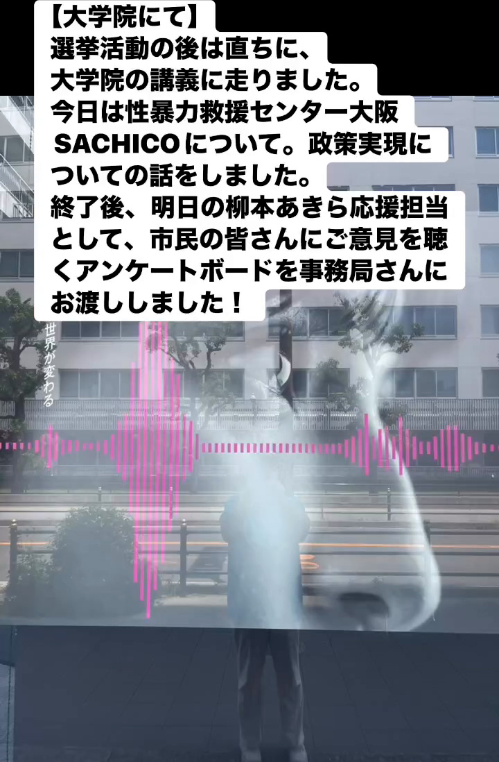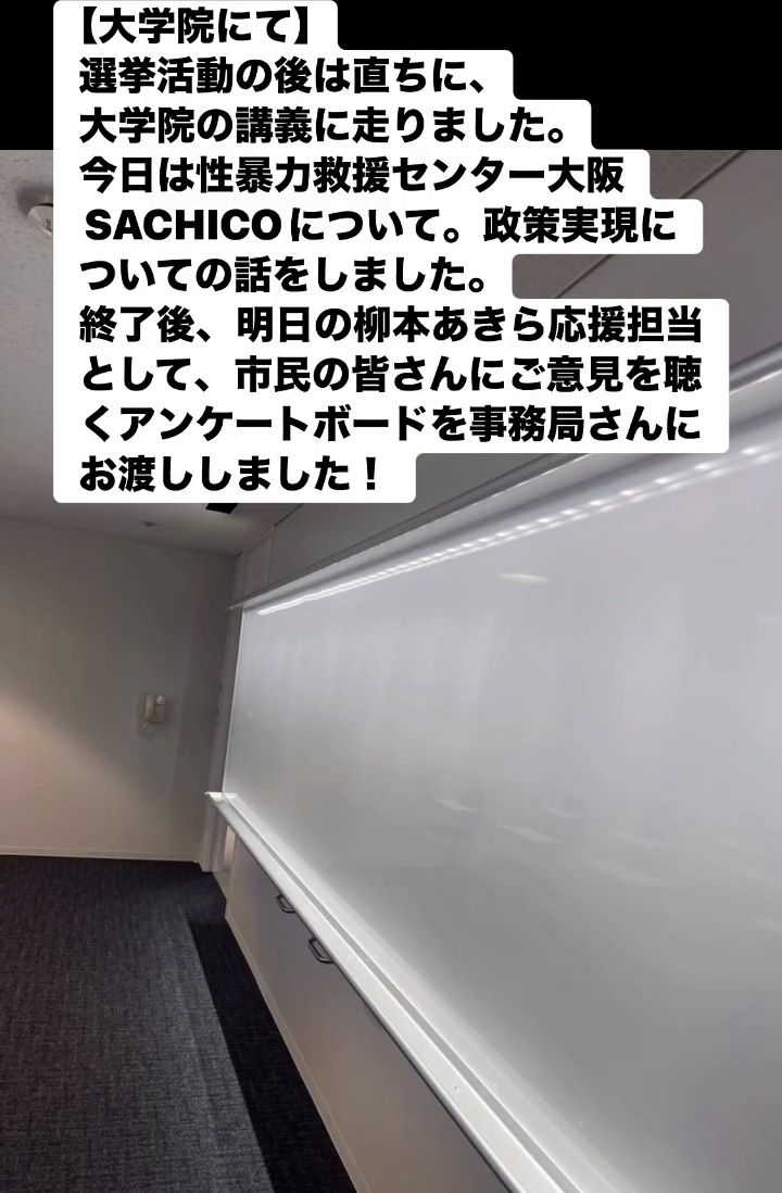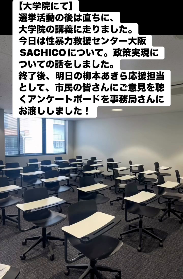 大学院にて 7月6日 Posted on 2025年7月6日 00:19:032025年9月9日 選挙活動の後は直ちに、大学院の講義に走りました。今日は性暴力救援センター大阪SACHICOについて。政策実現についての話をしました。終了後、明日の柳本あきら応援担当として、市民の皆さんにご意見を聴くアンケートボードを事務局さんにお濃ししました! のりこの活動日記