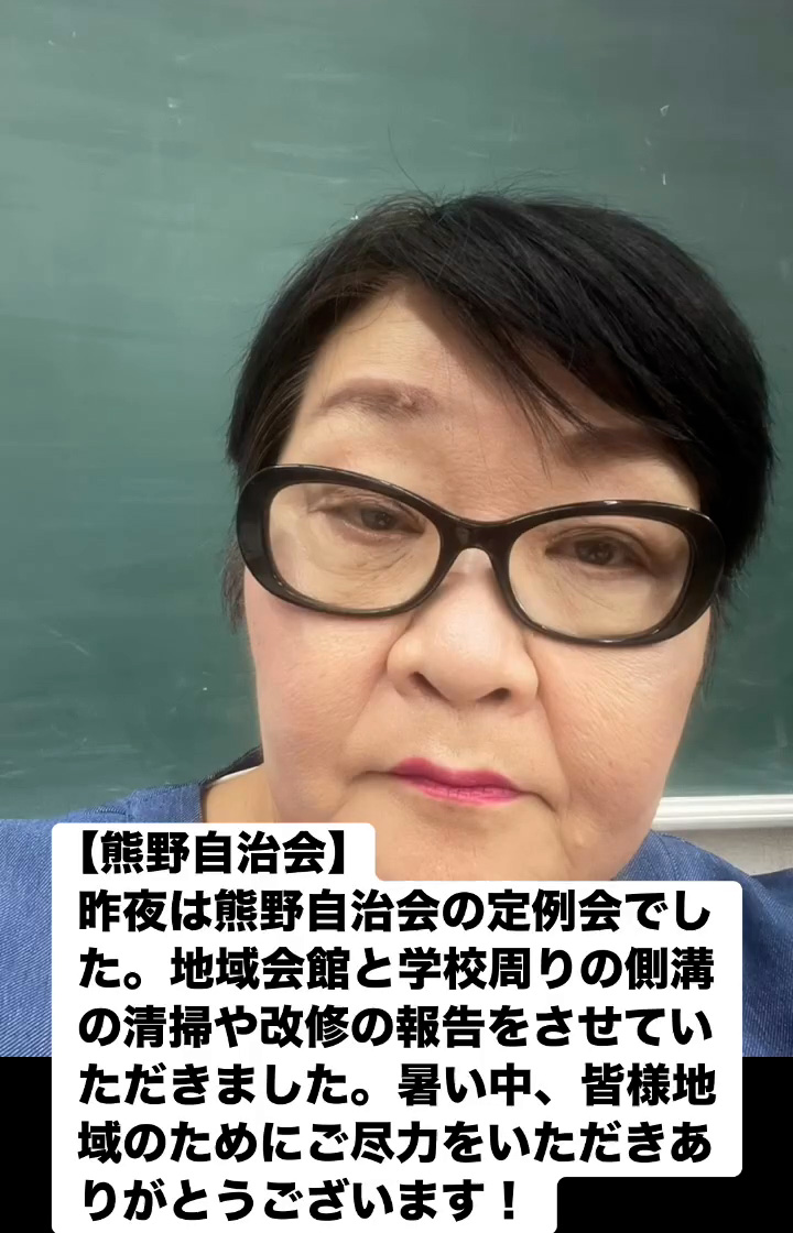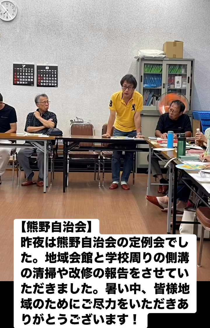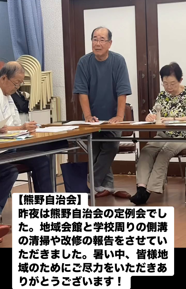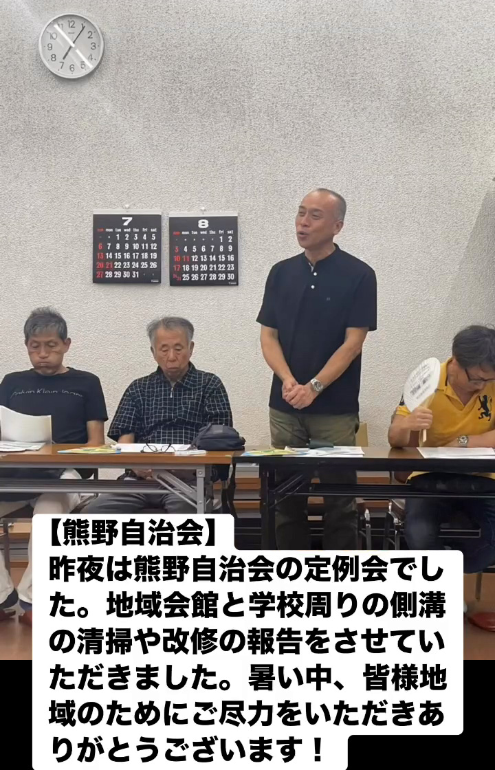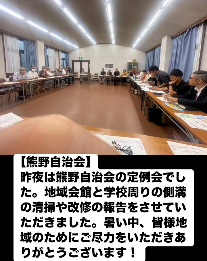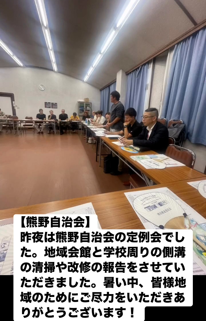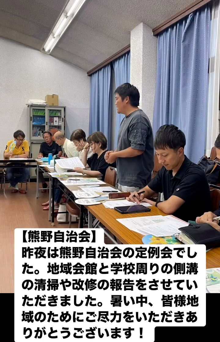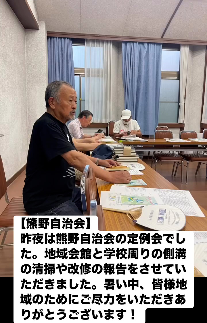 昨夜は熊野自治会の定例会でした。地域会館と学校周りの側溝の清掃や改修の報告をさせていただきました。 暑い中、皆様地域のためにご尽力をいただきありがとうこざいます!