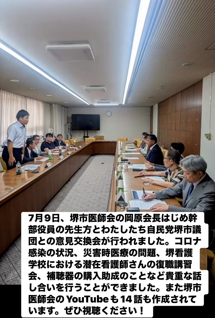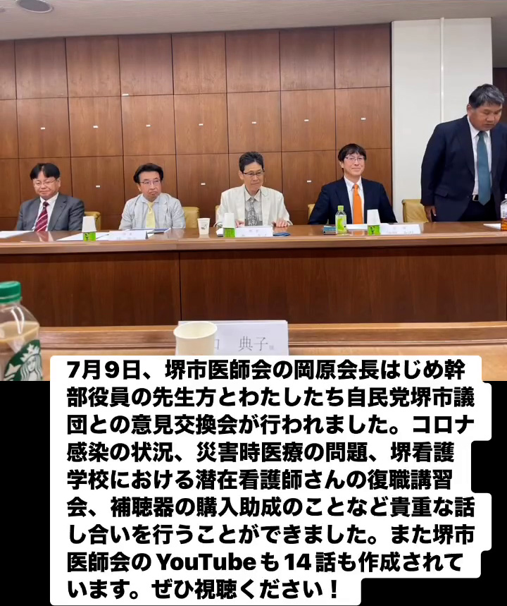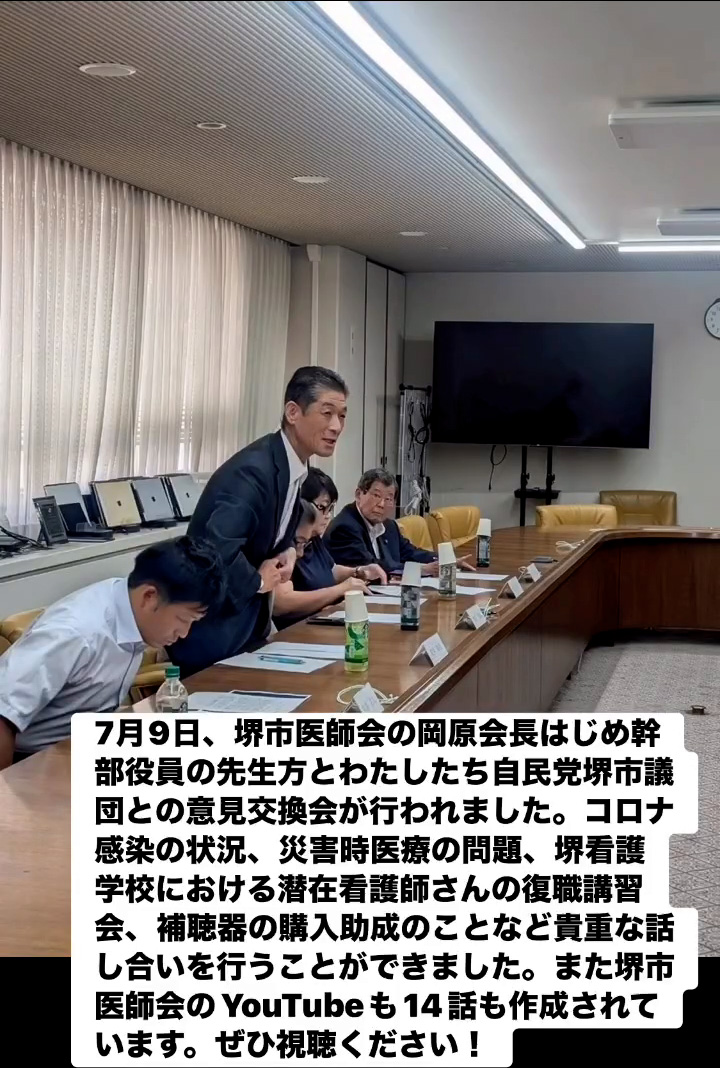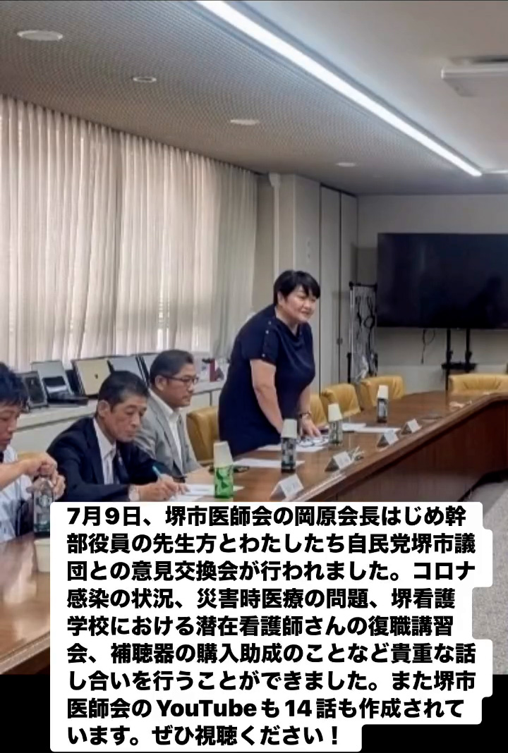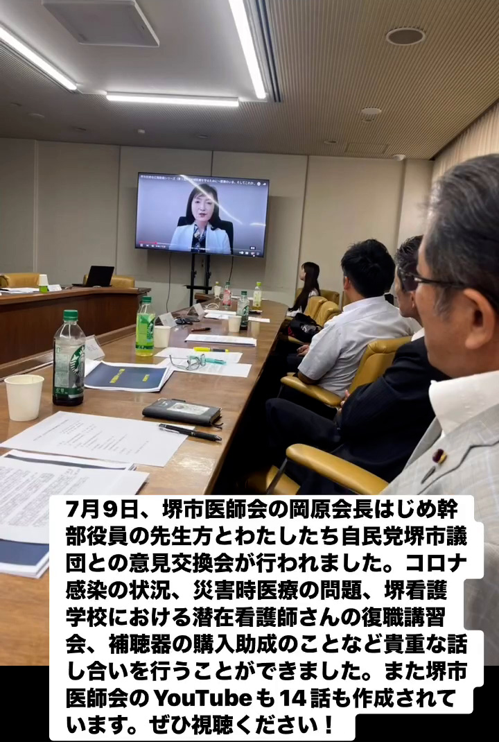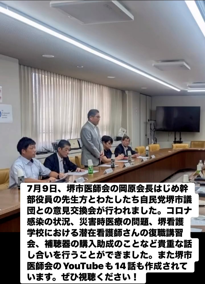 7月9日、堺市医師会の岡原会長はじめ幹部役員の先生方とわたしたち自民党堺市議団との意見交換会が行われました。コロナ感染の状況、災害時医療の問題、堺看護学校における潜在看護師さんの復職講習会、補聴器の購入助成のことなど貴重な話し合いを行うことができました。また堺市医師会のVouTubeも14話も作成されています。ぜひ視聴ください!
