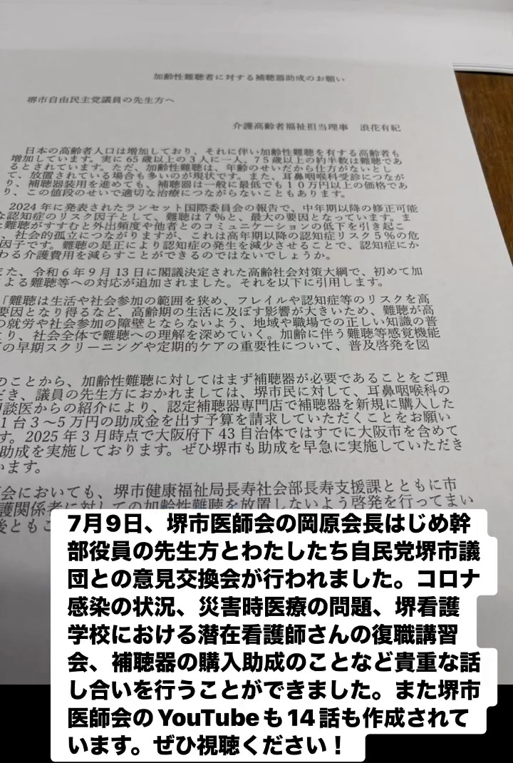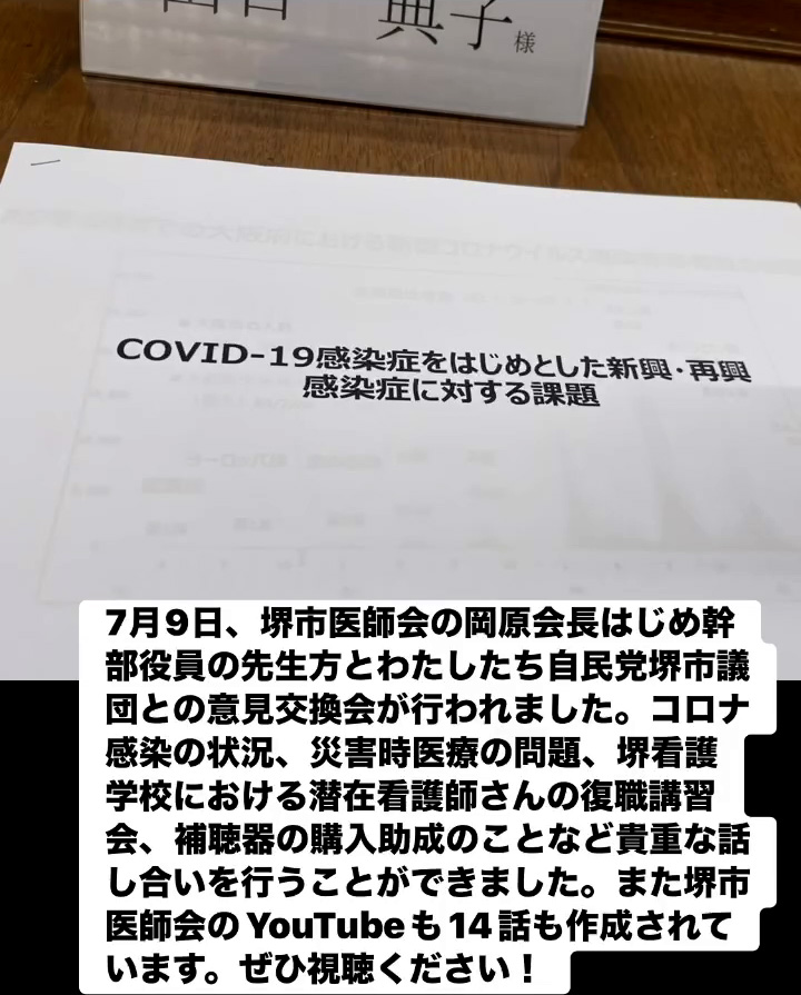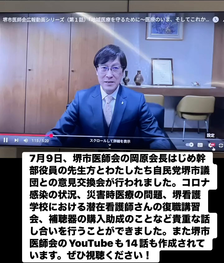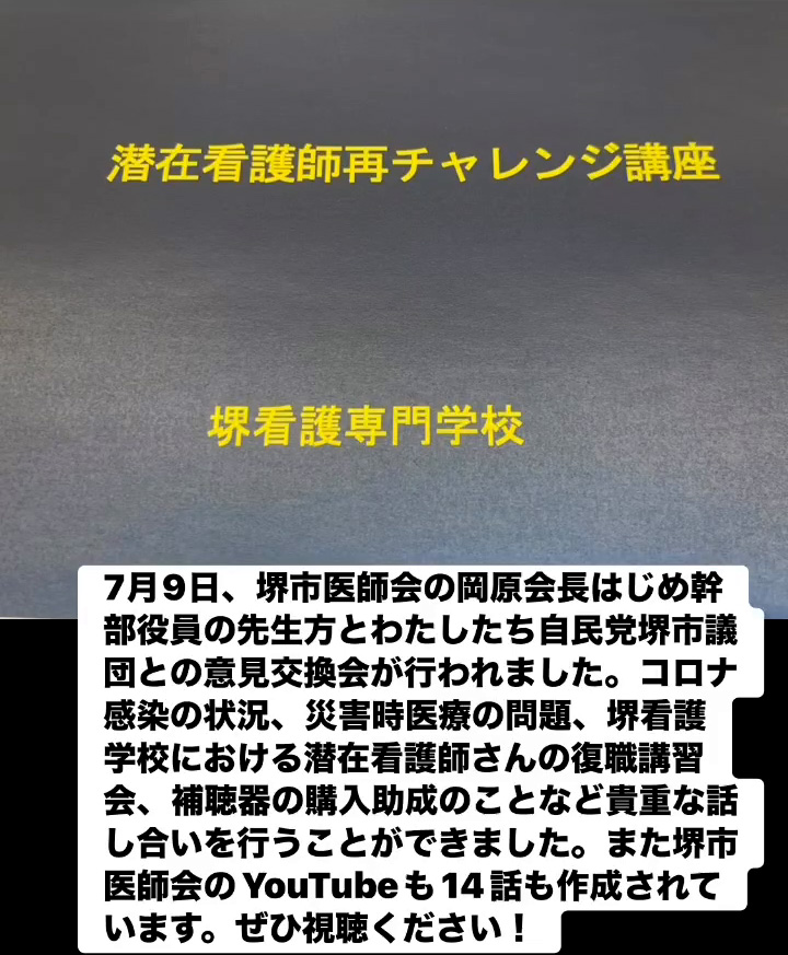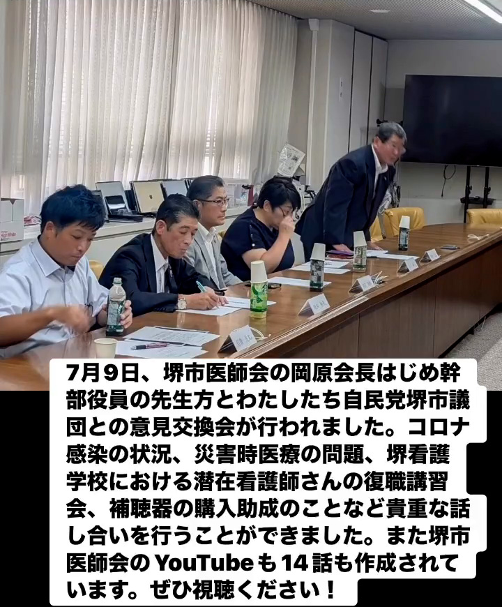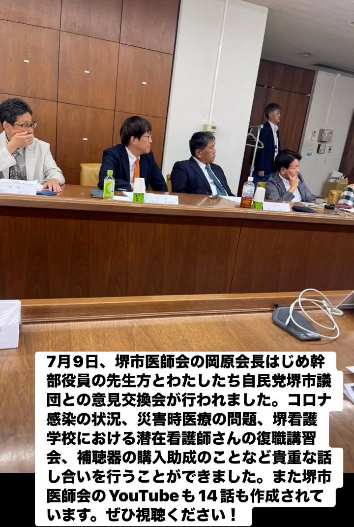 7月9日、堺市医師会の岡原会長はじめ幹部役員の先生方とわたしたち自民党堺市議団との意見交換会が行われました。コロナ感染の状況、災害時医療の問題、堺看護学校における潜在看護師さんの復職講習会、補聴器の購入助成のことなど貴重な話し合いを行うことができました。また堺市医師会のVouTubeも14話も作成されています。ぜひ視聴ください!