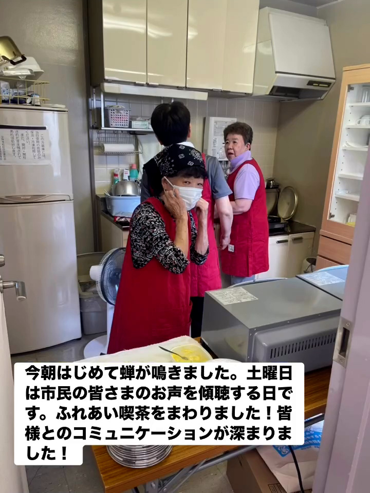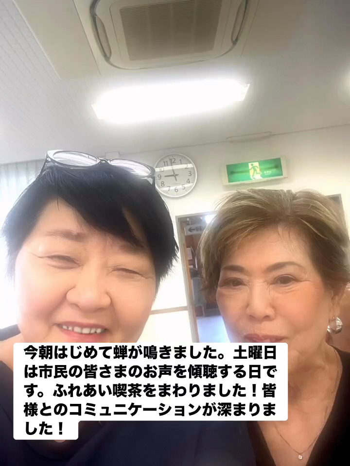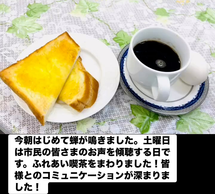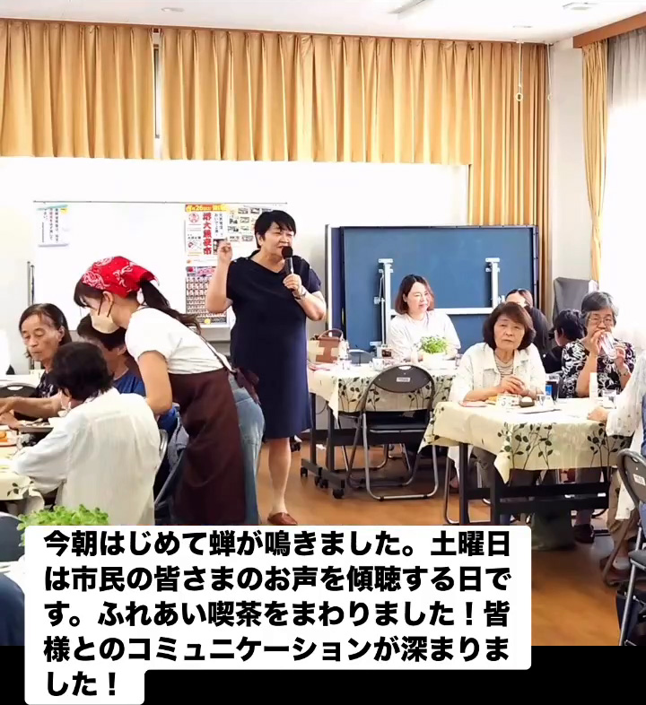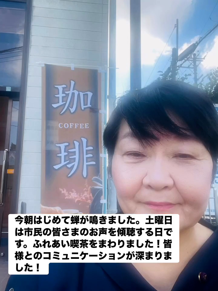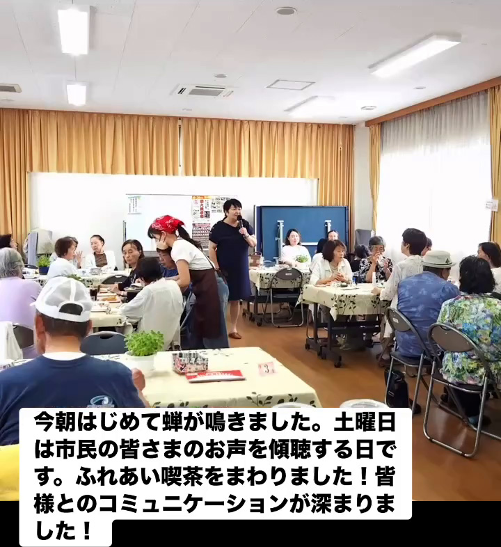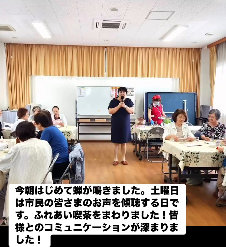 ふれあい喫茶 7月12日 Posted on 2025年7月12日 23:59:012025年9月9日 今朝はじめて蝉が鴫きました。土曜日は市民の皆さまのお声を傾聴する日です。ふれあい喫茶をまわりました!皆様とのコミュニケーションが深まりました! のりこの活動日記
