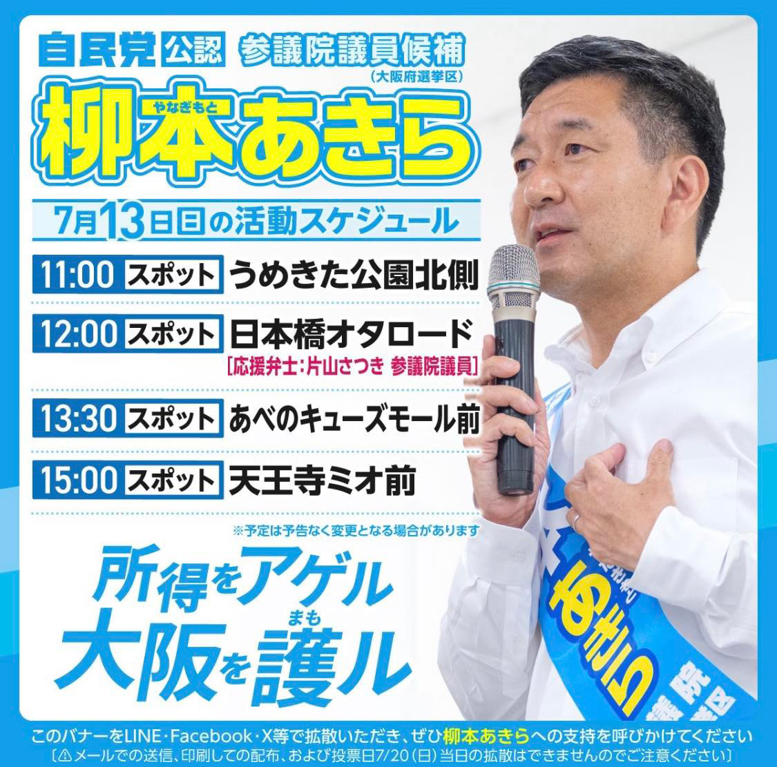 写真のスケジュールは、柳本あきら候補がはいるところですが、わたしたちのスタートは、梅田ヨドバシカメラさん前です。