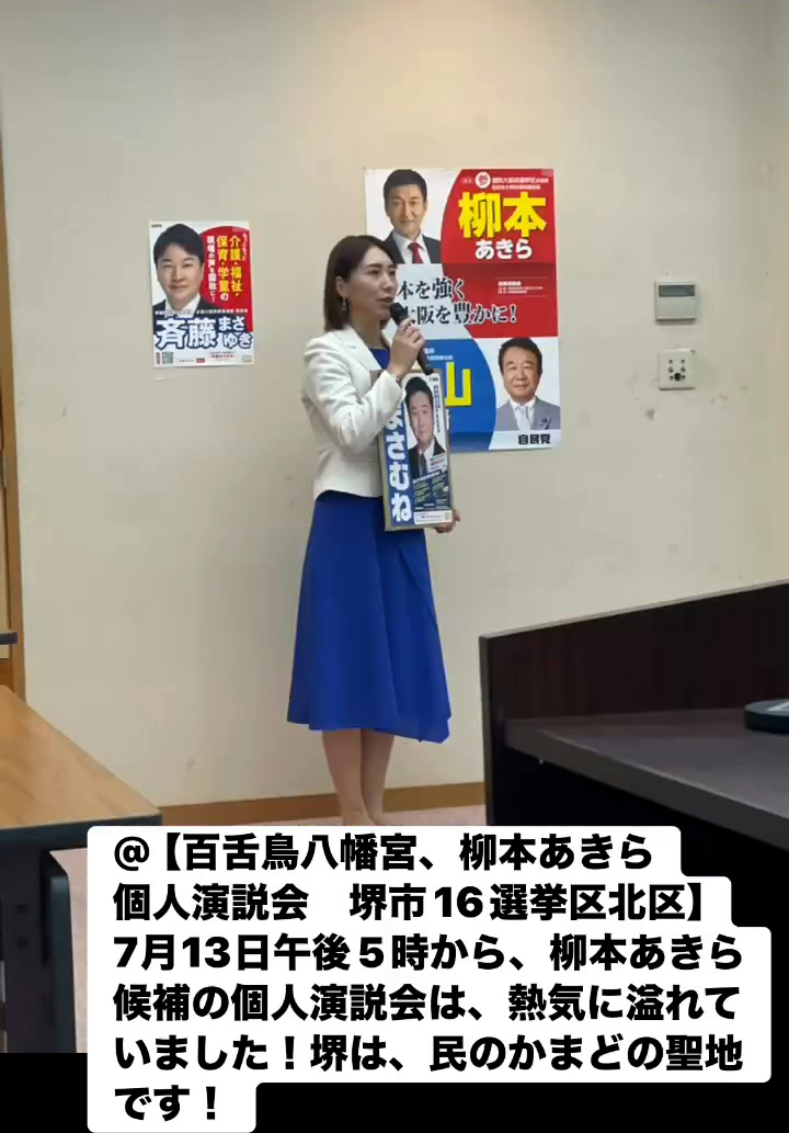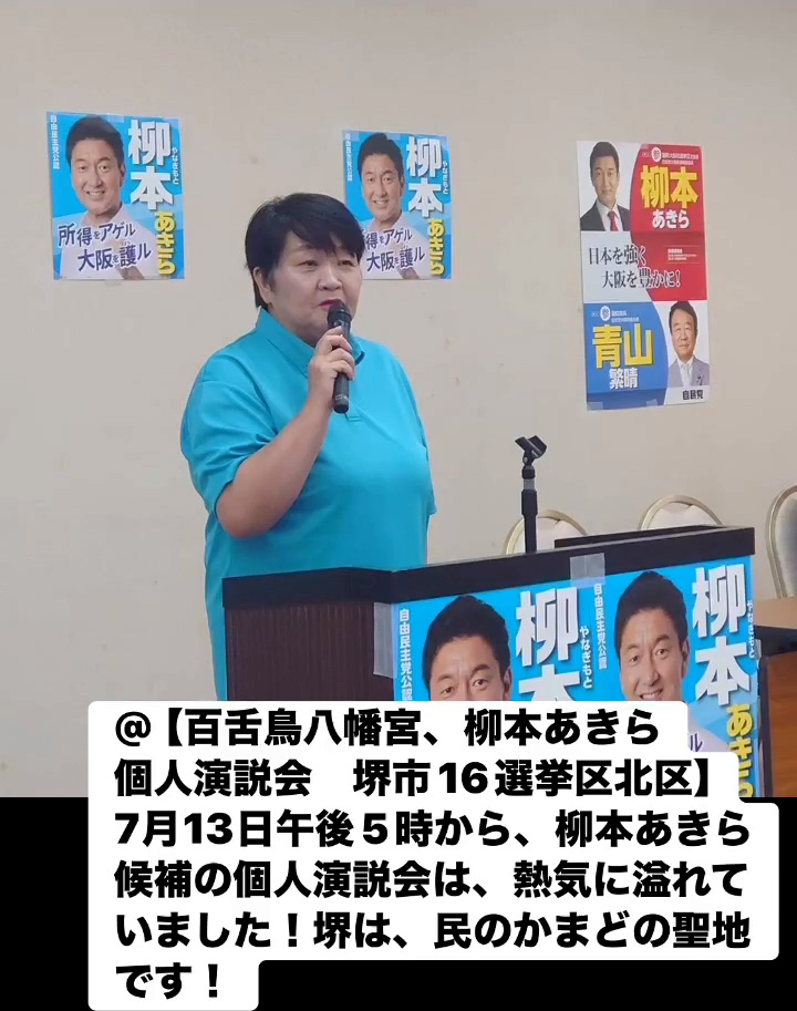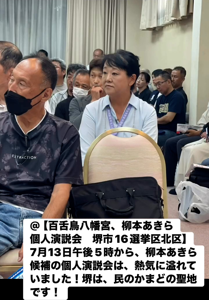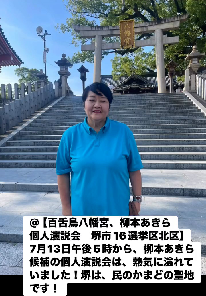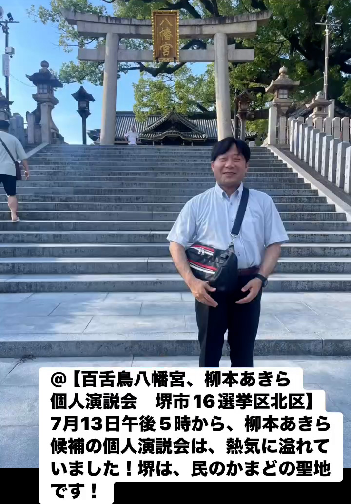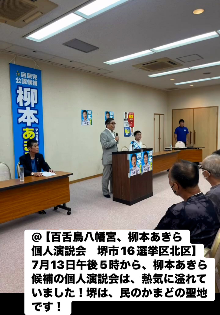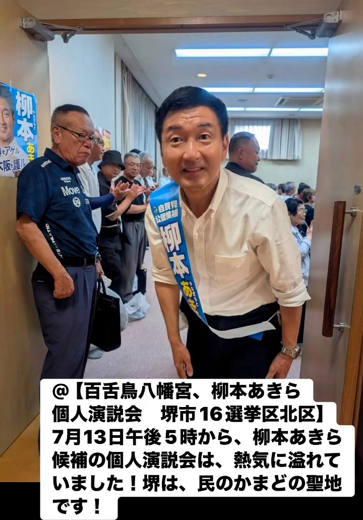 百舌鳥八幡宮、柳本あきら 個人演説会 堺市16選挙区北区 7月15日 Posted on 2025年7月15日 00:00:012025年9月9日 7月13日午後5時から、柳本あきら候補の個人演説会は、熱気に溢れていました!堺は、民のかまどの聖地です! のりこの活動日記, 自民党大阪