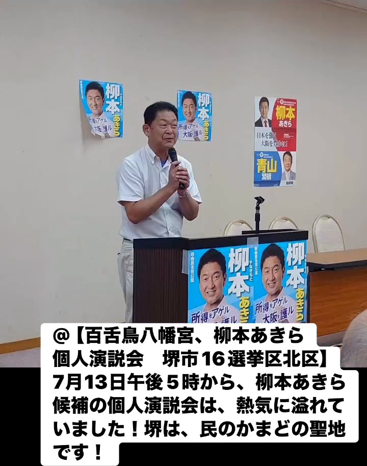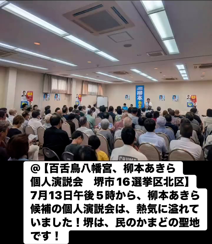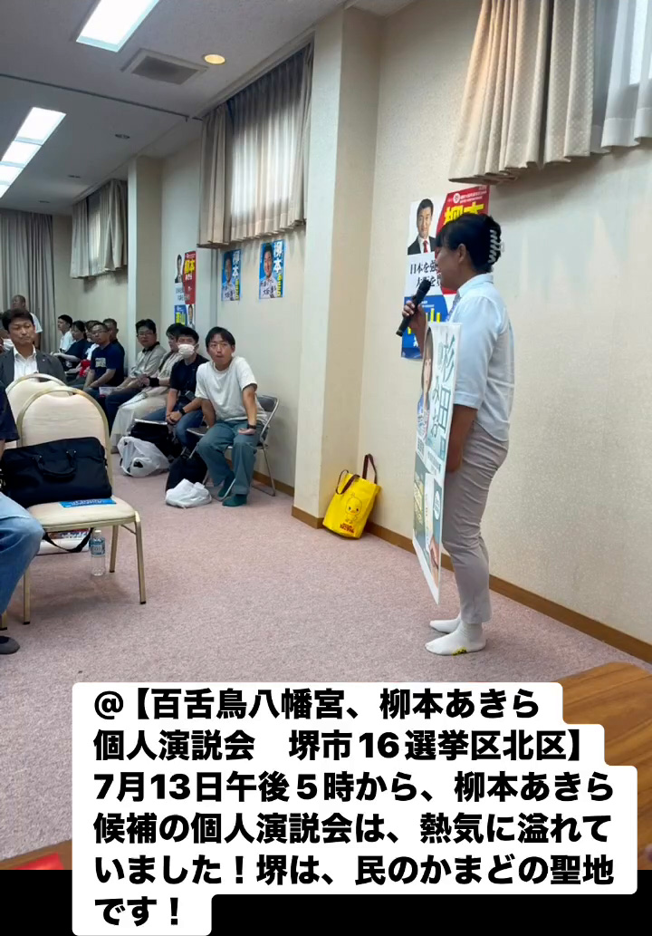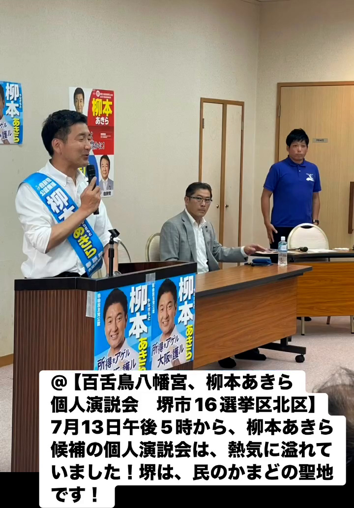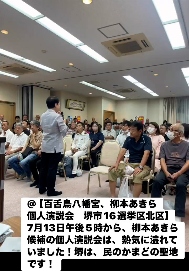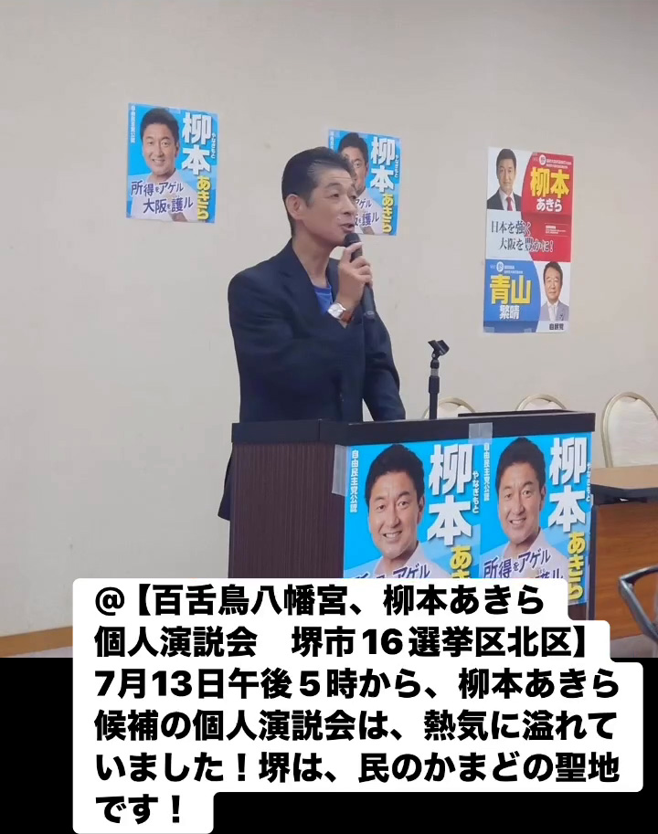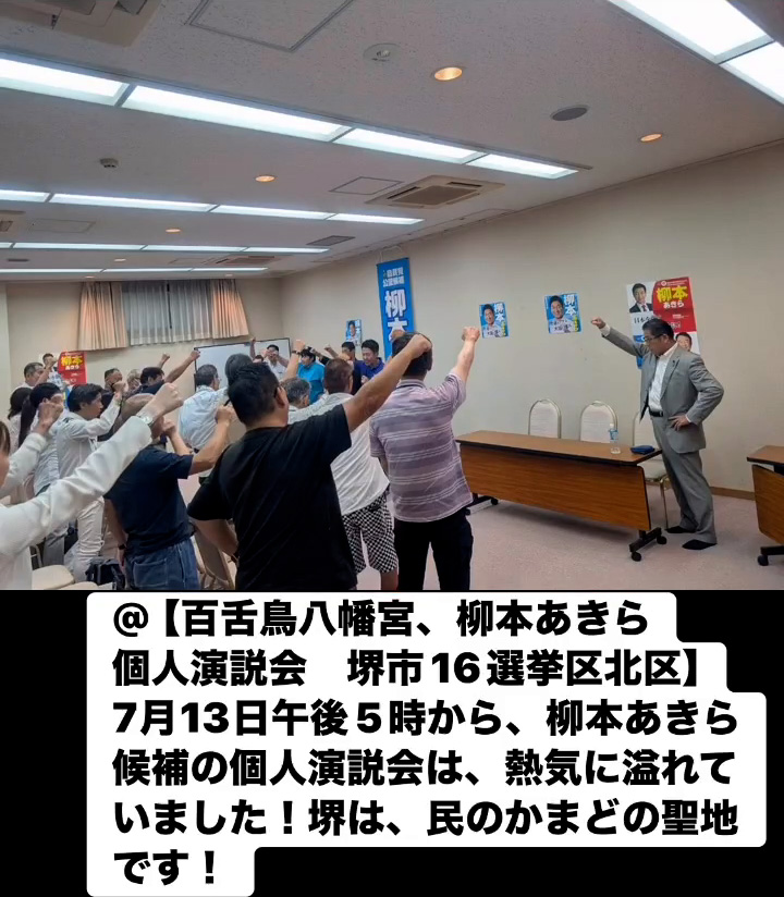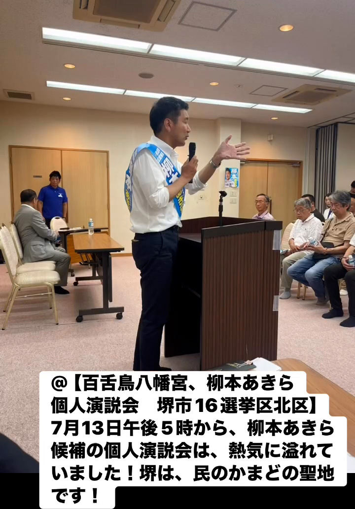 百舌鳥八幡宮、柳本あきら 個人演説会 堺市16選挙区北区 7月15日 Posted on 2025年7月15日 00:00:012025年9月9日 7月13日午後5時から、柳本あきら候補の個人演説会は、熱気に溢れていました!堺は、民のかまどの聖地です! のりこの活動日記, 自民党大阪