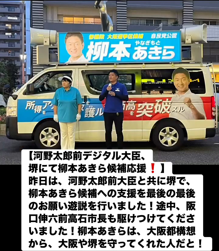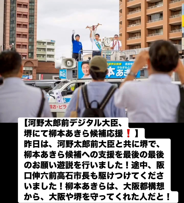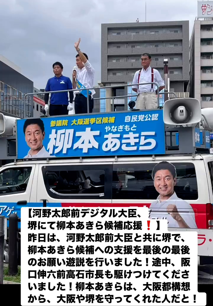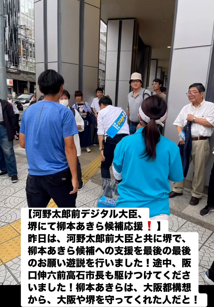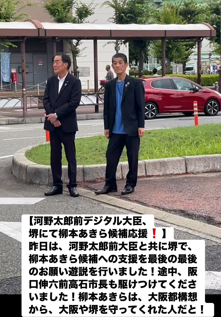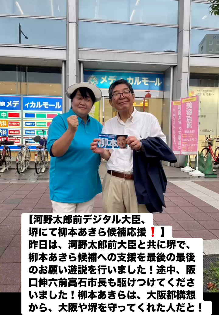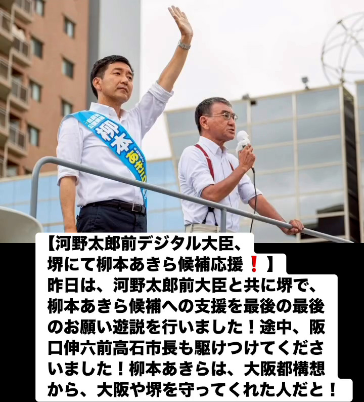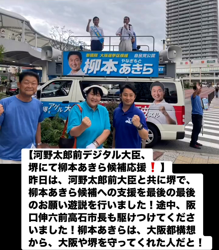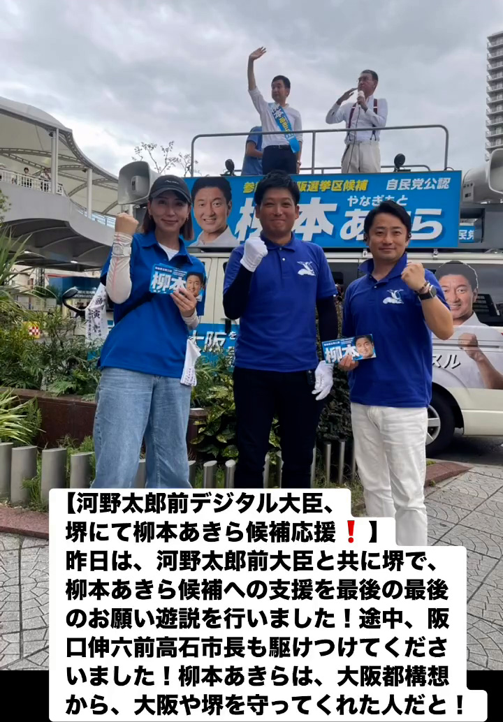 河野太郎前デジタル大臣、堺にて柳本あきら候補応媛! 7月19日 Posted on 2025年7月19日 08:07:012025年9月9日 昨日は、河野太郎前大臣と共に堺で、柳本あきら候補への支援を最後の最後のお願い遊説を行いました!途中、阪口伸六前高石市長も駆けつけてくださいました!柳本あきらは、大阪都構想から、大阪や堺を守ってくれた人だと! のりこの活動日記, 自民党大阪