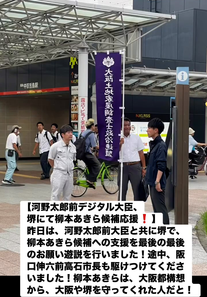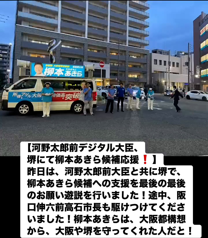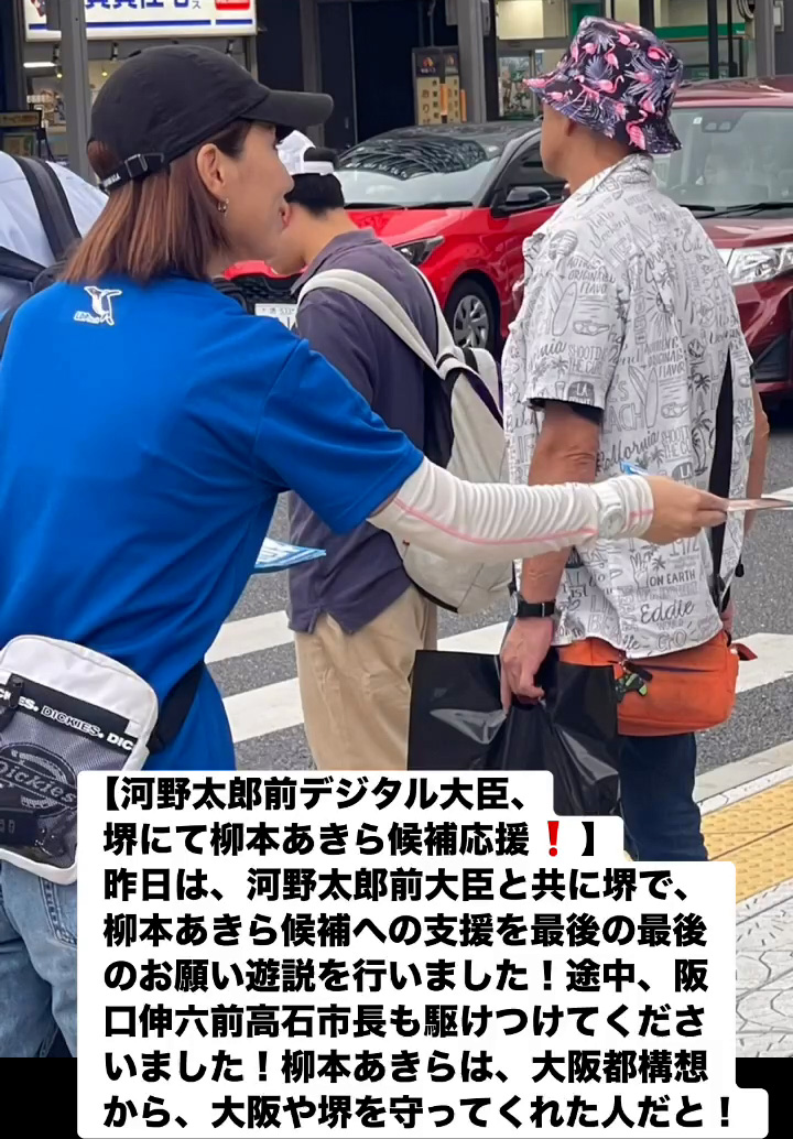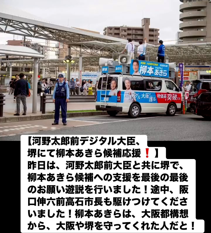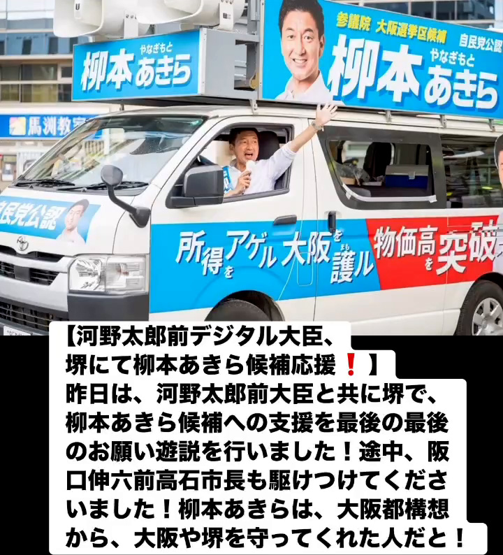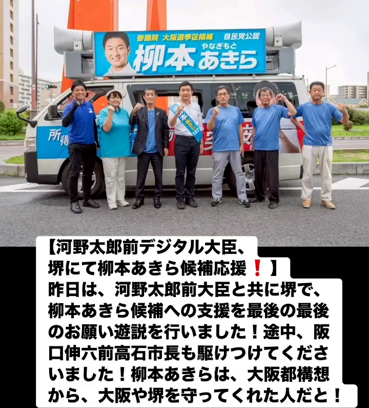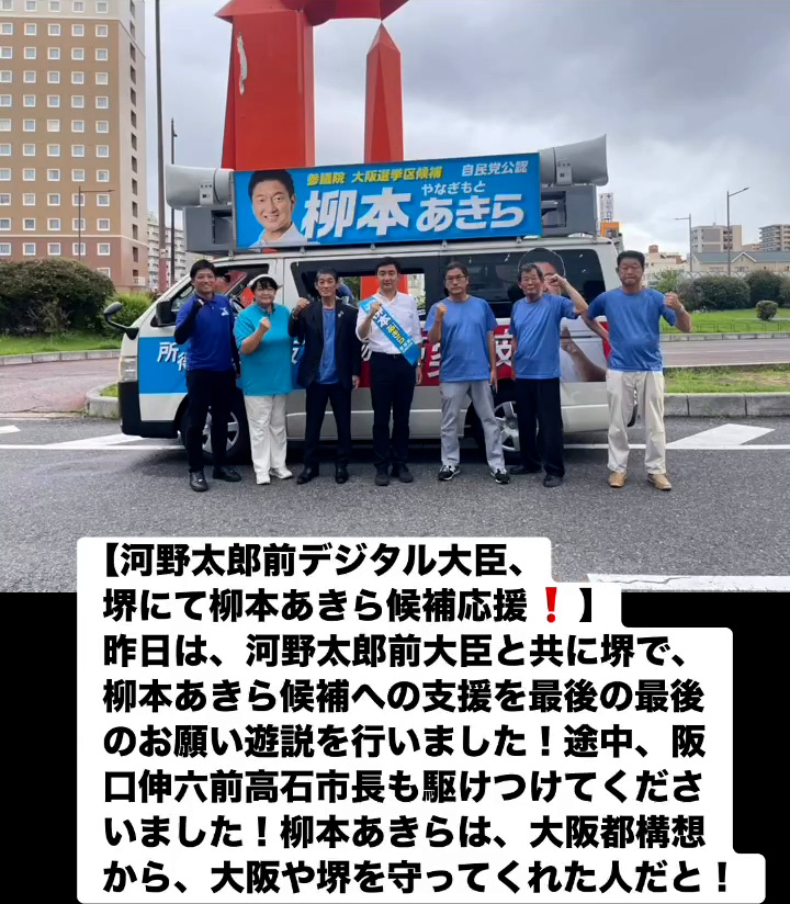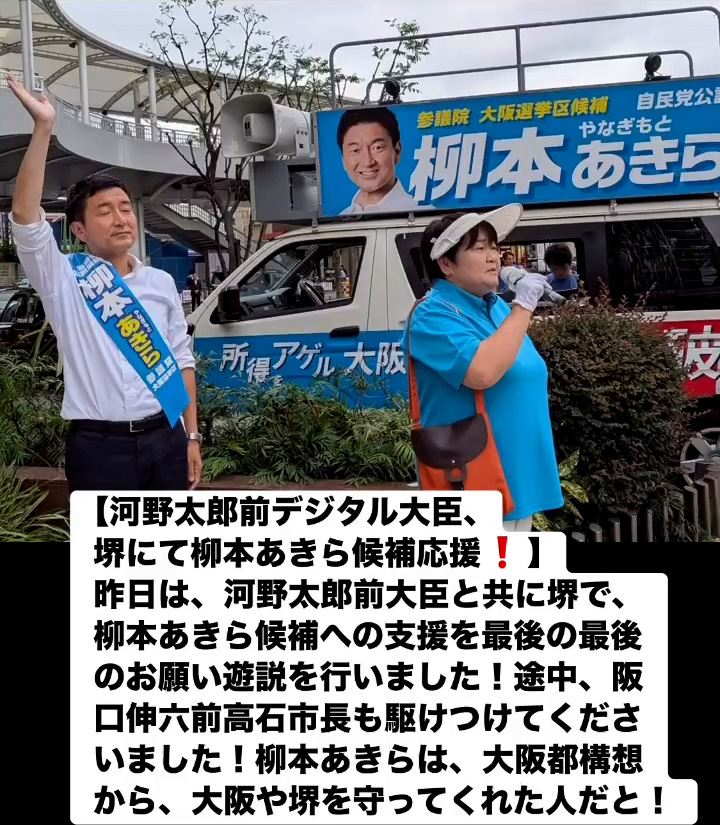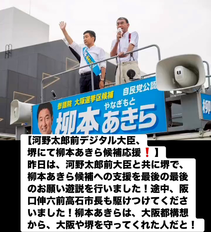 河野太郎前デジタル大臣、堺にて柳本あきら候補応媛! 7月19日 Posted on 2025年7月19日 08:07:012025年9月9日 昨日は、河野太郎前大臣と共に堺で、柳本あきら候補への支援を最後の最後のお願い遊説を行いました!途中、阪口伸六前高石市長も駆けつけてくださいました!柳本あきらは、大阪都構想から、大阪や堺を守ってくれた人だと! のりこの活動日記, 自民党大阪