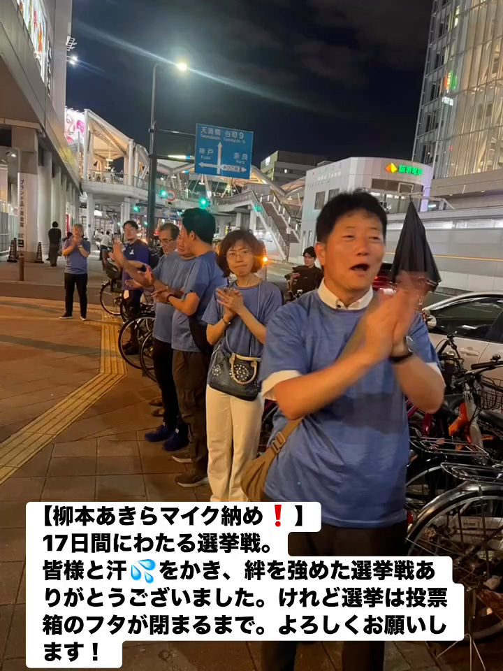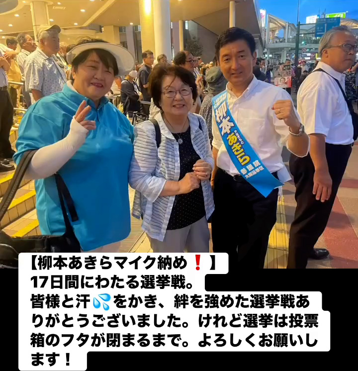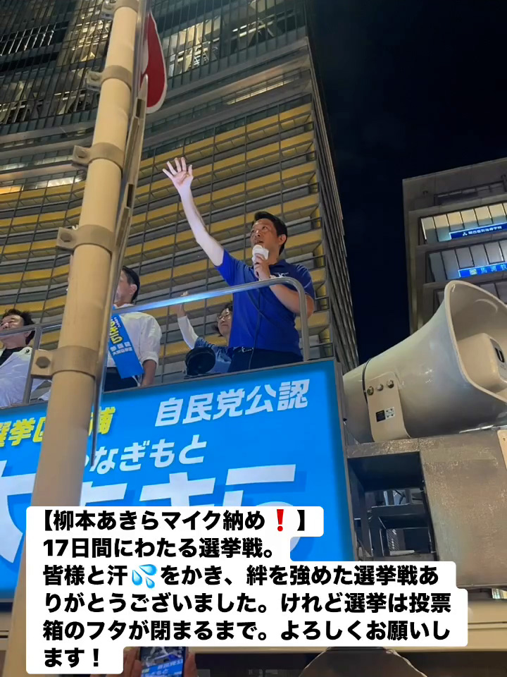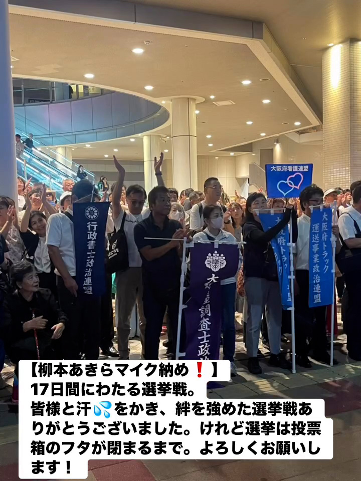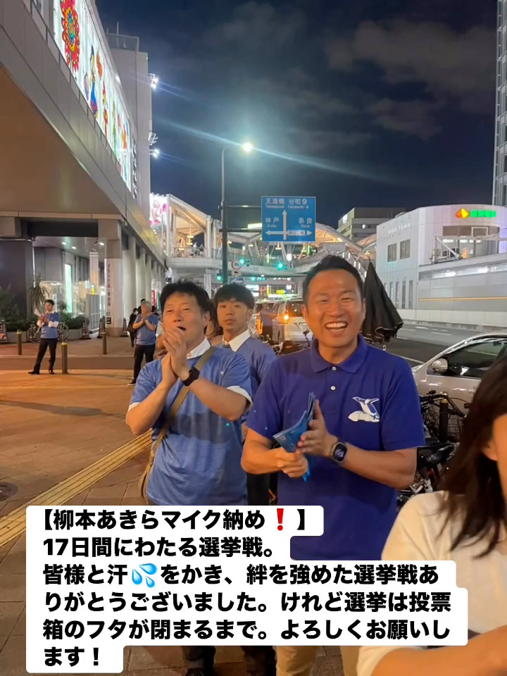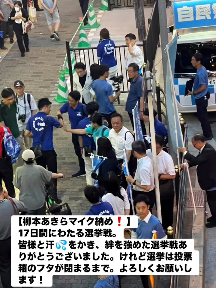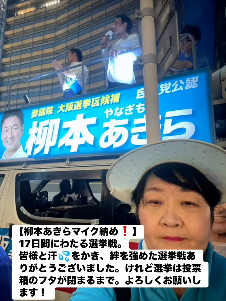 柳本あきらマイク納め! 7月19日 Posted on 2025年7月19日 22:13:042025年9月9日 17日間にわたる選挙戦。皆様と汗💦をかき、絆を強めた選挙戦ありがとうこざいました。 けれど選挙は投票箱のフタが閉まるまで。よろしくお願いします! のりこの活動日記, 自民党大阪