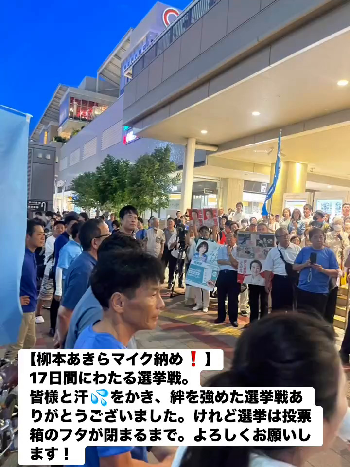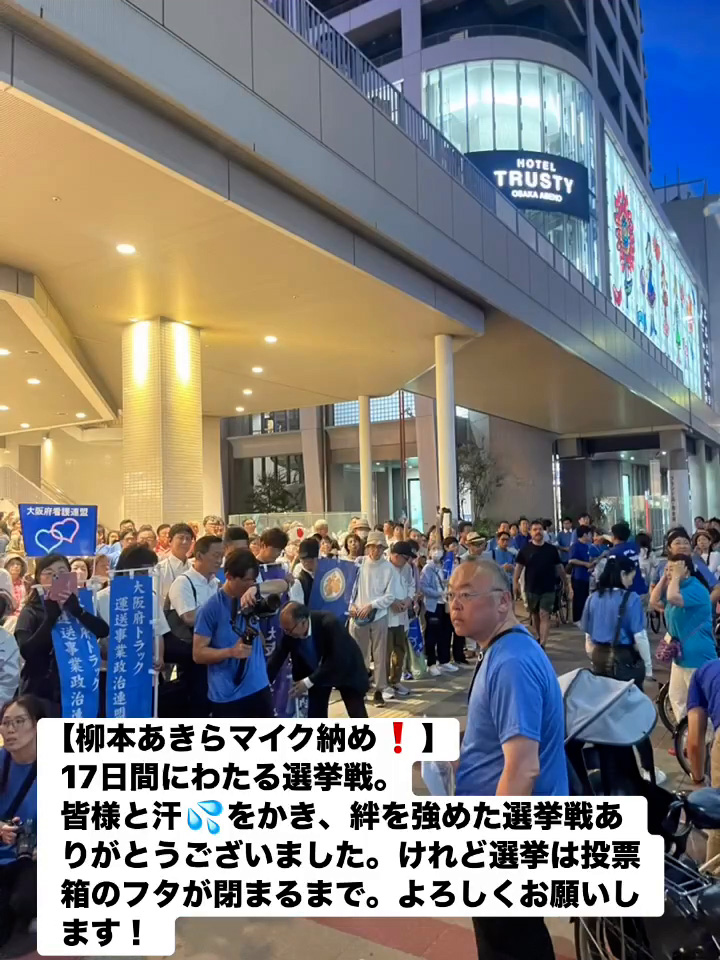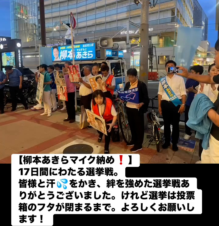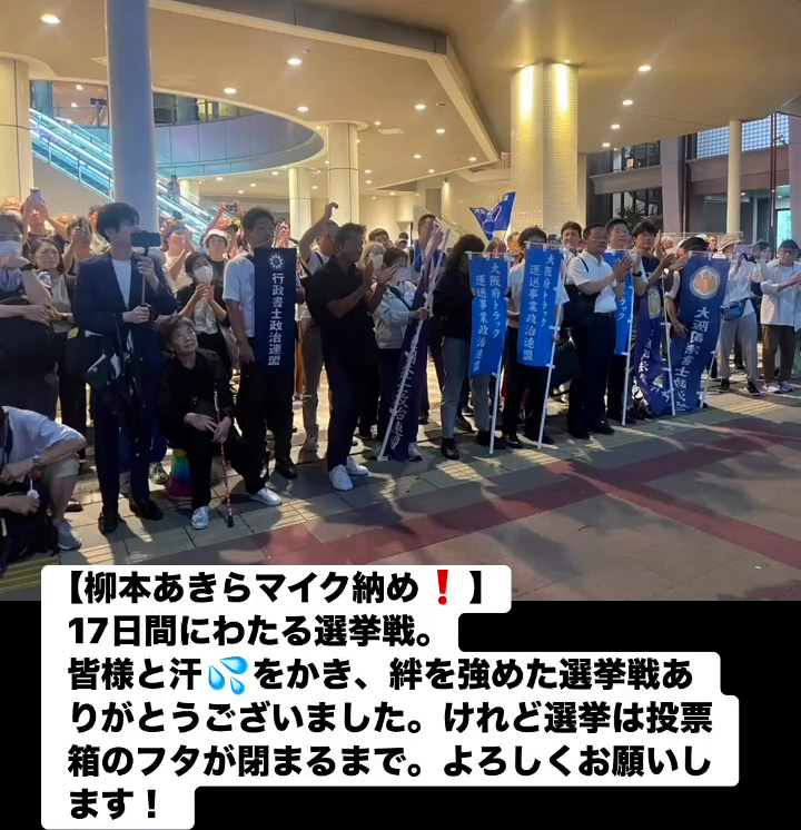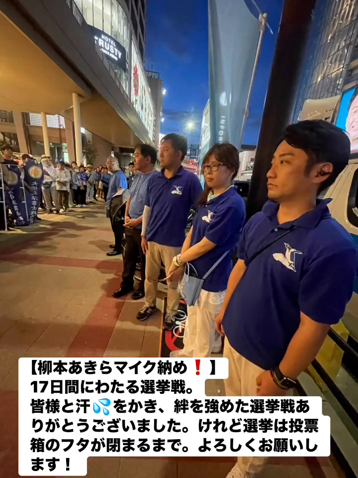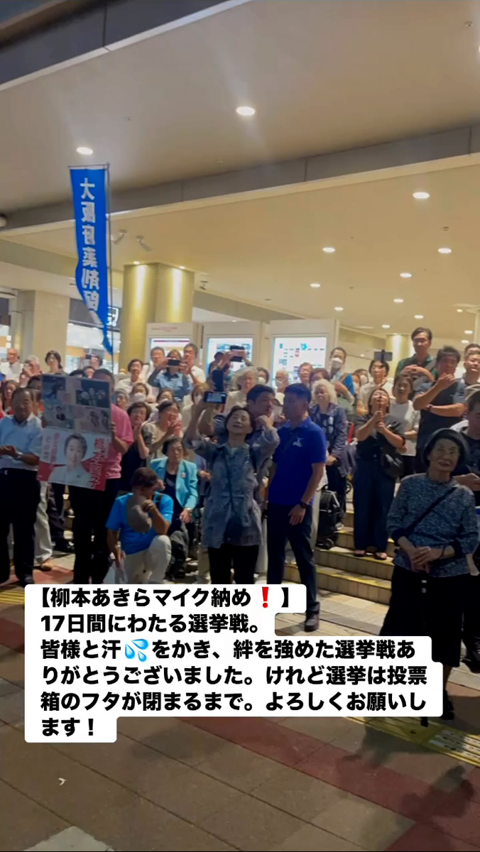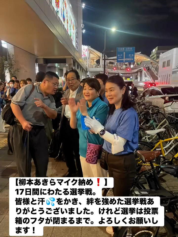 柳本あきらマイク納め! 7月19日 Posted on 2025年7月19日 22:13:042025年9月9日 17日間にわたる選挙戦。皆様と汗💦をかき、絆を強めた選挙戦ありがとうこざいました。 けれど選挙は投票箱のフタが閉まるまで。よろしくお願いします! のりこの活動日記, 自民党大阪