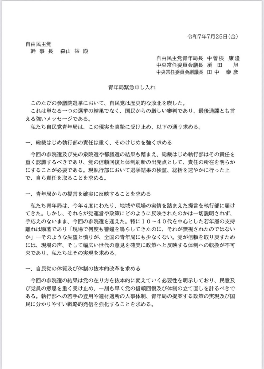 ちなみに党本部青年局が森山幹事長に提出した「緊急申し入れ」について、大阪府連青年局も同意しておられますので、内容を理解するために掲載しておきます。