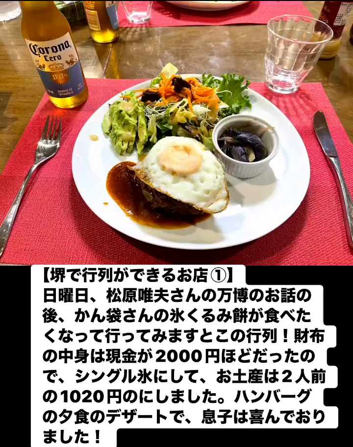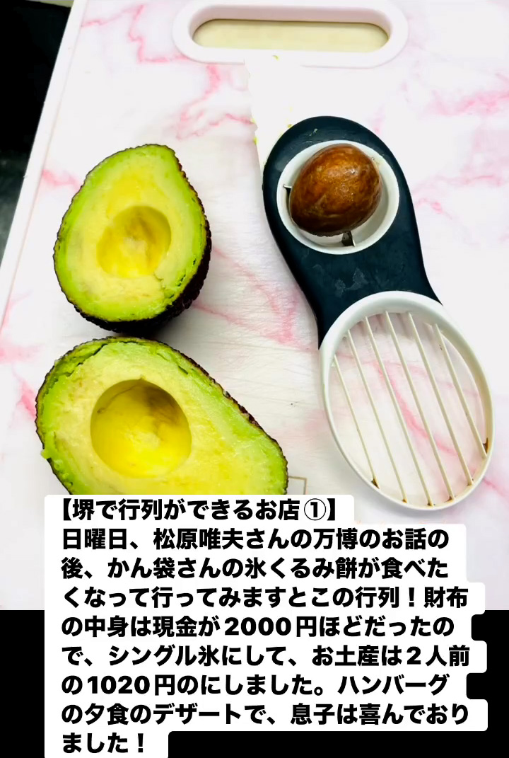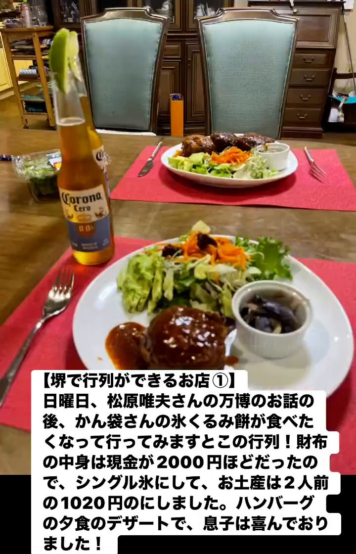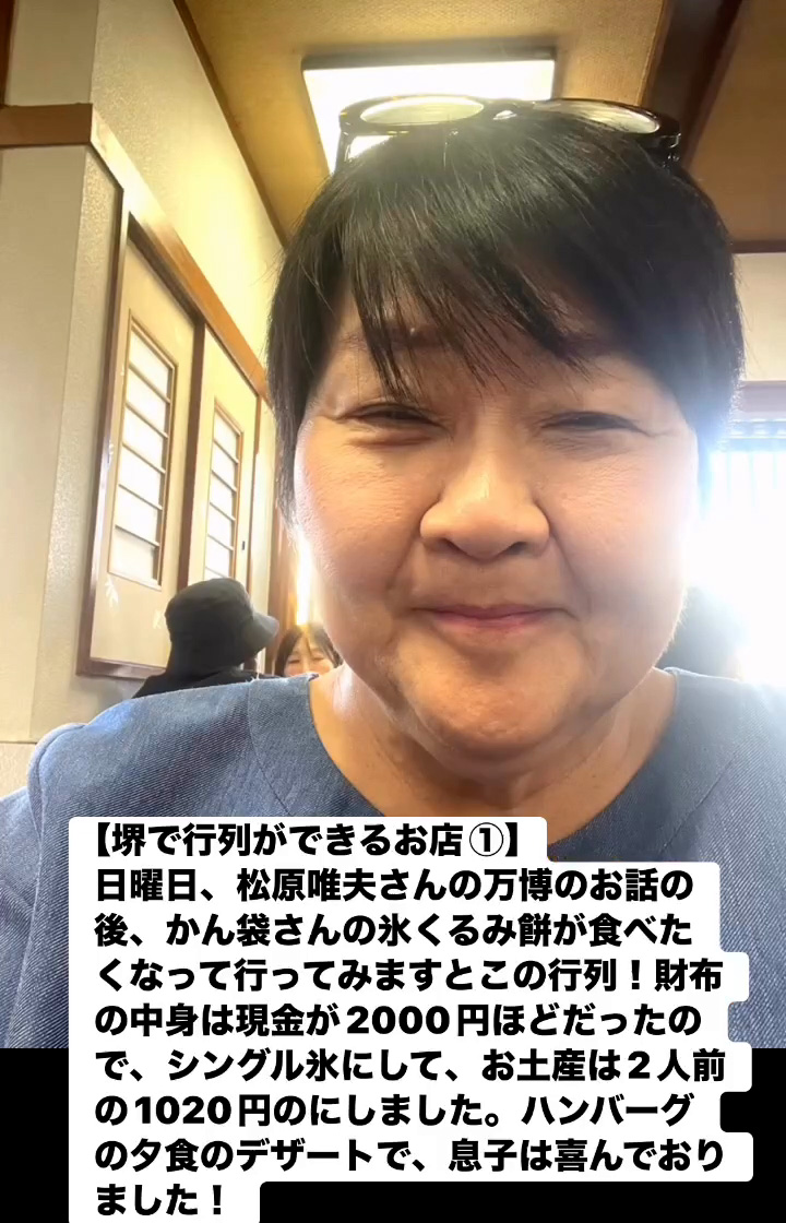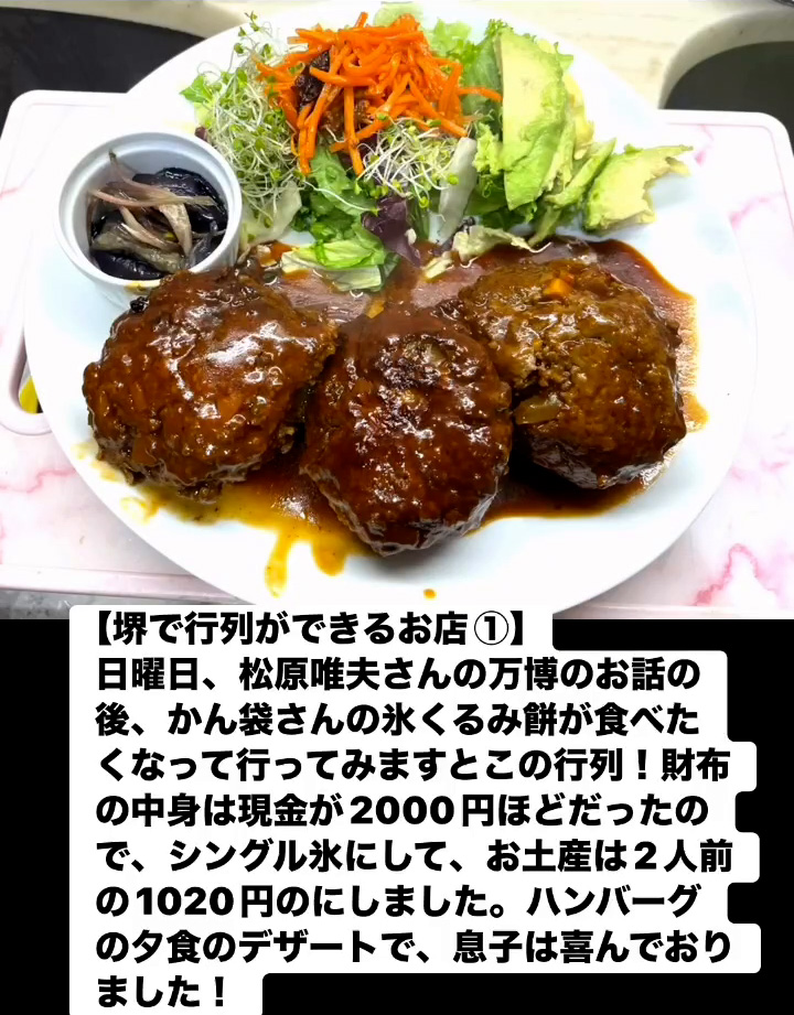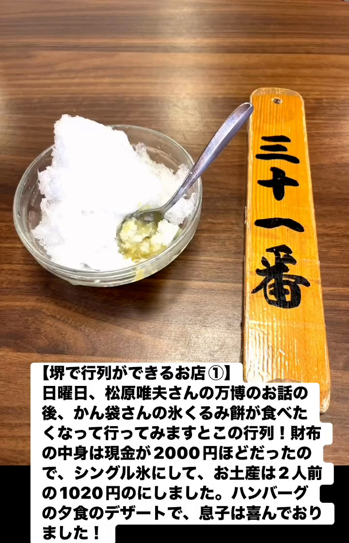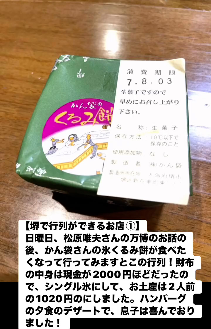 堺で行列ができるお店① 8月4日 Posted on 2025年8月4日 23:55:022025年9月9日 日曜日、松原唯夫さんの万博のお話の後、かん袋さんの氷くるみ餅が食べたくなって行ってみますとこの行列!財布の中身は現金が2000円ほどだったので、シングル氷にして、お土産は2人前の1020円のにしました。 ハンバーグの夕食のデザートで、息子は喜んでおりました! のりこの活動日記, のりこの部屋