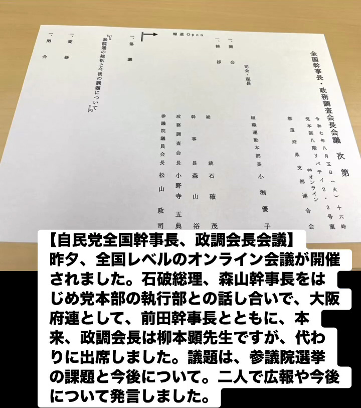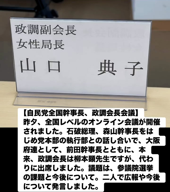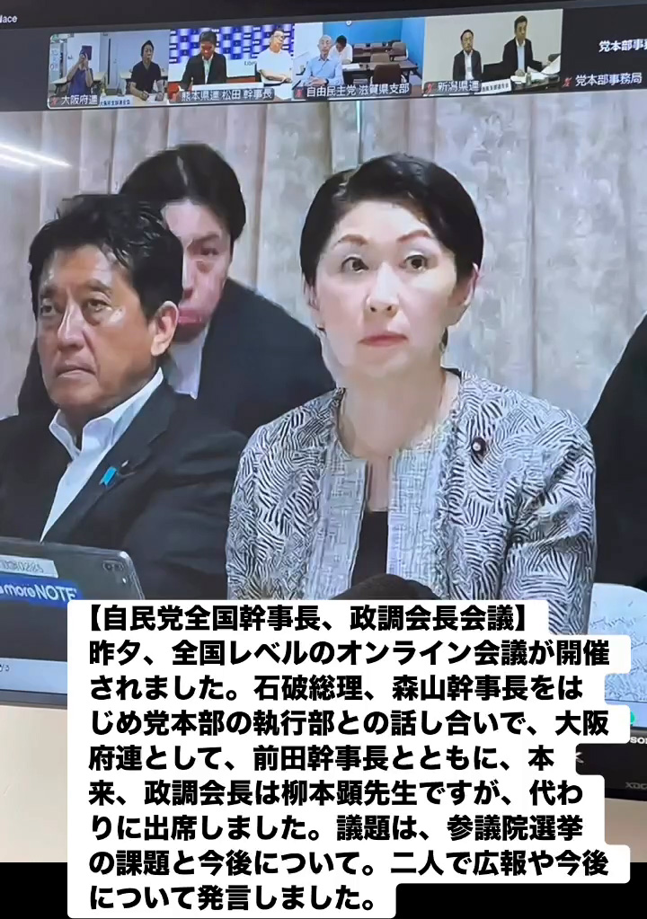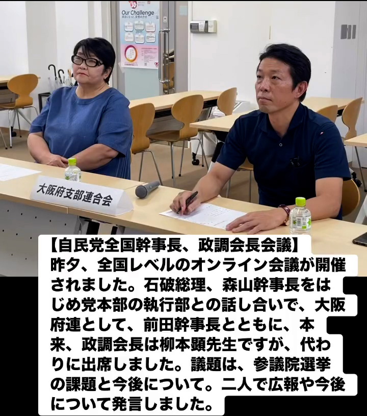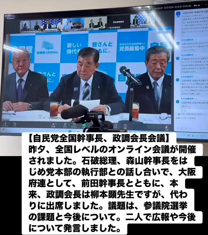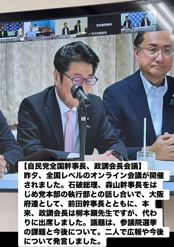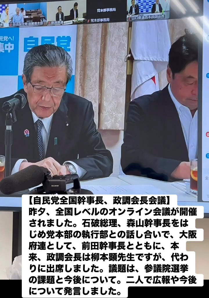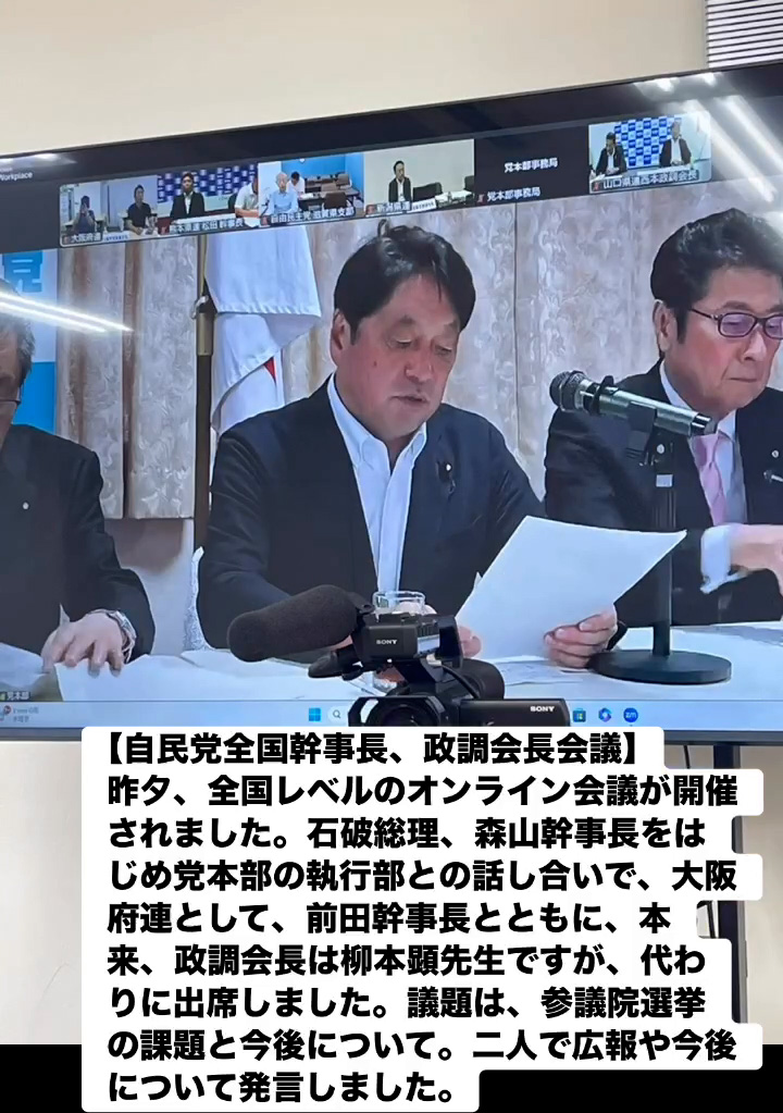 昨夕、全国レベルのオンライン会議が開催されました。石破総理、森山幹事長をはじめ党本部の執行部との話し合いで、大阪府運として、前田幹事長とともに、本来、政調会長は柳本顕先生ですが、代わりに出席しました。議題は、参議院選挙の課題と今後について。二人で広報や今後について発言しました。