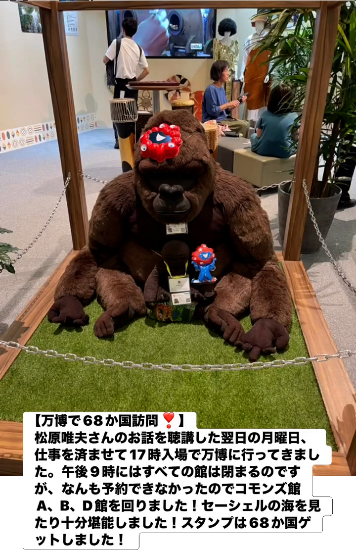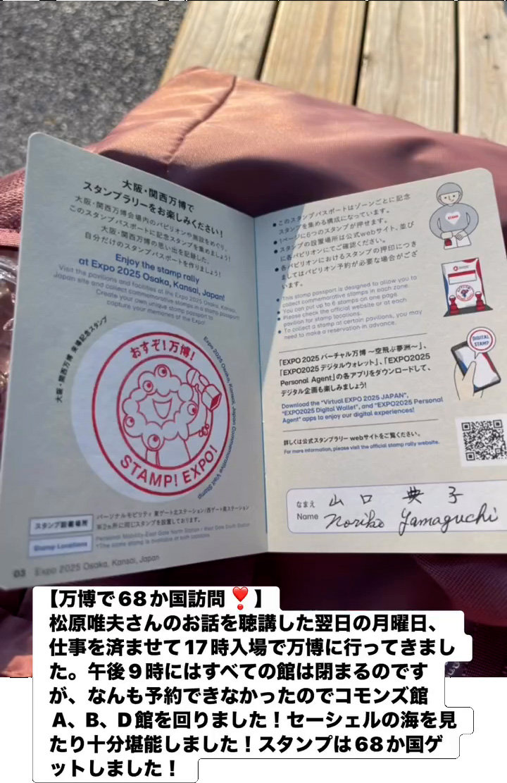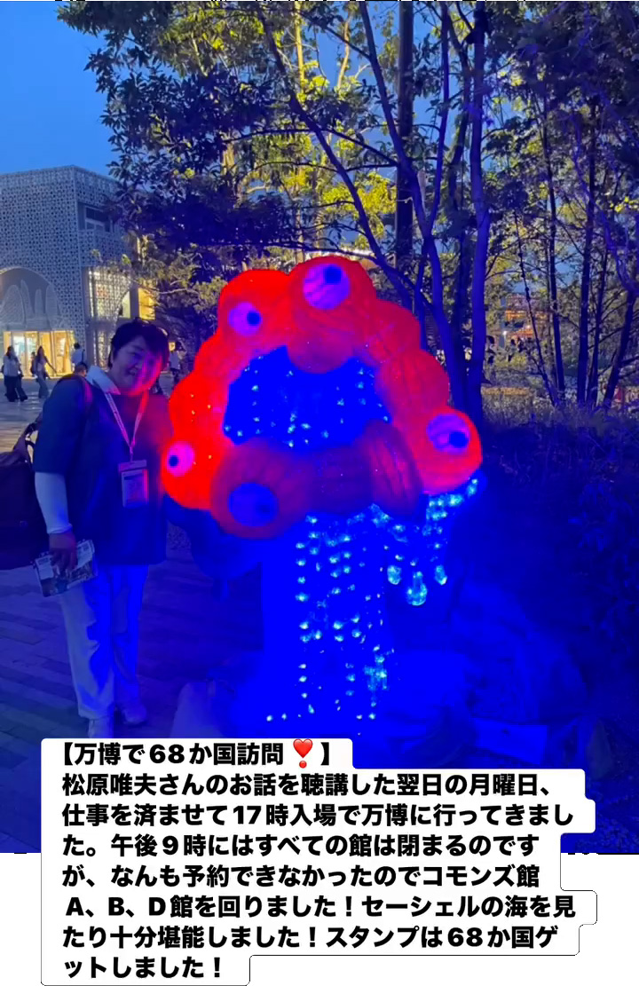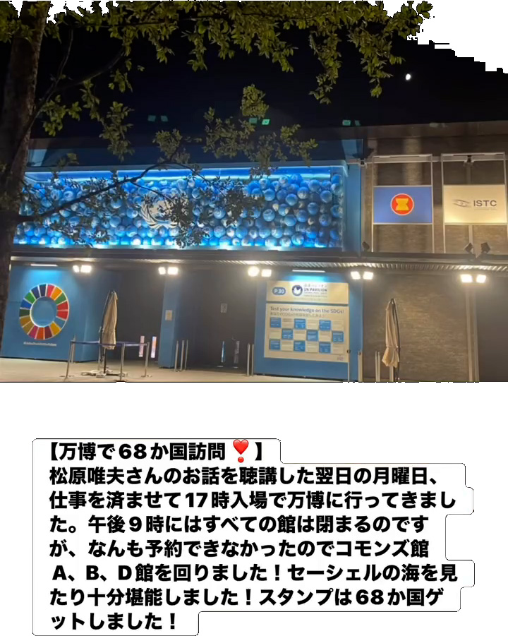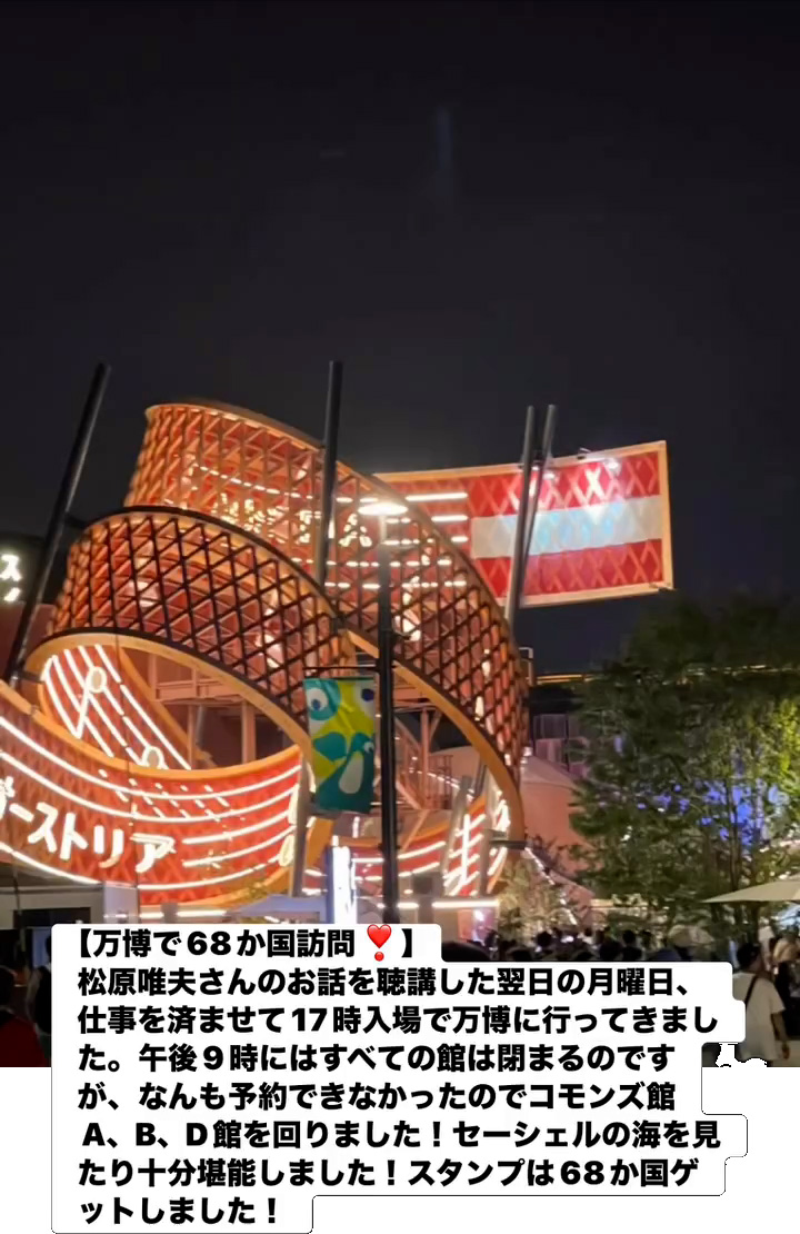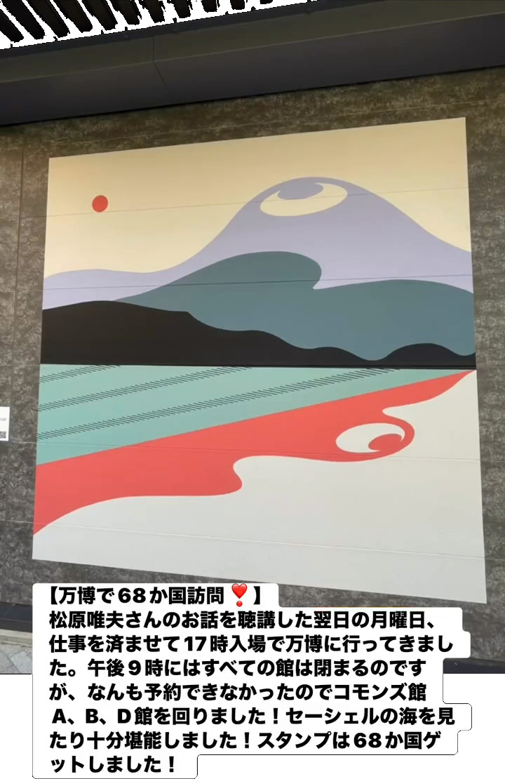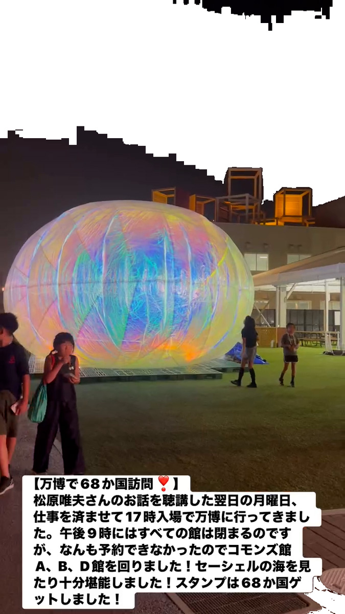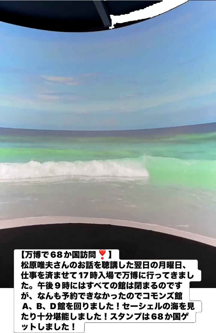 万博で68か国訪問! 8月7日 Posted on 2025年8月7日 03:58:022025年9月9日 松原唯夫さんのお話を聴講した翌日の月曜日、仕事を済ませて17時入場で万博に行ってきました。午後9時にはすべての館は閉まるのですが、なんも予約できなかったのでコモンズ館A、B、D館を回りました!セーシェルの海を見たり十分堪能しました!スタンプは68か国ゲットしました! のりこの活動日記, のりこの部屋