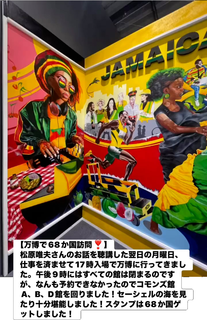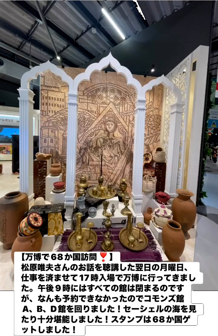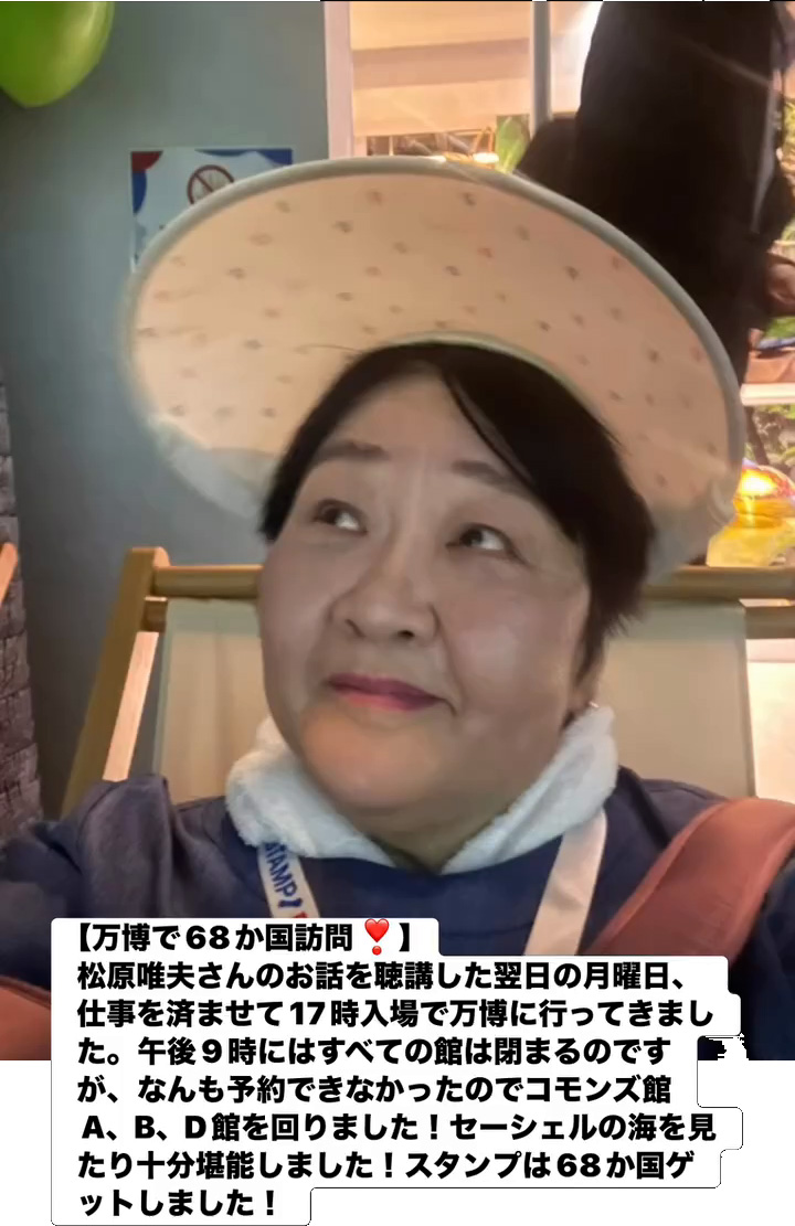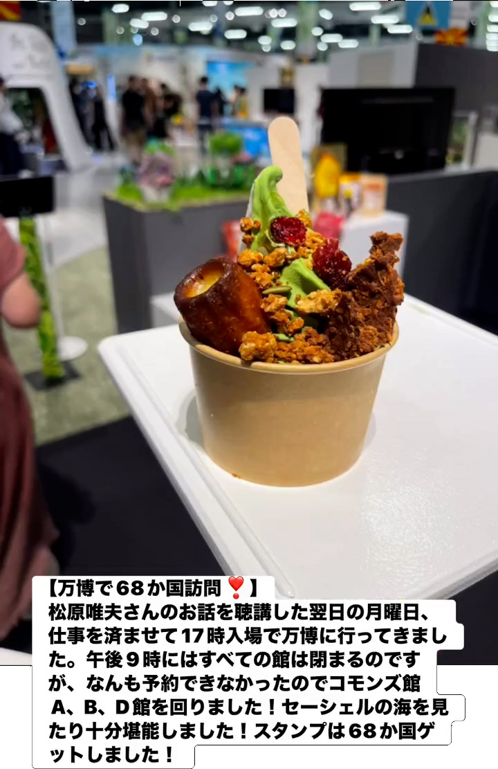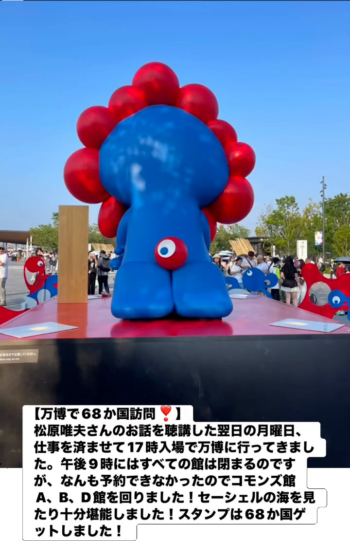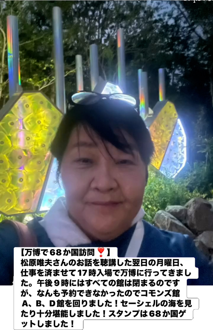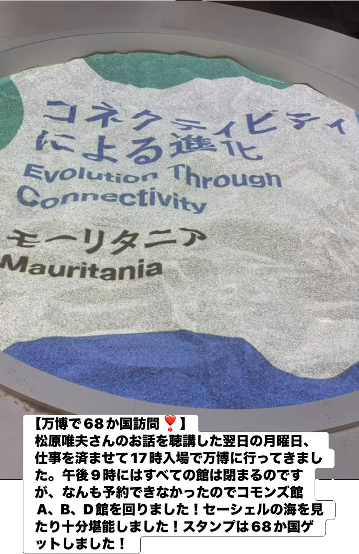 万博で68か国訪問! 8月7日 Posted on 2025年8月7日 03:58:022025年9月9日 松原唯夫さんのお話を聴講した翌日の月曜日、仕事を済ませて17時入場で万博に行ってきました。午後9時にはすべての館は閉まるのですが、なんも予約できなかったのでコモンズ館A、B、D館を回りました!セーシェルの海を見たり十分堪能しました!スタンプは68か国ゲットしました! のりこの活動日記, のりこの部屋