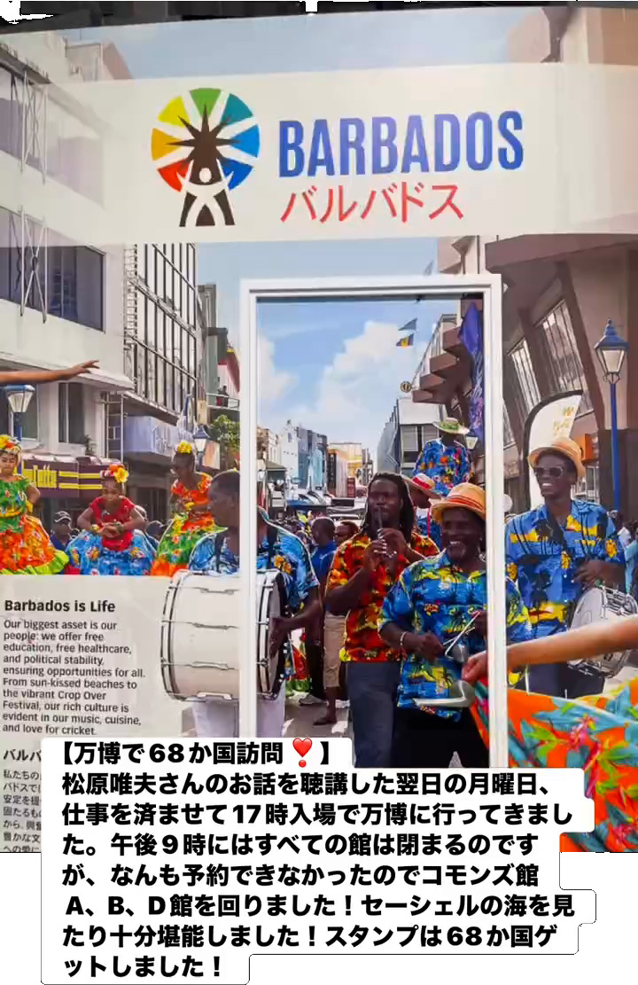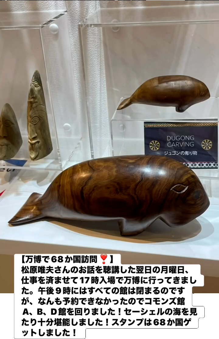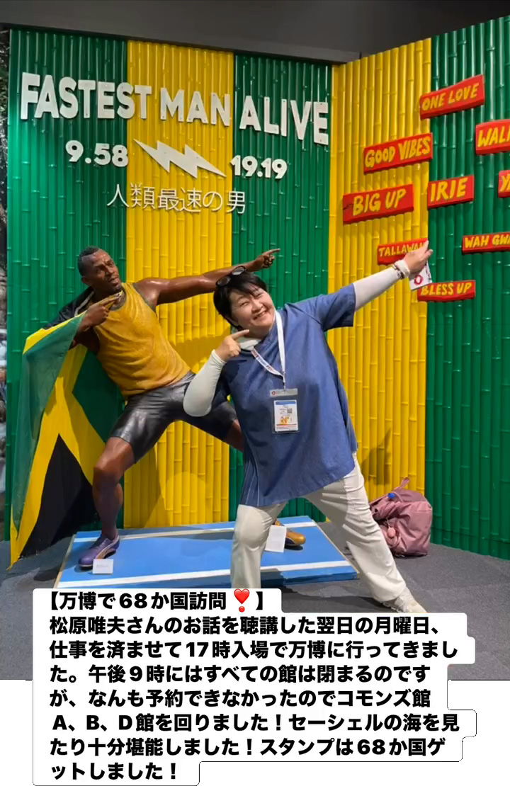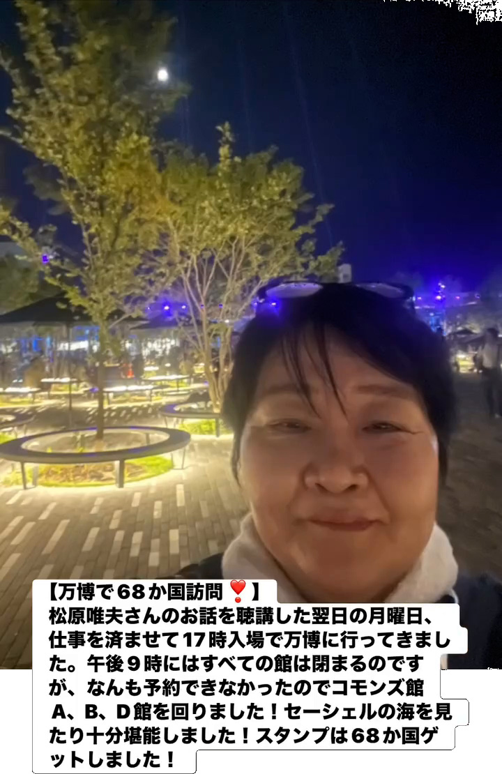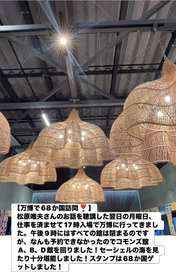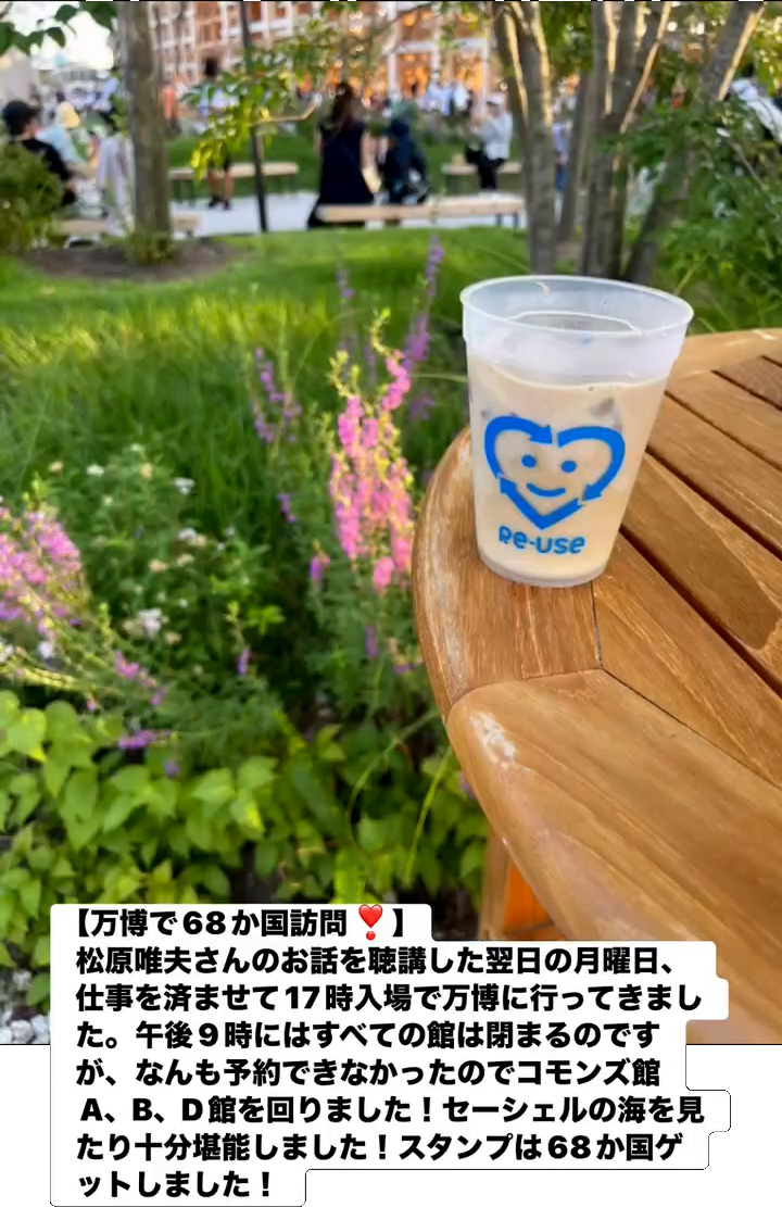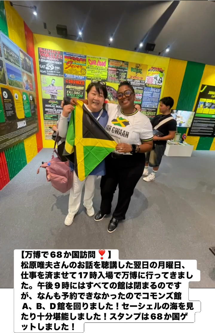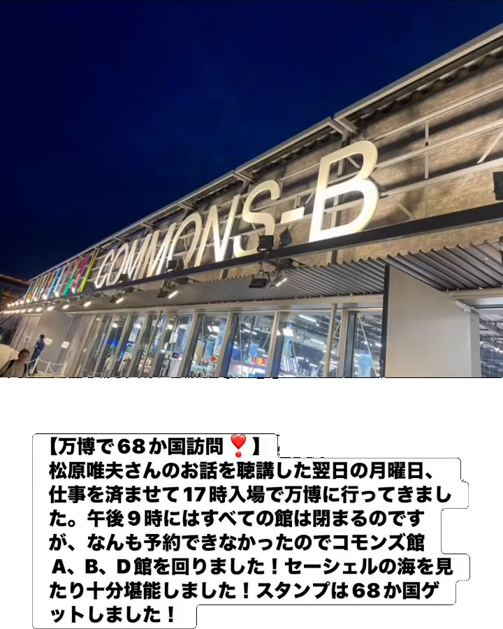万博で68か国訪問! 8月7日 Posted on 2025年8月7日 03:58:022025年9月9日 松原唯夫さんのお話を聴講した翌日の月曜日、仕事を済ませて17時入場で万博に行ってきました。午後9時にはすべての館は閉まるのですが、なんも予約できなかったのでコモンズ館A、B、D館を回りました!セーシェルの海を見たり十分堪能しました!スタンプは68か国ゲットしました! のりこの活動日記, のりこの部屋