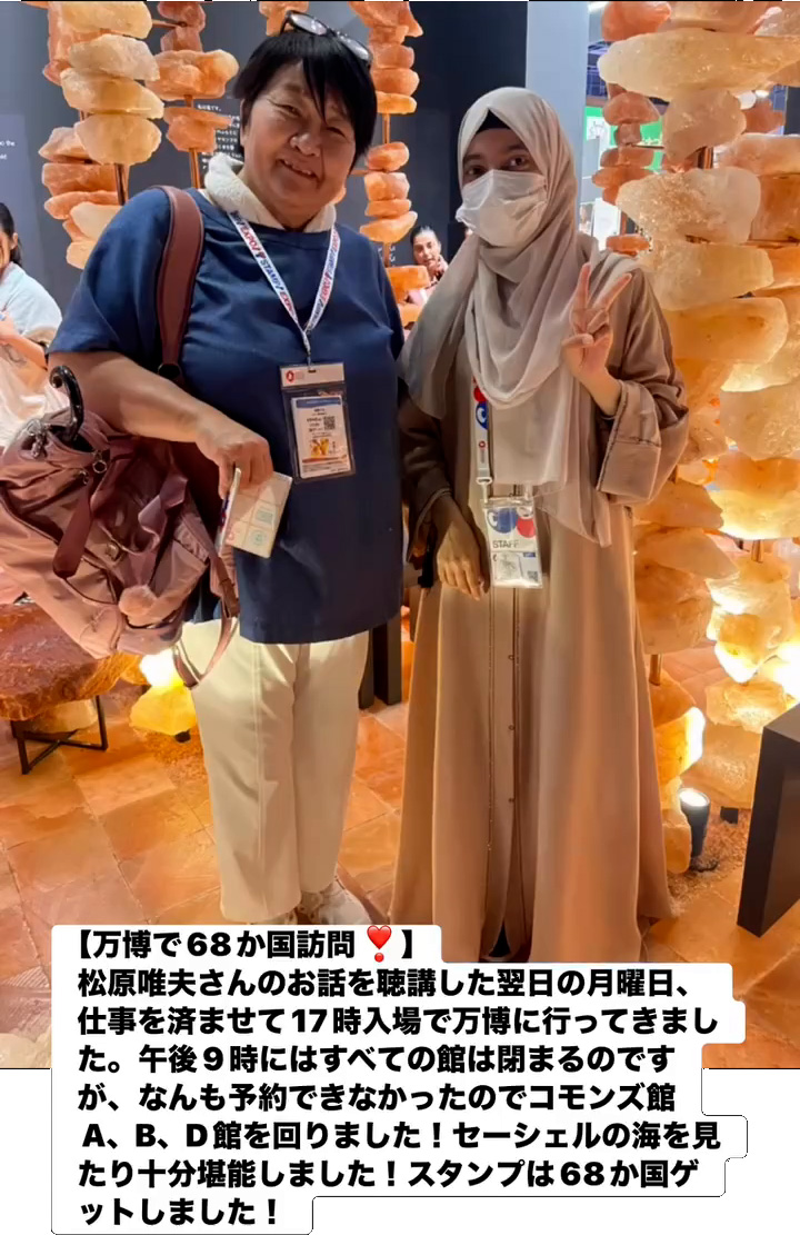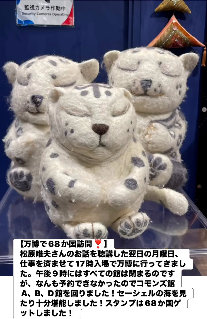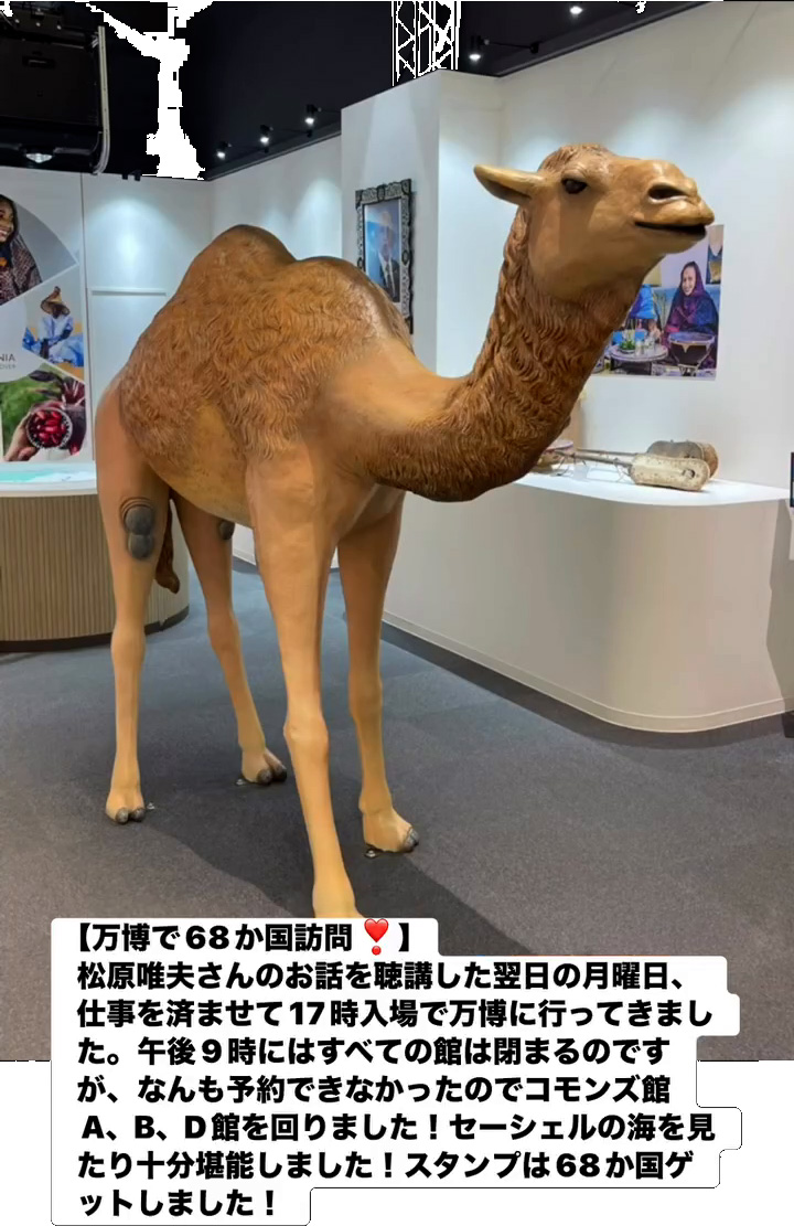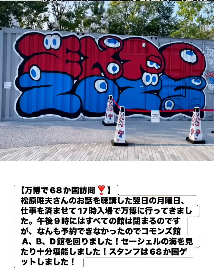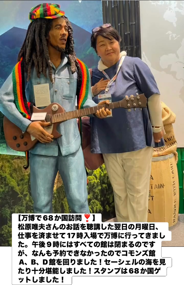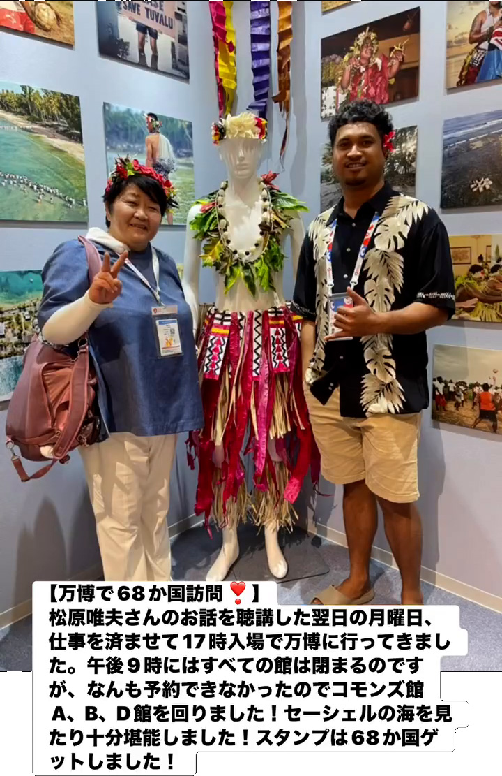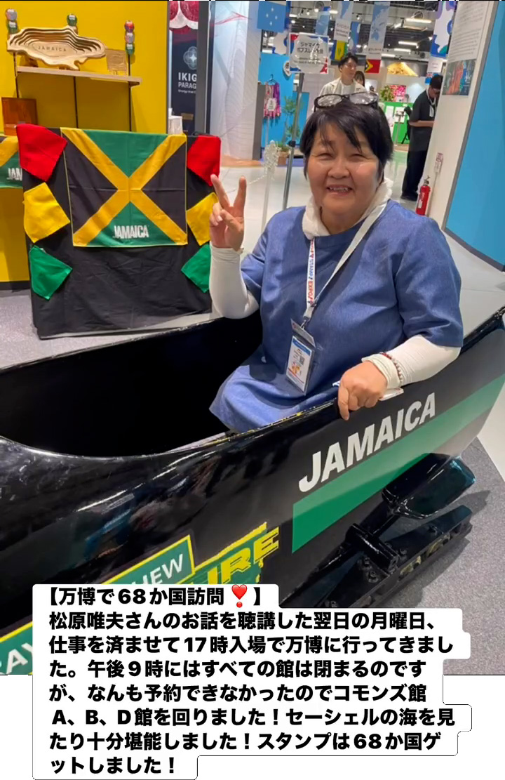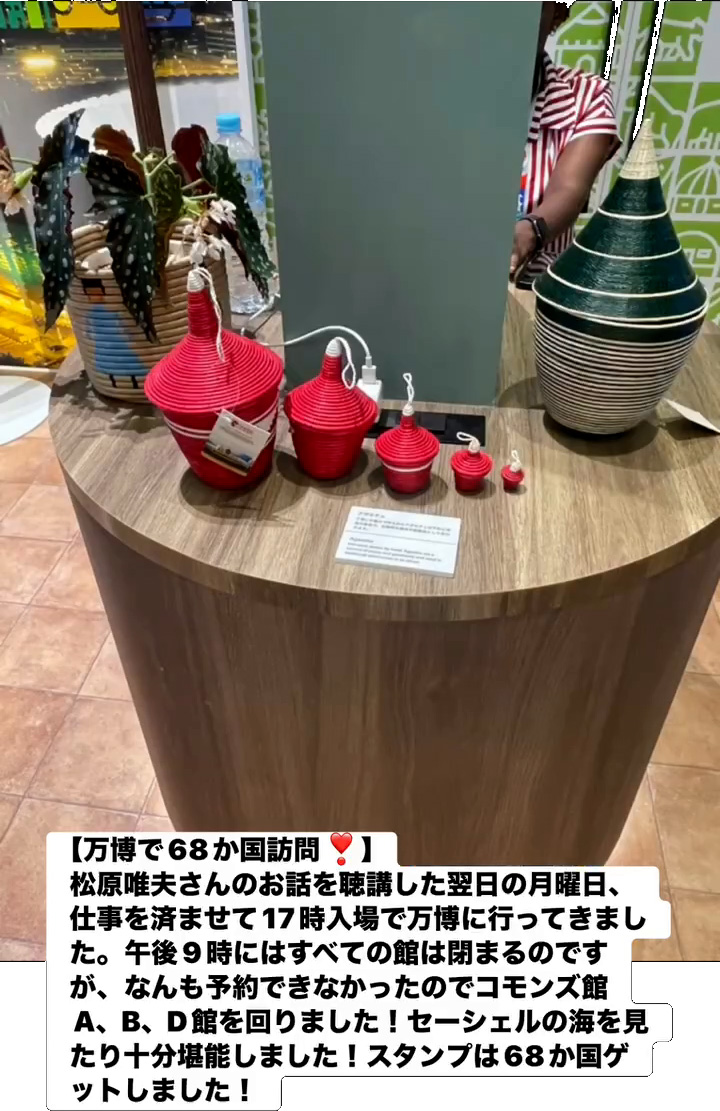 万博で68か国訪問! 8月7日 Posted on 2025年8月7日 03:58:022025年9月9日 松原唯夫さんのお話を聴講した翌日の月曜日、仕事を済ませて17時入場で万博に行ってきました。午後9時にはすべての館は閉まるのですが、なんも予約できなかったのでコモンズ館A、B、D館を回りました!セーシェルの海を見たり十分堪能しました!スタンプは68か国ゲットしました! のりこの活動日記, のりこの部屋