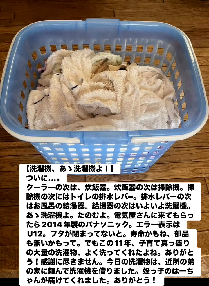 ついに…。クーラーの次は、炊飯器。炊飯器の次は掃除機。掃除機の次にはトイレの緋水レバー。緋水レバーの次はお風呂の給湯器。給湯器の次はいよいよ洗濯機。あヽ洗濯機よ。たのむよ。電気屋さんに来てもらったら2014年製のパナソニック。エラー表示はU12。フタが閉まってないと。寿命かもね、部品も無いかもって。でもこの11年、子育て真っ盛りの大量の洗濯物、よく洗ってくれたよね。ありがとう!感謝に尽きません。今日の洗濯物は、近所の弟の家に頼んで洗濯機を借りました。姪っ子のはーちゃんが届けてくれました。ありがとう!