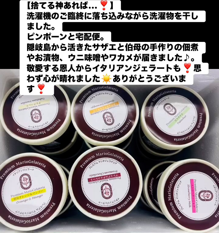 洗濯機のご臨終に落ち込みながら洗濯物を干しました。ピンポーンと宅配便。隠岐島から活きたサザエと伯母の手作りの佃煮やお漬物、ウニ昧噌やワカメが届きました♪。敬愛する恩人からイタリアンジェラートも❣思わず心が晴れました☀ありがとうこざいます❣
