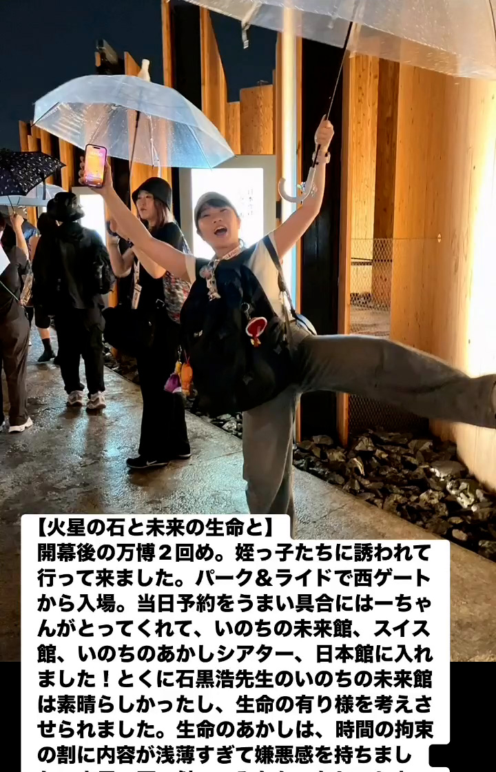 火星の石と未来の生命と 8月12日 Posted on 2025年8月12日 00:10:012025年9月9日 開幕後の万博2回め。姪っ子たちに誘われて行って来ました。パーク&ライドで西ゲートト から入場。当日予約をうまい具合にはーちゃんがとってくれて、いのちの未来館、スイス館、いのちのあかしシアター、日本館に入れました!とくに石黒浩先生のいのちの未来館は素晴らしかったし、生命の有り様を考えさせられました。生命のあかしは、時間の拘束の割に内容が浅薄すぎて嫌悪感を持ちました。 のりこの活動日記, のりこの部屋