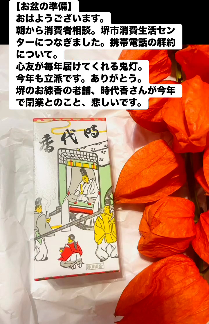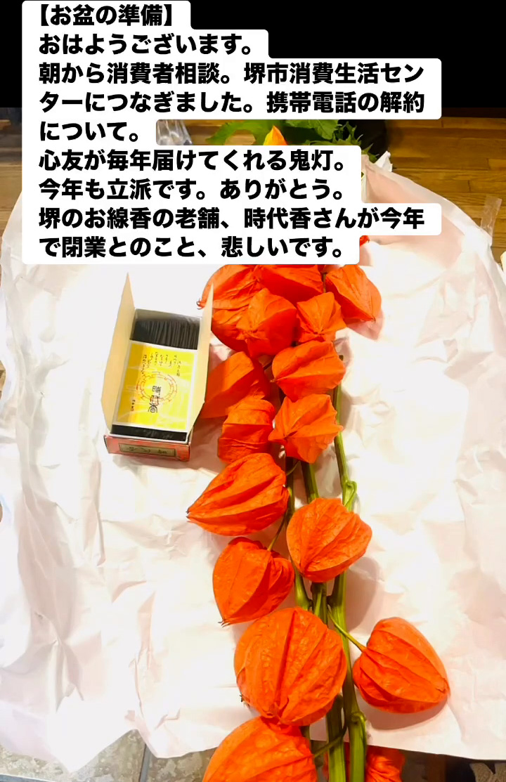 お盆の準備 8月12日 Posted on 2025年8月12日 10:17:022025年9月9日 おはようこざいます。 朝から消費者相談。堺市消費生活センターにつなぎました。携帯電話の解約について。 心友が毎年届けてくれる鬼灯。 今年も立派です。 ありがとう。堺のお線香の老舗、 時代香さんが今年で閉業とのこと、 悲しいです。 のりこの活動日記