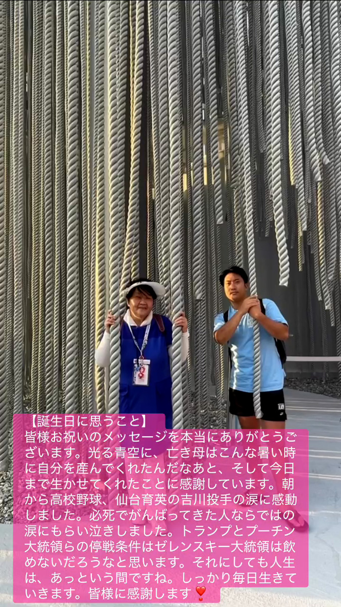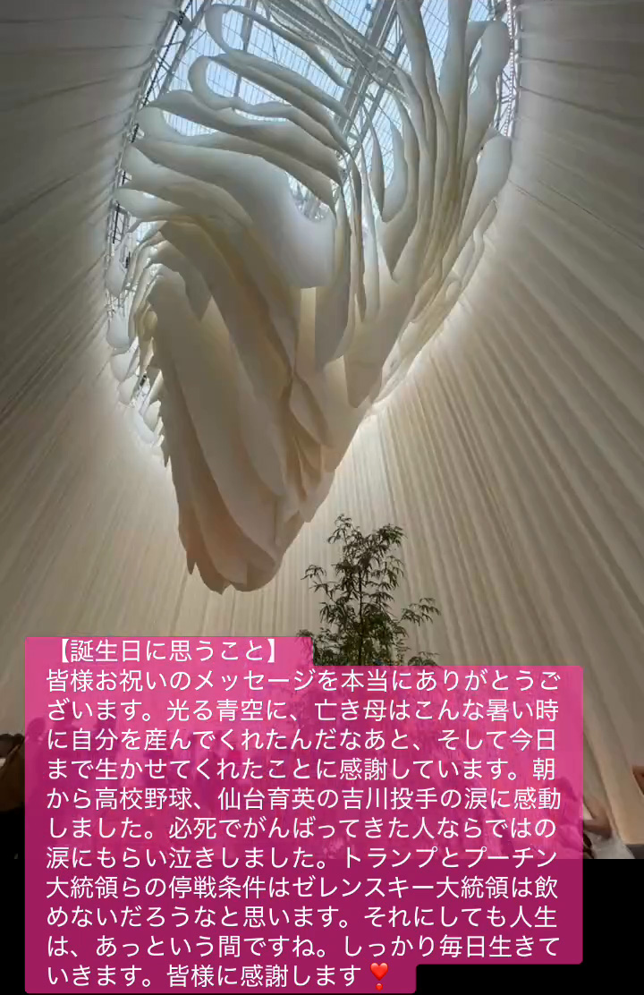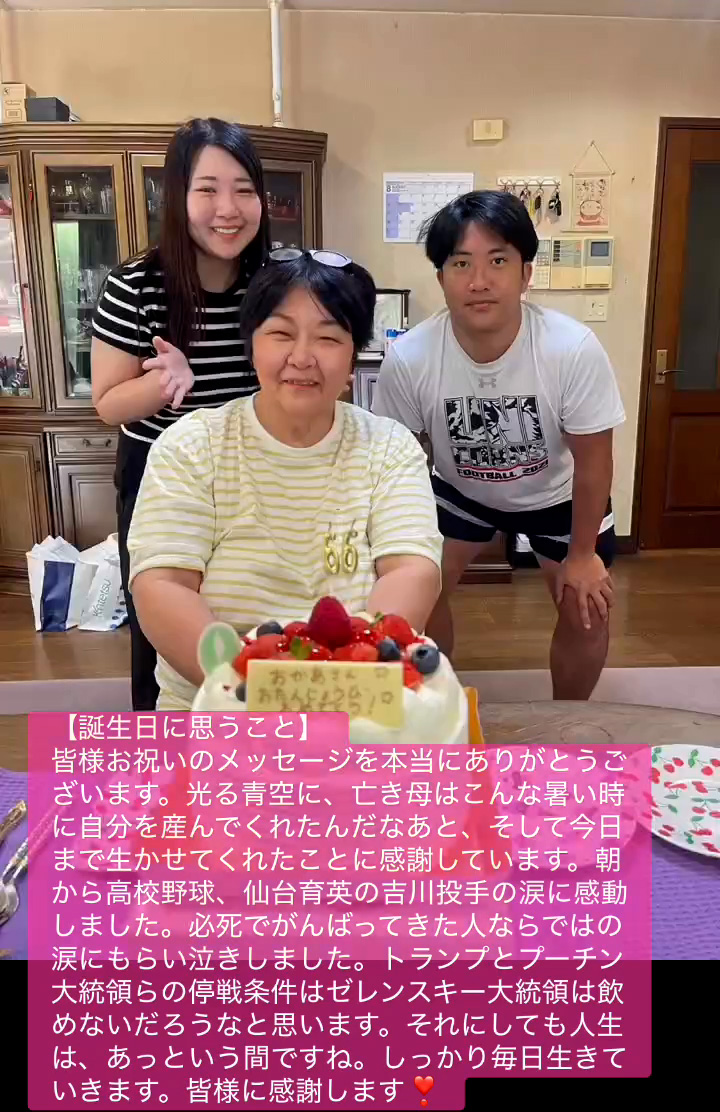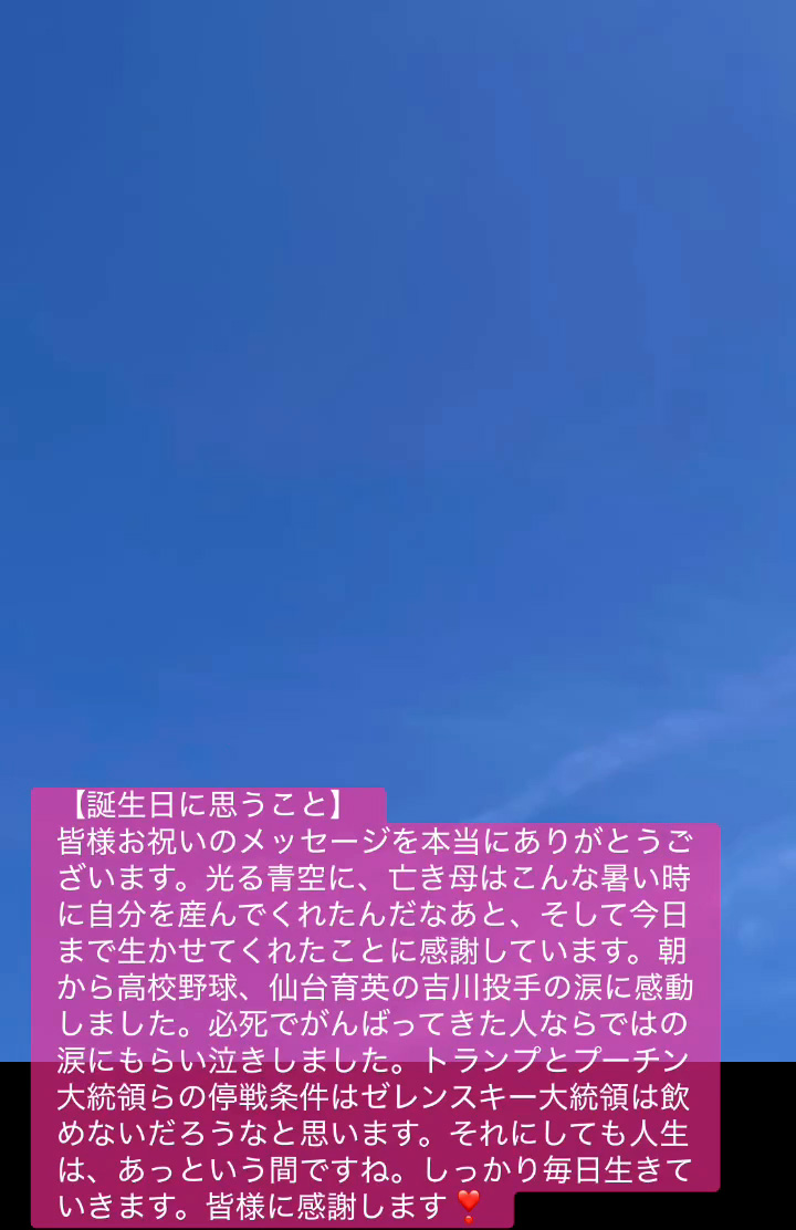 皆様お祝いのメッセージを本当にありがとうこざいます。光る青空に、亡き母はこんな暑い時に自分を産んでくれたんだなあと、そして今日まで生かせてくれたことに感謝しています。朝から高校野球、仙台育英の吉川投手の涙に感動しました。必死でがんばってきた人ならではの涙にもらい泣きしました。トランプとプーチン大統領らの停戦条件はゼレンスキー大統領は飲めないだろうなと思います。それにしても人生は、あっという間ですね。しっかり毎日生きていきます。皆様に感謝します❣