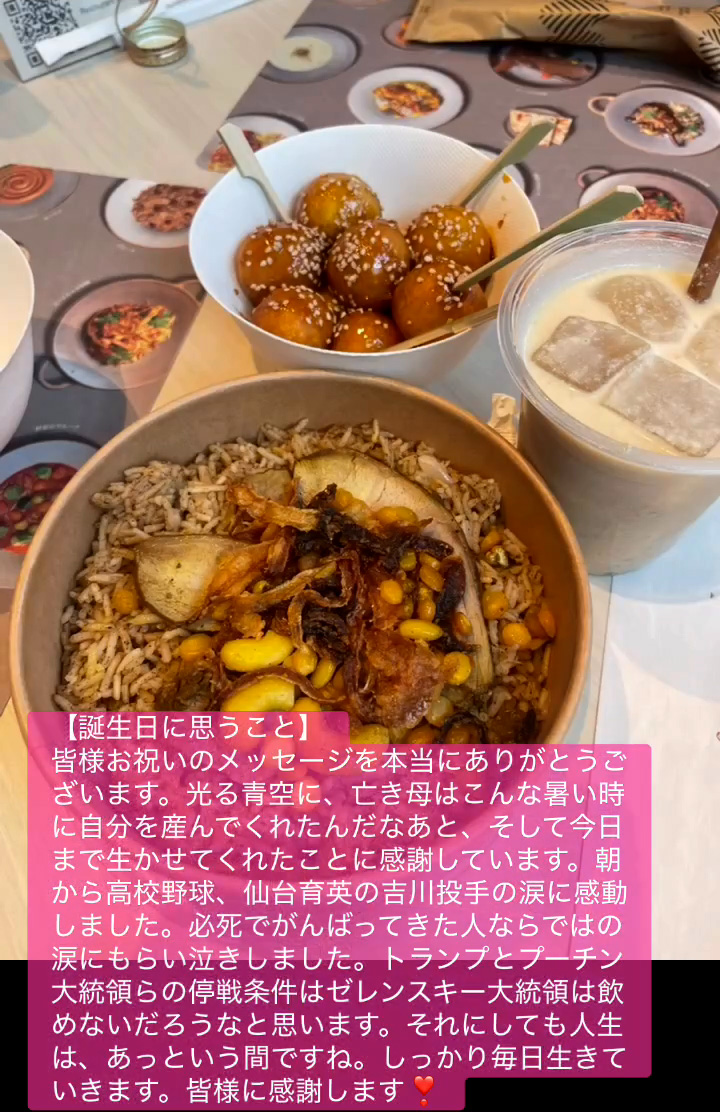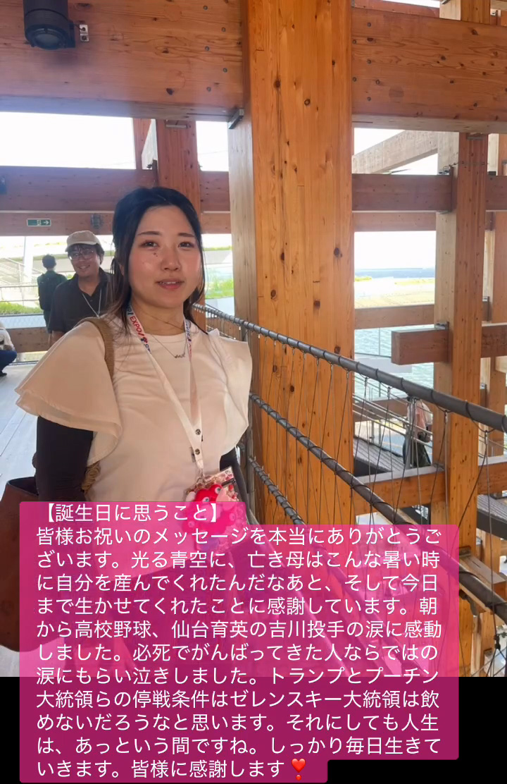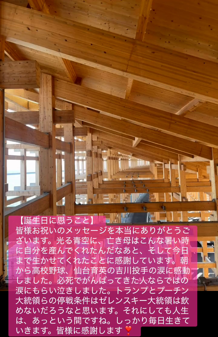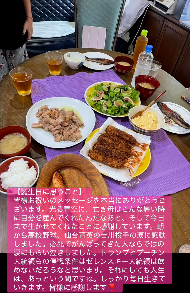 皆様お祝いのメッセージを本当にありがとうこざいます。光る青空に、亡き母はこんな暑い時に自分を産んでくれたんだなあと、そして今日まで生かせてくれたことに感謝しています。朝から高校野球、仙台育英の吉川投手の涙に感動しました。必死でがんばってきた人ならではの涙にもらい泣きしました。トランプとプーチン大統領らの停戦条件はゼレンスキー大統領は飲めないだろうなと思います。それにしても人生は、あっという間ですね。しっかり毎日生きていきます。皆様に感謝します❣