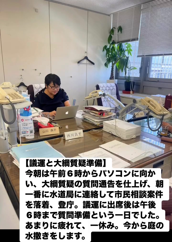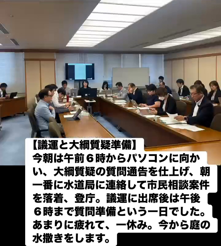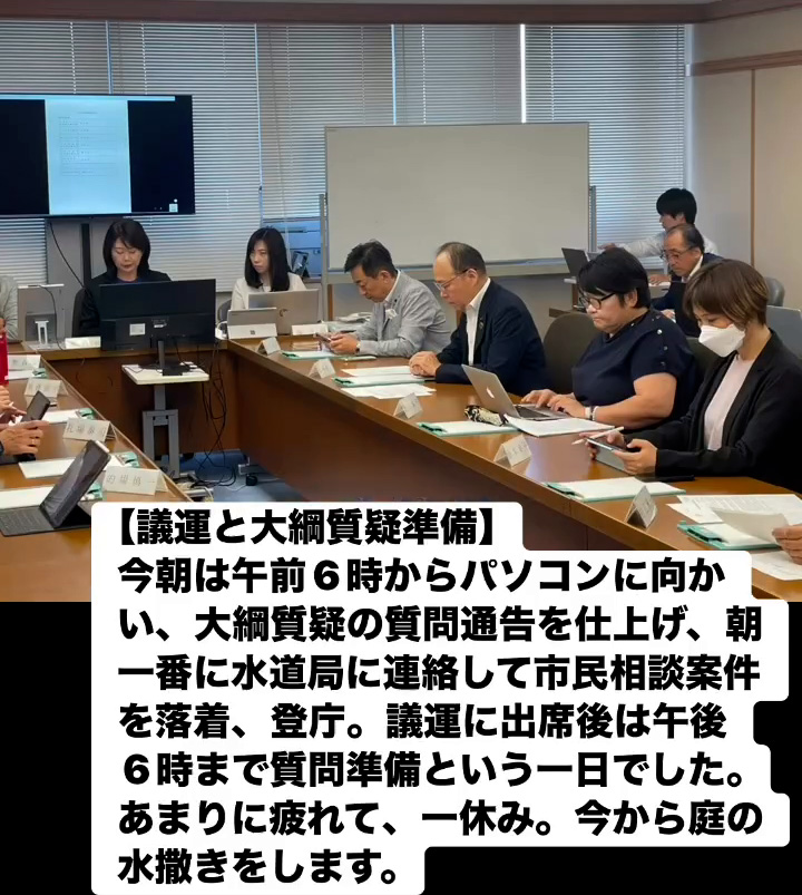 今朝は午前6時からパソコンに向かい、大綱質疑の質問通告を仕上げ、朝朝一番に水道局に連絡して市民相談案件を落着、登庁。議運に出席後は午後6時まで質問準備という一日でした。あまりに疲れて、一休み。今から庭の水撒きをします。