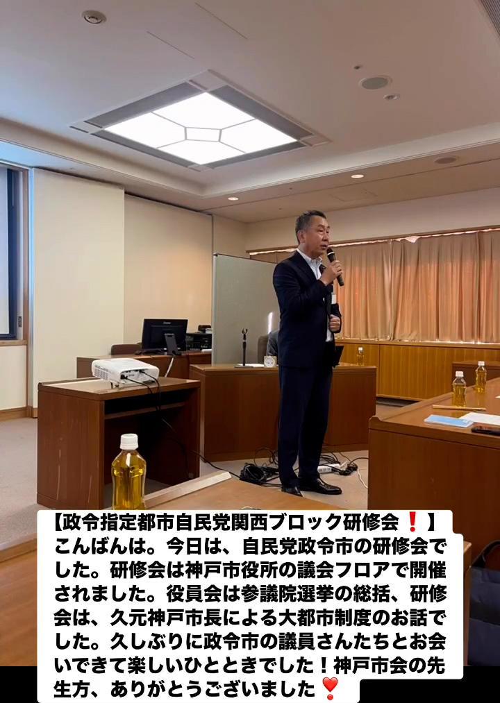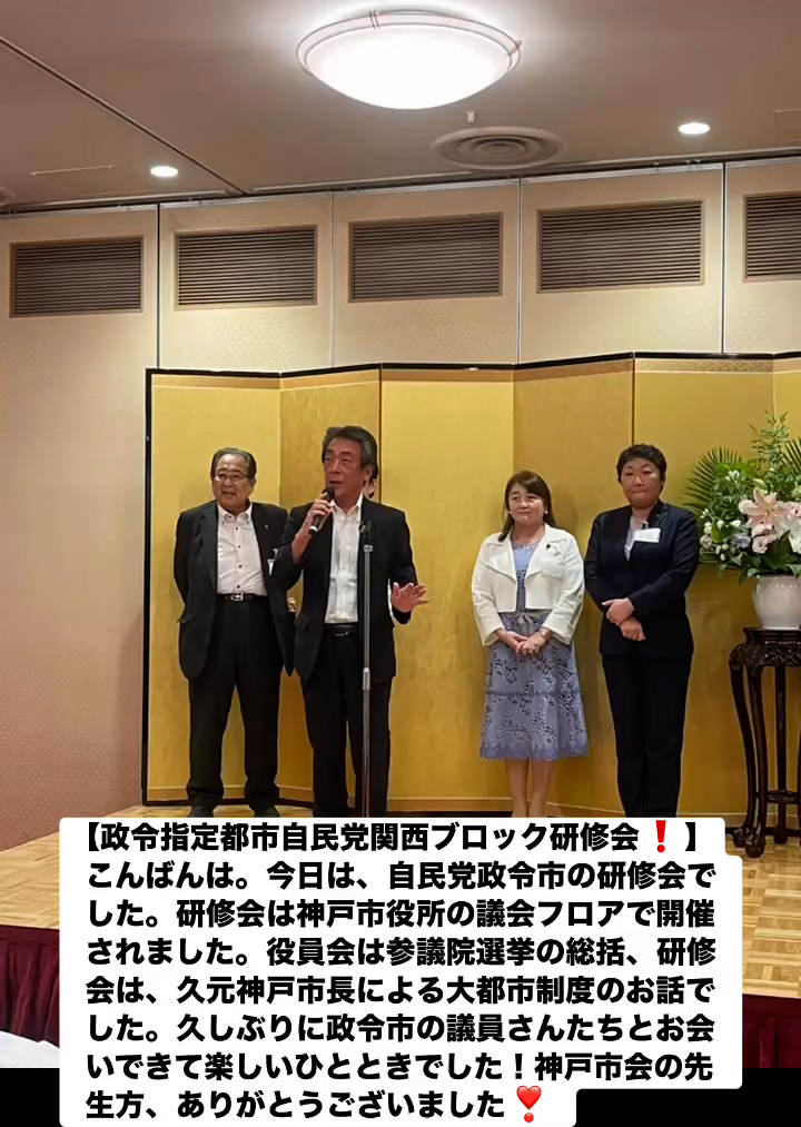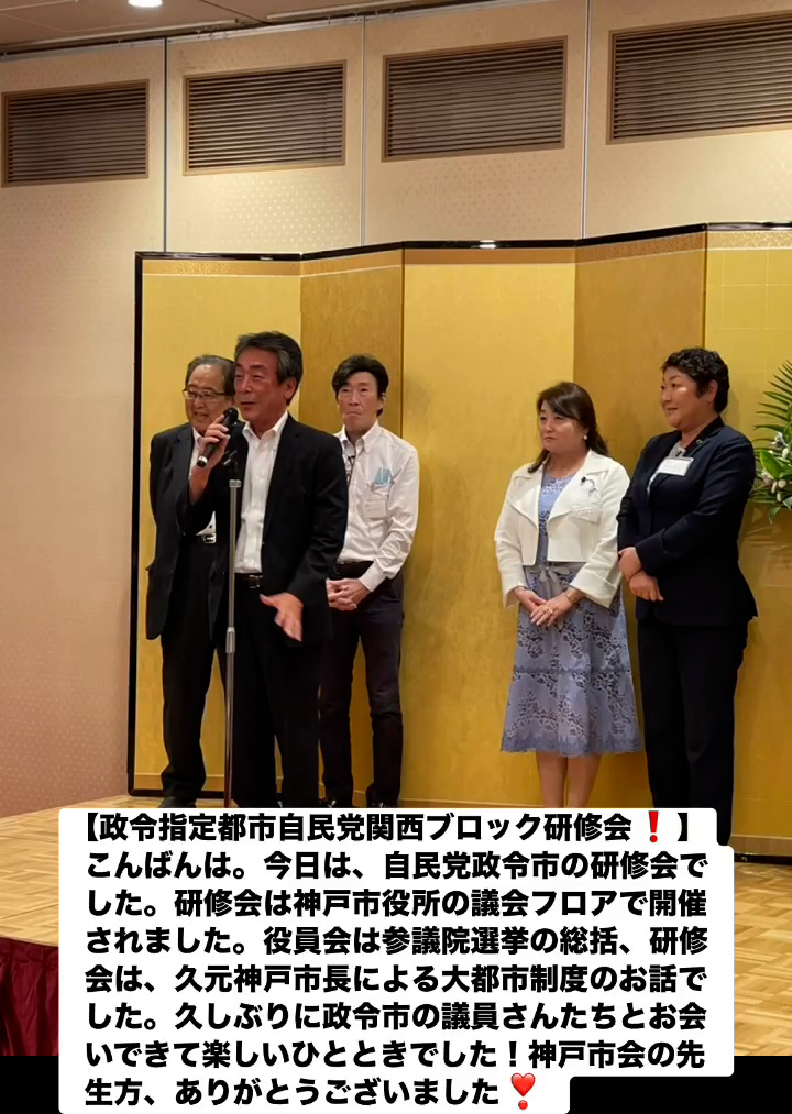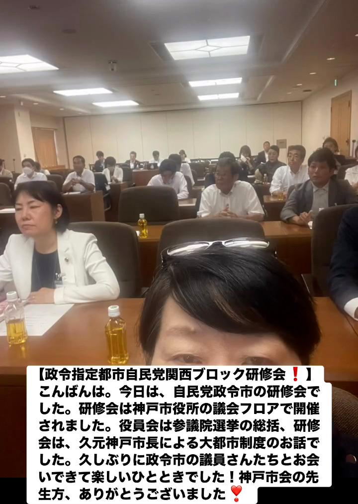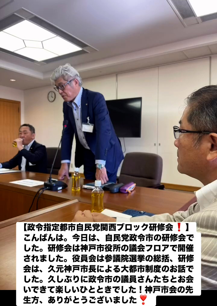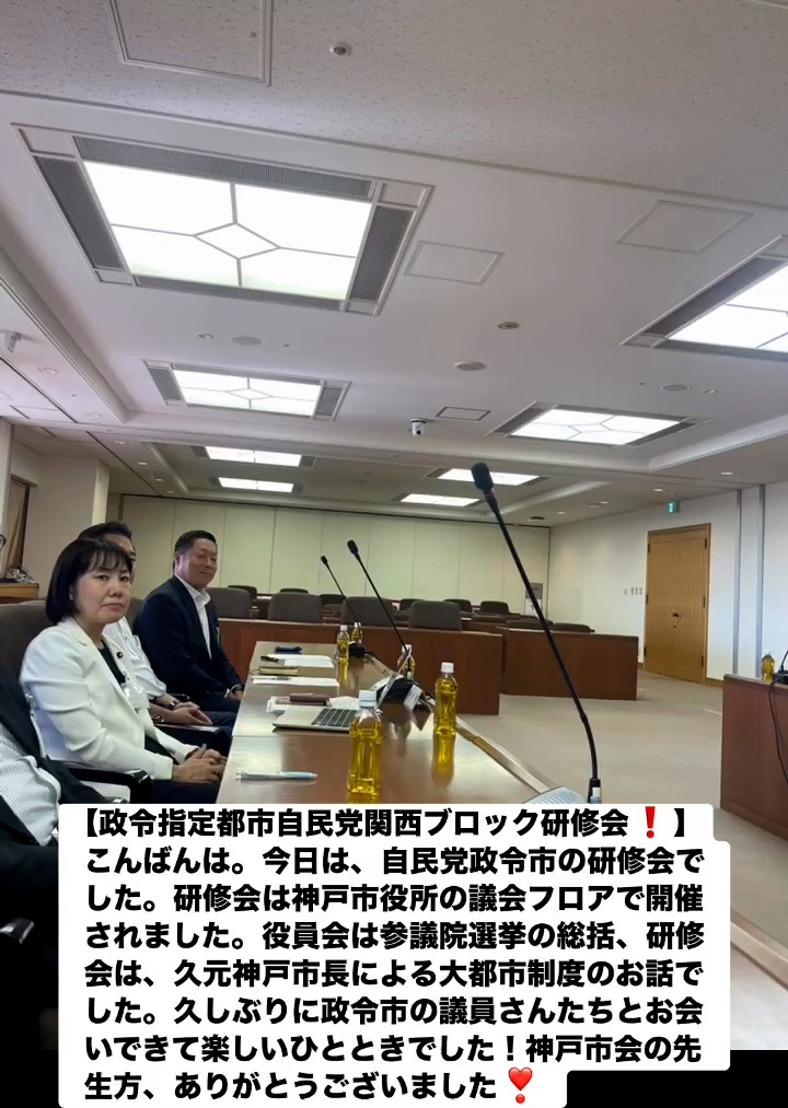 政令指定都市自民党関西ブロック研修会! 8月21日 Posted on 2025年8月21日 20:36:012025年9月9日 こんばんは。今日は、自民党政令市の研修会でした。 研修会は神戸市役所の議会フロアで開催されました。役員会は参議院選挙の総括、研修会は、久元神戸市長による大都市制度のお話でした。 久しぶりに政令市の議員さんたちとお会いできて楽しいひとときでした!神戸市会の先生方、ありがとうごさいました❣ のりこの活動日記, 自民党大阪