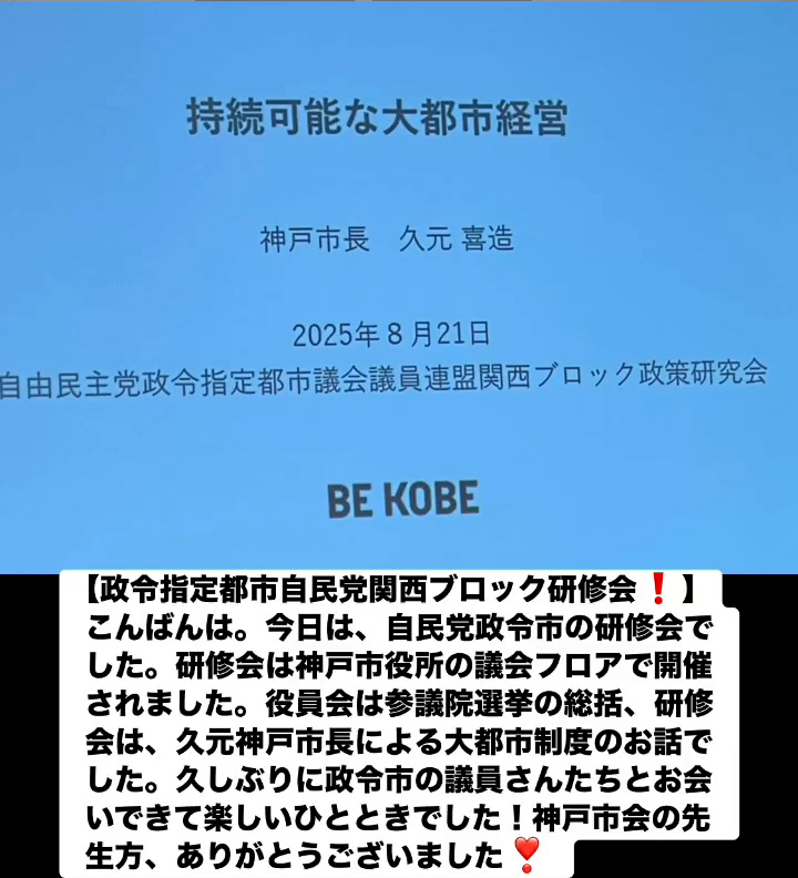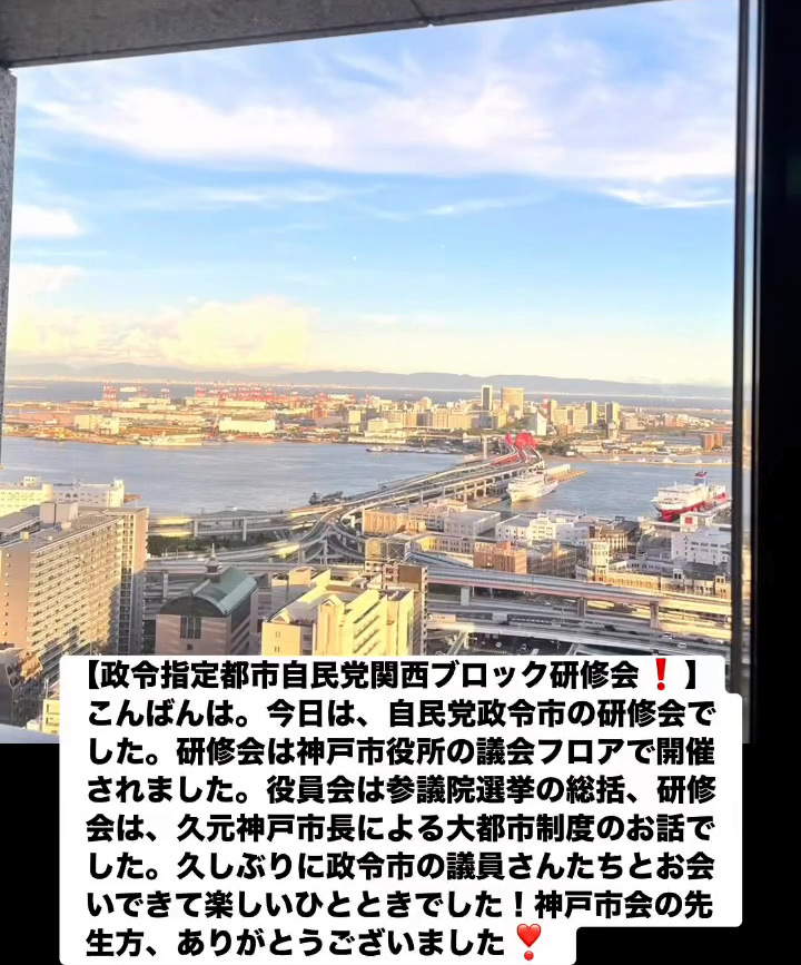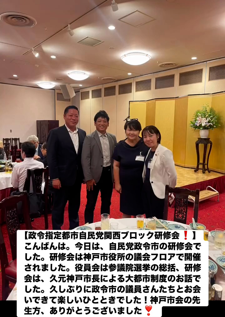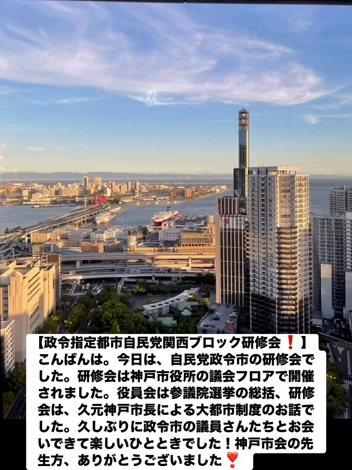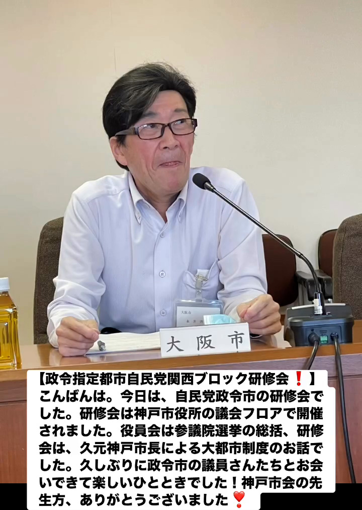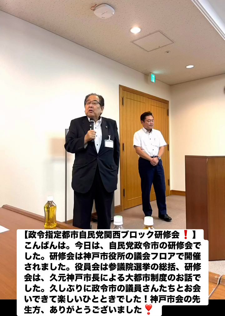 政令指定都市自民党関西ブロック研修会! 8月21日 Posted on 2025年8月21日 20:36:012025年9月9日 こんばんは。今日は、自民党政令市の研修会でした。 研修会は神戸市役所の議会フロアで開催されました。役員会は参議院選挙の総括、研修会は、久元神戸市長による大都市制度のお話でした。 久しぶりに政令市の議員さんたちとお会いできて楽しいひとときでした!神戸市会の先生方、ありがとうごさいました❣ のりこの活動日記, 自民党大阪