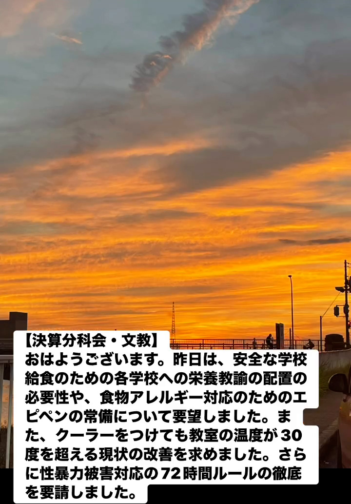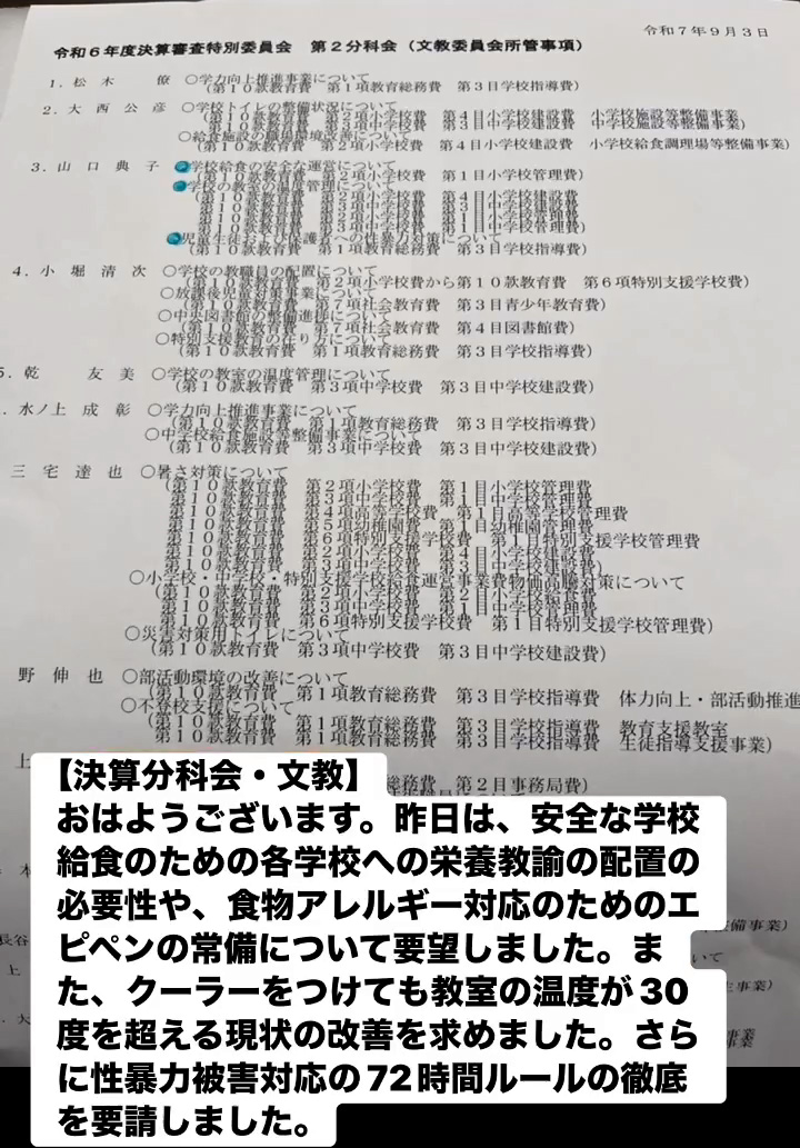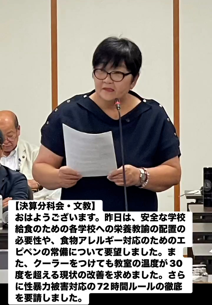 決算分科会・文教 9月4日 Posted on 2025年9月4日 08:36:012025年9月9日 おはようこざいます。昨日は、安全な学校給食のための各学校への栄養教諭の配置の必要性や、食物アレルギー対応のためのエピペンの常備について要望しました。また、クーラーをつけても教室の温度が30度を超える現状の改善を求めました。さらに性暴力被害対応の72時間ルールの徹底を要請しました。 のりこの活動日記, 議会報告