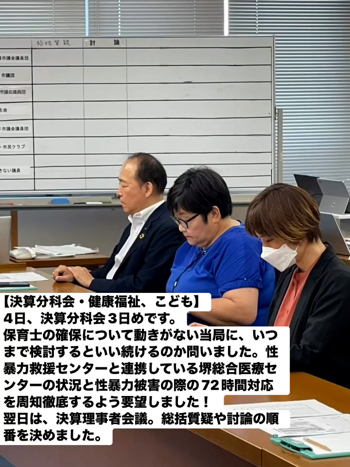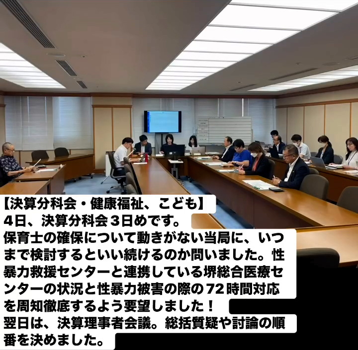 決算分科会・健順福祉、こども 9月6日 Posted on 2025年9月6日 09:38:012025年9月9日 4日、 決算分科会3日めです。保育士の確保について動きがない当局に、 いつまで検討するといい続けるのか問いました。 性暴力救援センターと運携している堺総合医療センターの状況と性暴力被害の際の72時間対応を周知徹底するよう要望しました!翌日は、 決算理事者会議。総括質疑や討論の順番を決めました。 のりこの活動日記, 議会報告