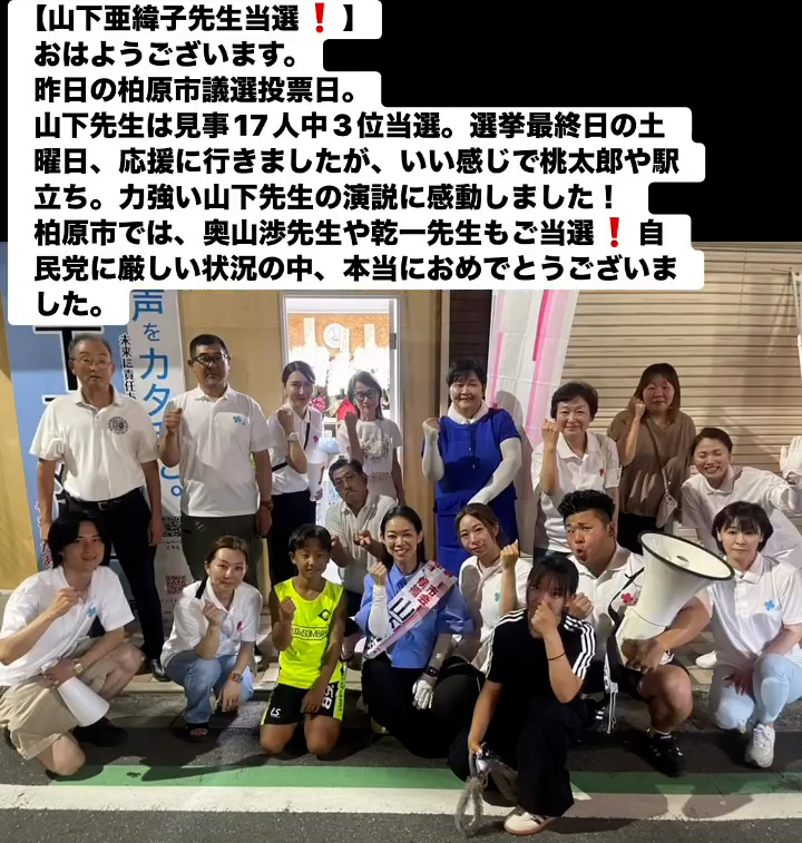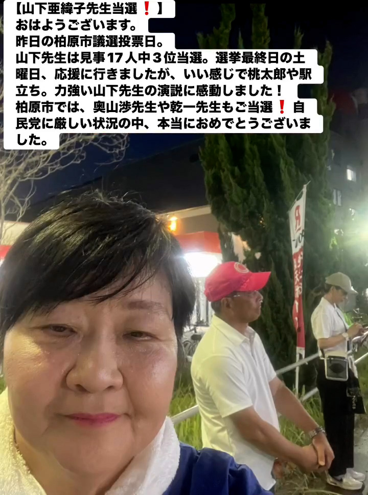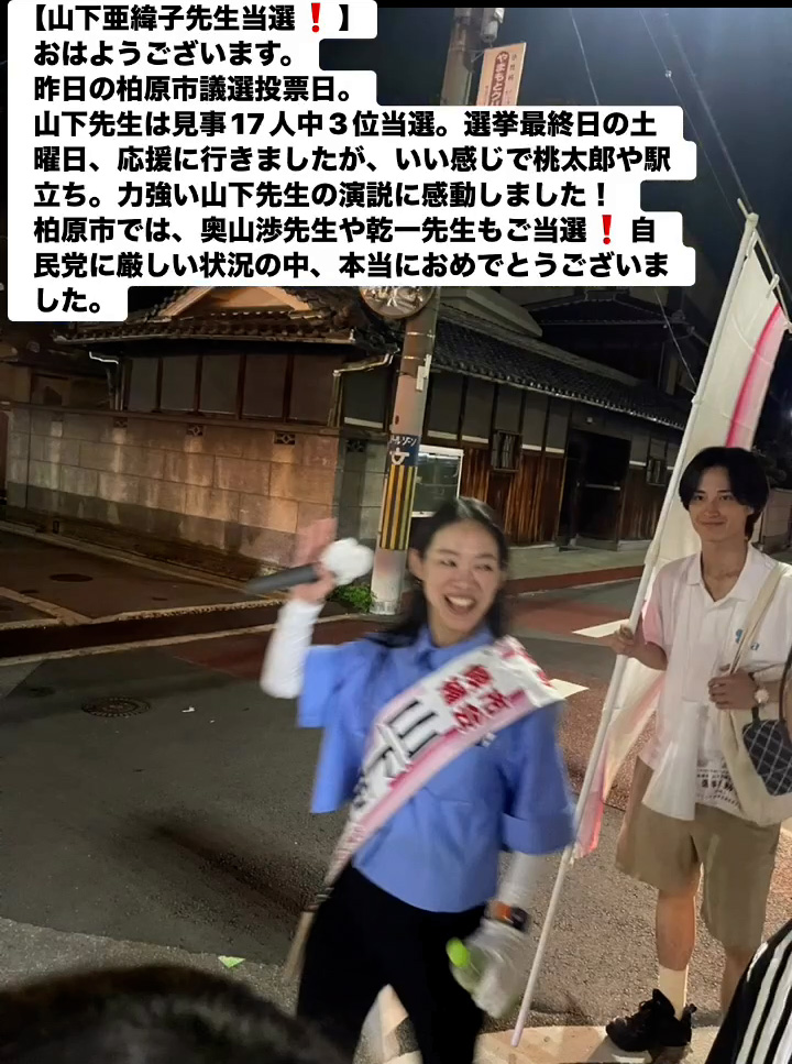 山下亜緯子先生当選! 9月8日 Posted on 2025年9月8日 09:55:012025年9月9日 おはようこざいます。 昨日の柏原市議選投票日。 山下先生は見事17人中3位当選。選拳最終日の土曜日、応援に行きましたが、いい感じで桃太郎や駅立ち。力強い山下先生の演説に感動しました! 柏原市では、奥山渉先生や乾ー先生もご当選❢自民党に厳しい状況の中、本当におめでとうこざいました。 のりこの活動日記, 自民党大阪