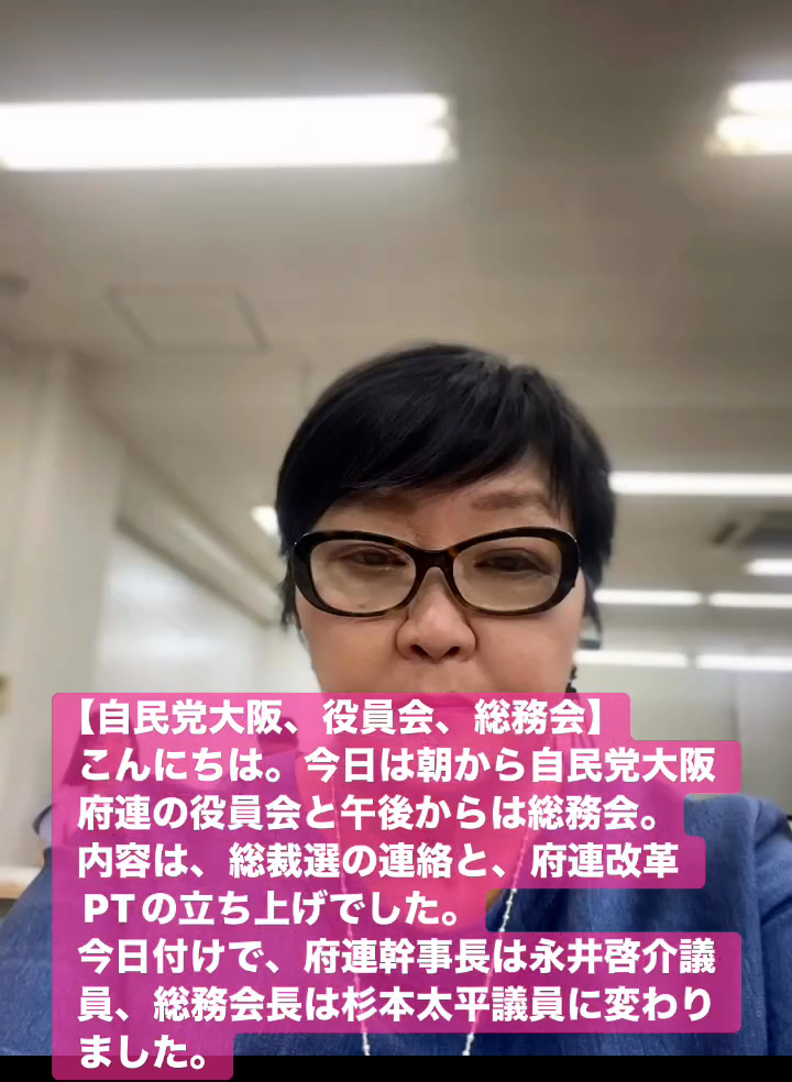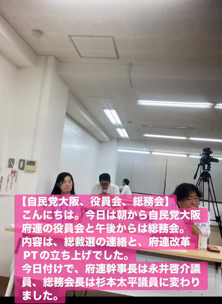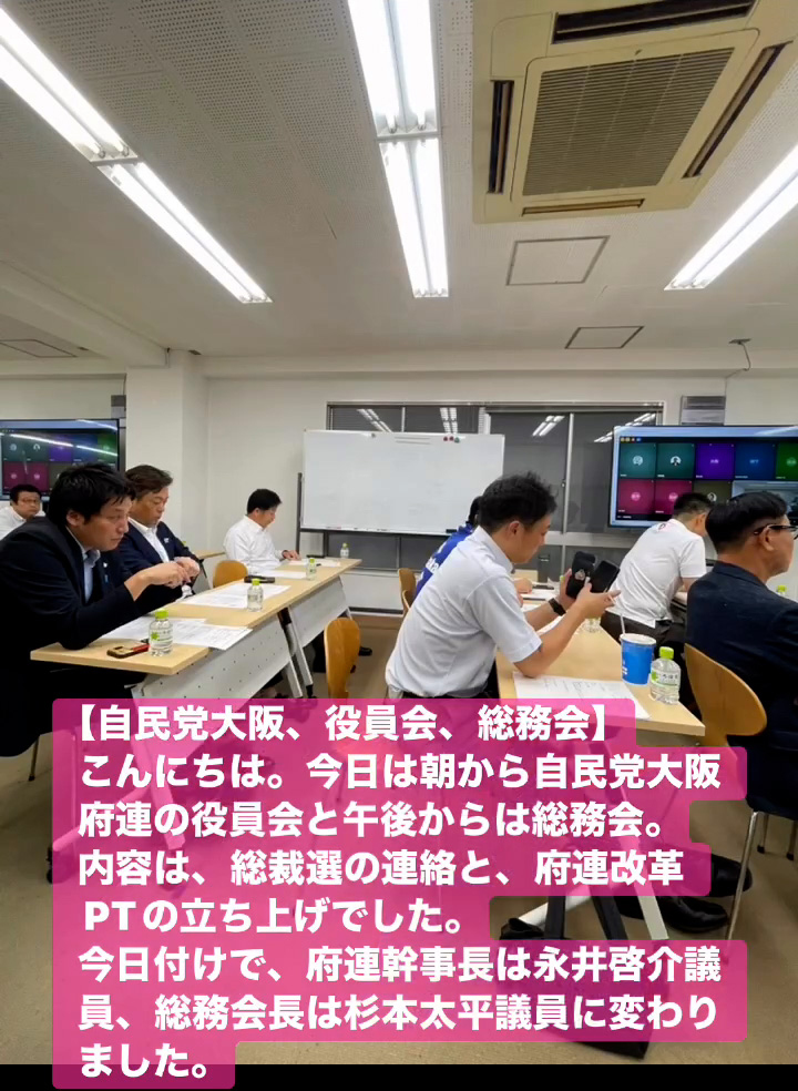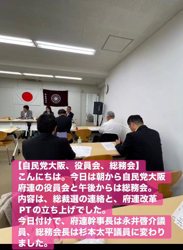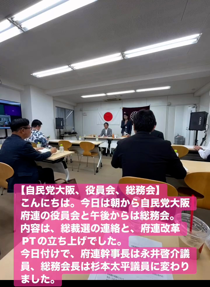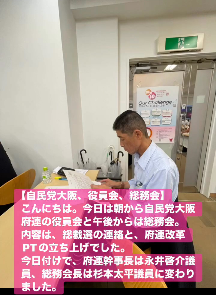 こんにちは。今日は朝から自民党大阪府連の役員会と午後からは総務会。内容は、総裁選の連絡と、府連改革PTの立ち上けでした。