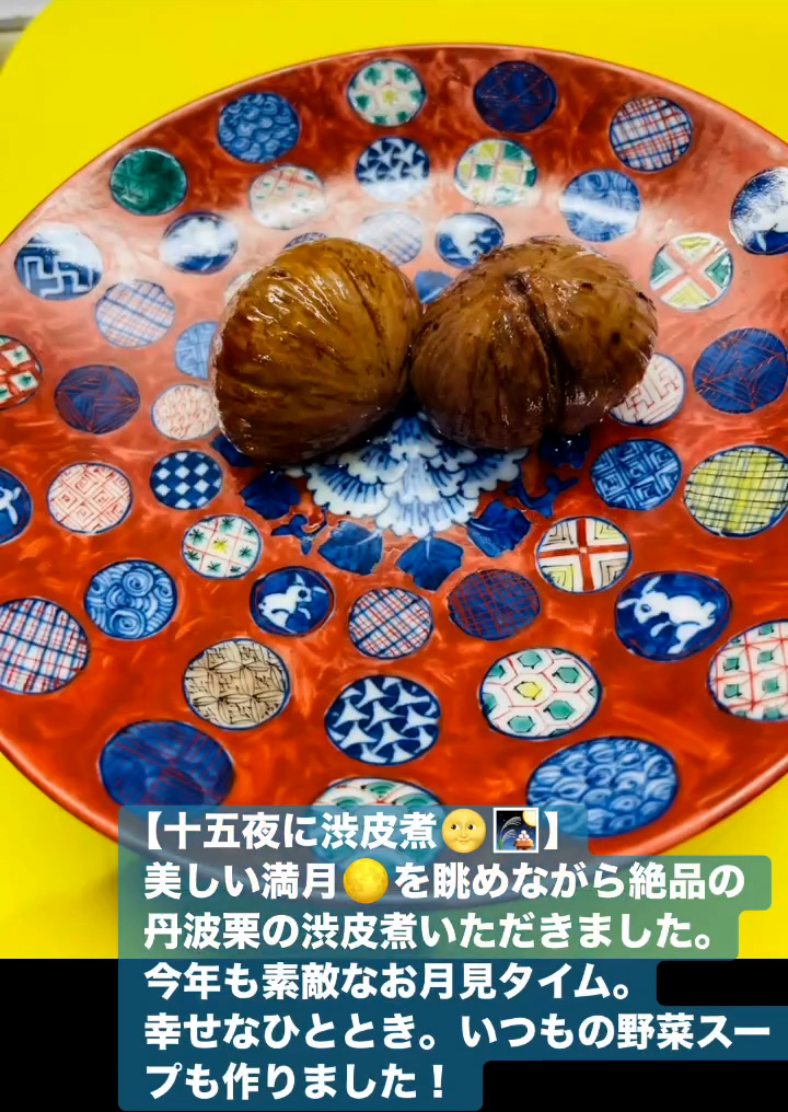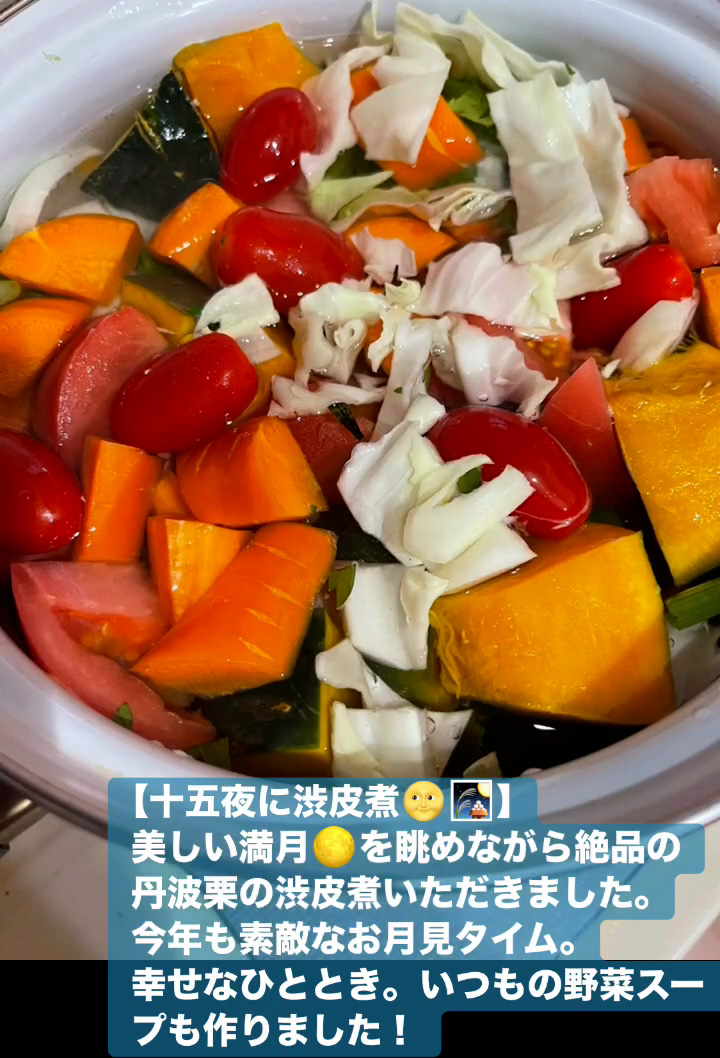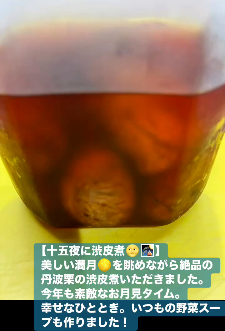 十五夜に渋皮煮 10月8日 Posted on 2025年10月8日 14:43:012025年10月9日 美しい満月🌕️を眺めながら絶品の丹波栗の渋皮煮いただきました。今年も素敵なお月見タイム。 幸せなひととき。いつもの野菜スープも作りました! のりこの活動日記, のりこの部屋