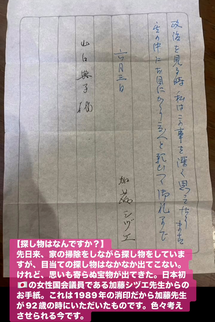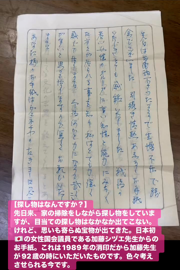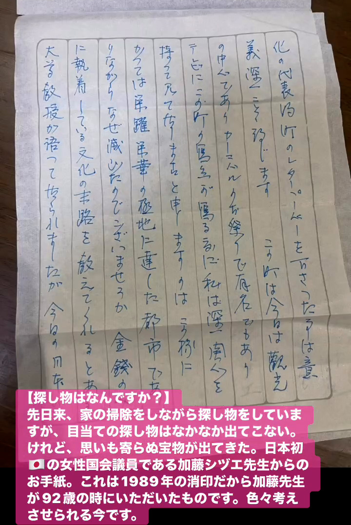 探し物はなんですか? 10月17日 Posted on 2025年10月17日 10:29:022025年10月20日 先日来、家の掃除をしながら探し物をしていますが、目当ての探し物はなかなか出てこない。けれど、思いも寄らぬ宝物が出てきた。日本🇯🇵初の女性国会議員である加藤シヅエ先生からのお手紙。これは1989年の消印だから加藤先生が92歳の時にいただいたものです。色々考えさせられる今です。 のりこの活動日記, のりこの部屋