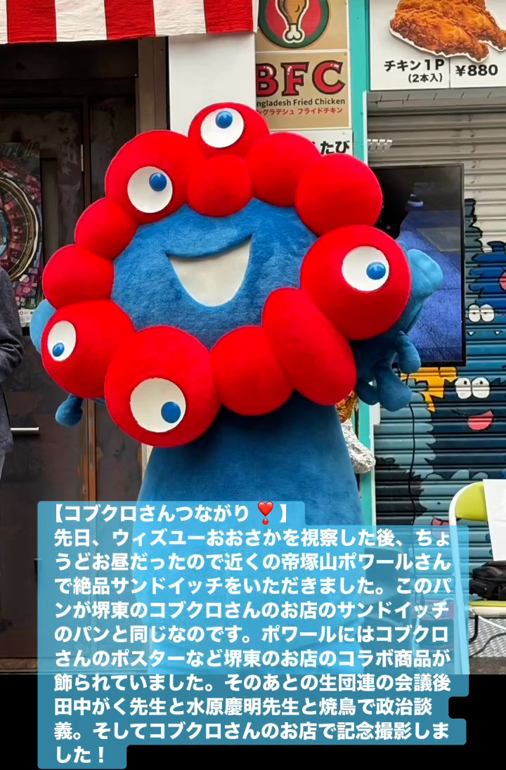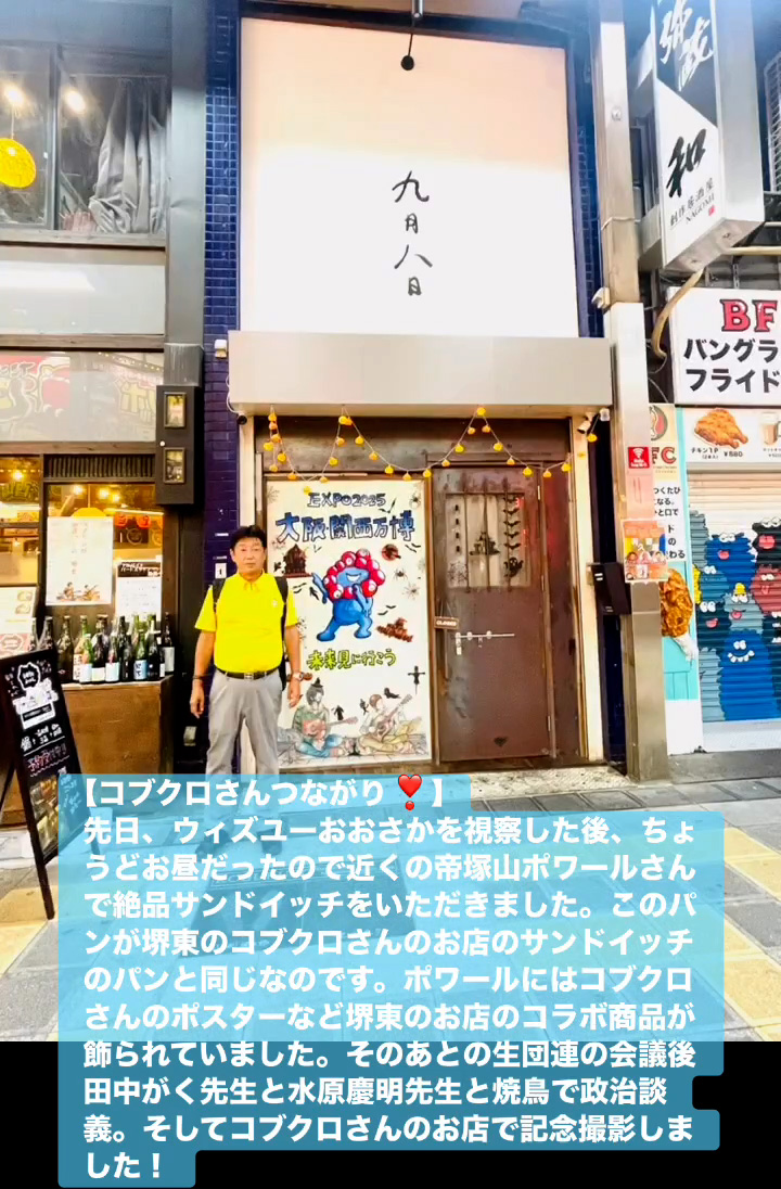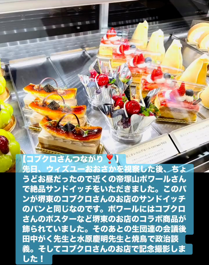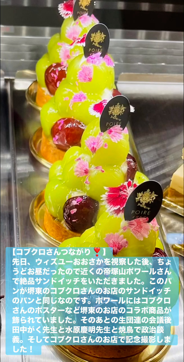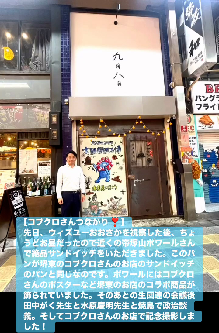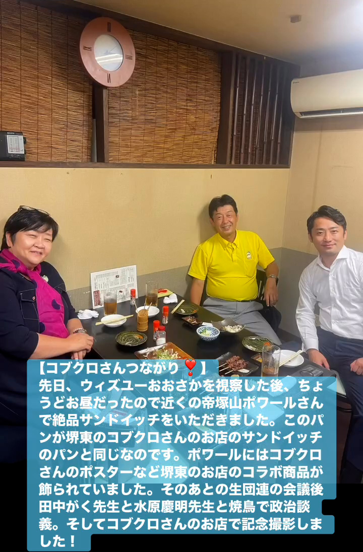 先日、ウィズユーおおさかを視察した後、ちょうどお昼だったので近くの帝塚山ポワールさんで絶品サンドイッチをいただきました。このパンが堺東のコブクロさんのお店のサンドイッチのパンと同じなのです。ポワールにはコブクロさんのポスターなど堺東のお店のコラボ商品が飾られていました。そのあとの生団運の会議後 田中がく先生と水原慶明先生と焼鳥で政治談義。そしてコブクロさんのお店で記念撮影しました!